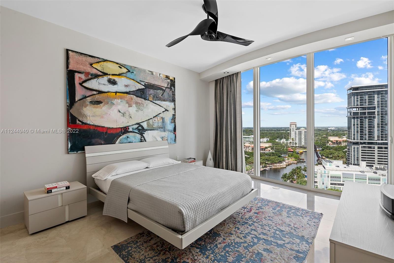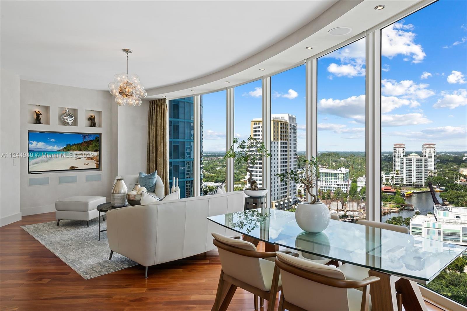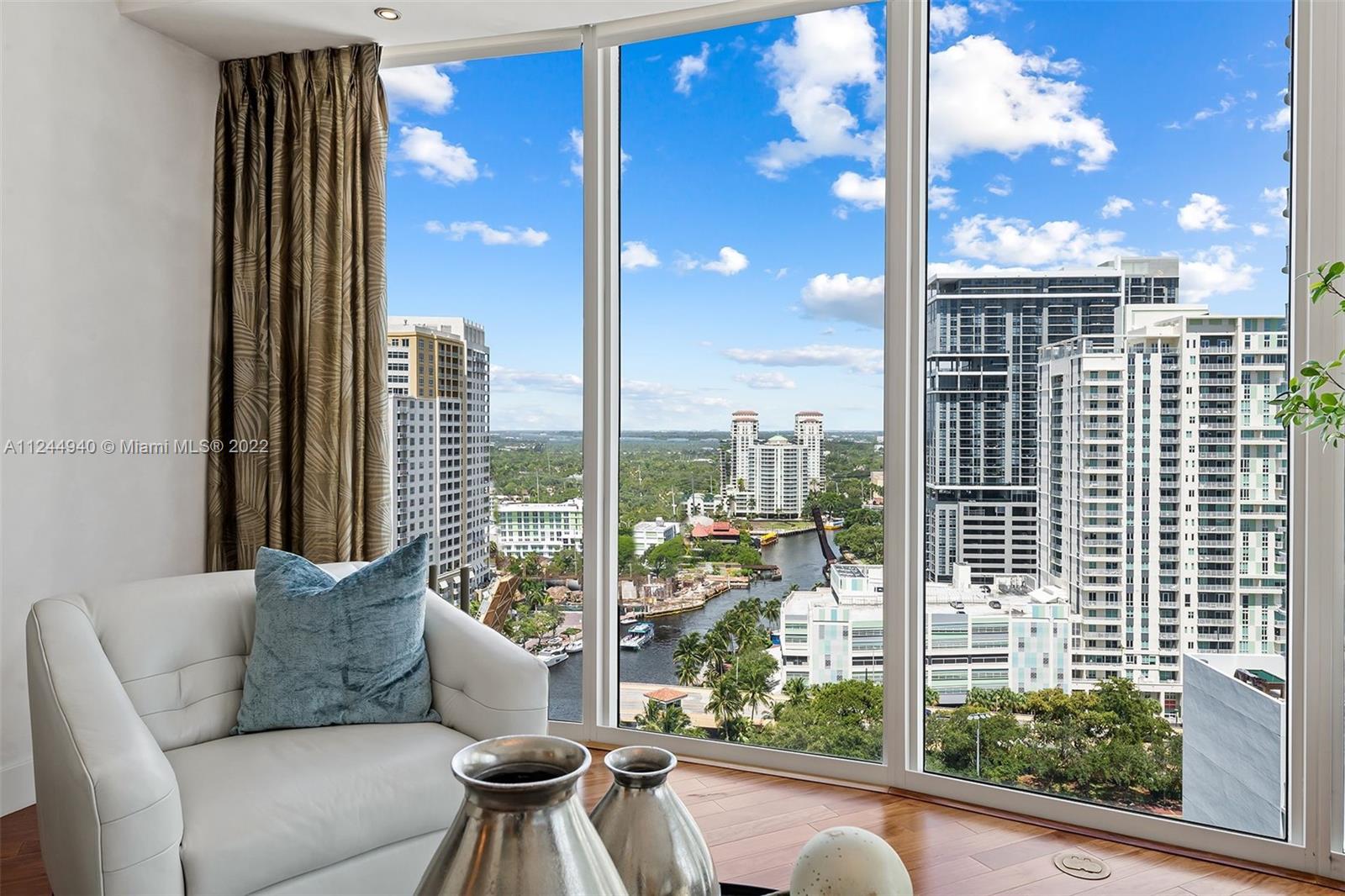 Welcome to your perfect urban riverfront home in Ft Lauderdale's landmark tower, Las Olas River House. Located on the New River in the heart of downtown & famous Las Olas Blvd. This very special 2/2.5 offers huge views from every room showcasing the vibrant New River, Riverwalk, tropical pool deck, city park and skyline. Round radius floor to ceiling glass + large balcony makes this lovely condo a very unique. Elevators sweep you to semi-private foyer. Enjoy River House's 5 star lifestyle offering 24 hr valet, concierge, grand lobby with Koi pond, world class fitness center, & resort style pool deck. 4M lobby renovation now complete by Steven G. New Hyatt Hotel, Eddie V's & Greenwise Grocery just steps away. Pinnacle dynamic urban life + the very best location! Livingroom fixture excluded.