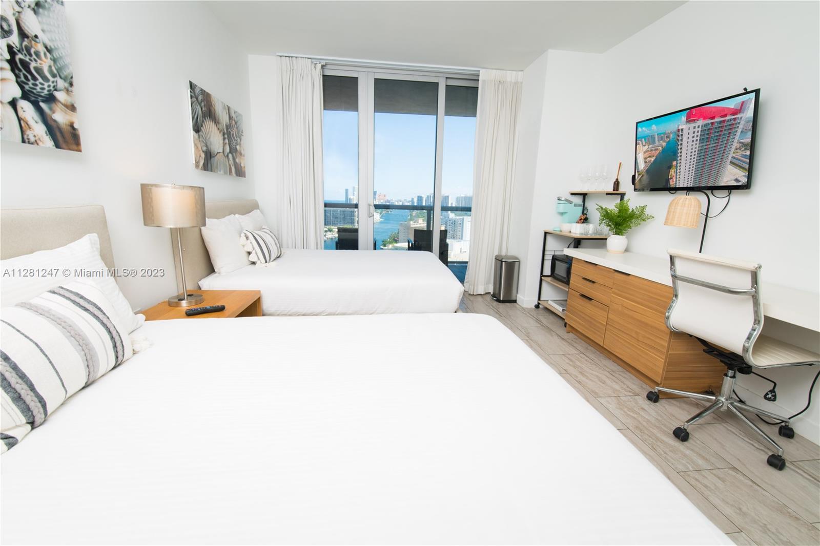 Surreal SOUTH views to the Intracoastal w/ views of the ocean & bay. Views of Sunny Isles skyline from balcony. This turnkey unit is located at the Beachwalk Resort. The 2bd 2bath is fully furnished & features vinyl flooring throughout unit , floor to ceiling windows, open kitchen, & 200 sq ft balcony accessible via the Master bedroom, living room, & guest bedroom. Building amenities include a private rooftop for owners only, garage parking, complimentary shuttle to the beach, pool, fitness center, & restaurant w/ intracoastal views. The unit can be rented daily via Airbnb/VRBO/Booking w/ no rental restrictions. The 2 bd has 2 separate entrances; 1 to side A (1 bed /1 bath apartment w/ balcony) & 1 to side B (studio suite w/ private balcony). The unit can be rented together or individually
