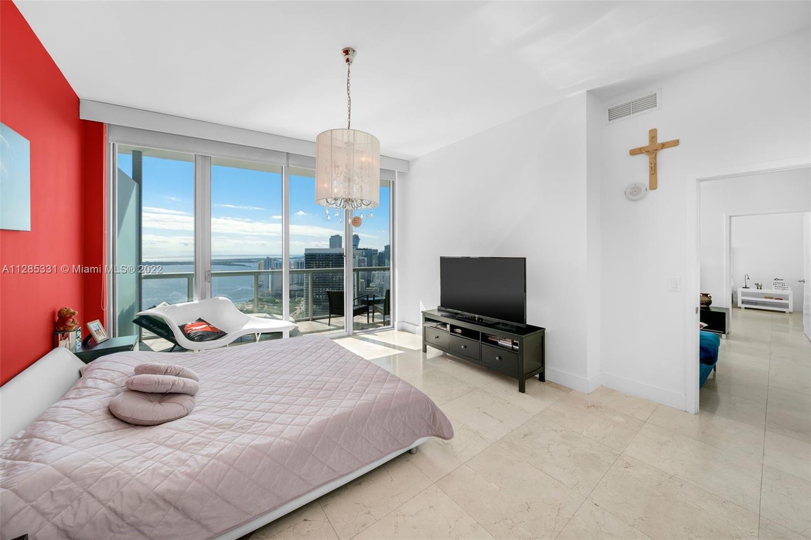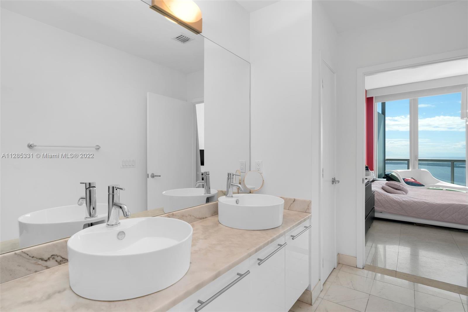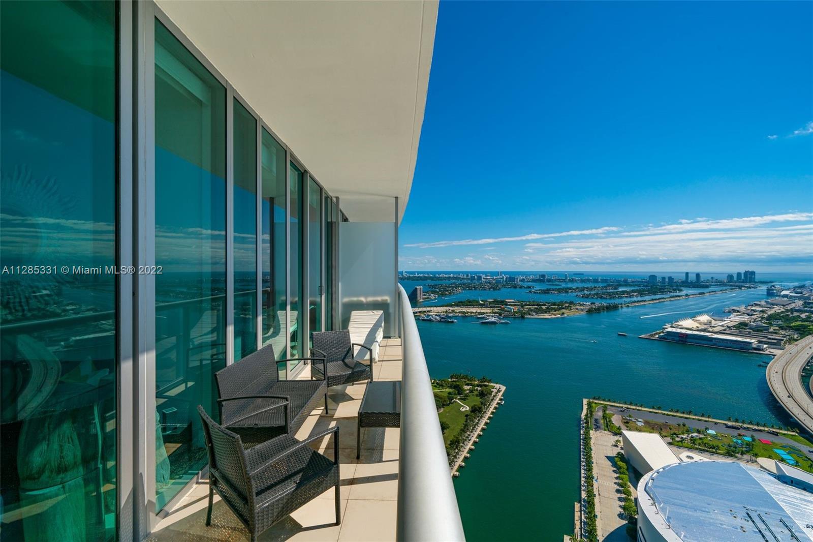 A magnificent, split 2-bedroom residence at MarinaBlue w/ 2.5 baths; marble flooring throughout; motorized shades; large, custom-built closets in both bedrooms; brand new air conditioning unit; stainless steel kitchen appliances; & 10-foot-high ceilings w/ floor-to-ceiling glass windows offering awe-inspiring, panoramic views of the Atlantic Ocean, Biscayne Bay, & Downtown Miami skyline from the 55th floor. Very unique floor plan; only 5 of its kind in the entire building. Both bedrooms have balcony access & direct water views. Includes 1 assigned parking space & 1 assigned storage cage. Building amenities include 2 swimming pools (sunrise & sunset), whirlpool hot tub, fitness center, business center w/ conference room, 24-hour valet parking, sand volleyball court, party room & BBQ grills.