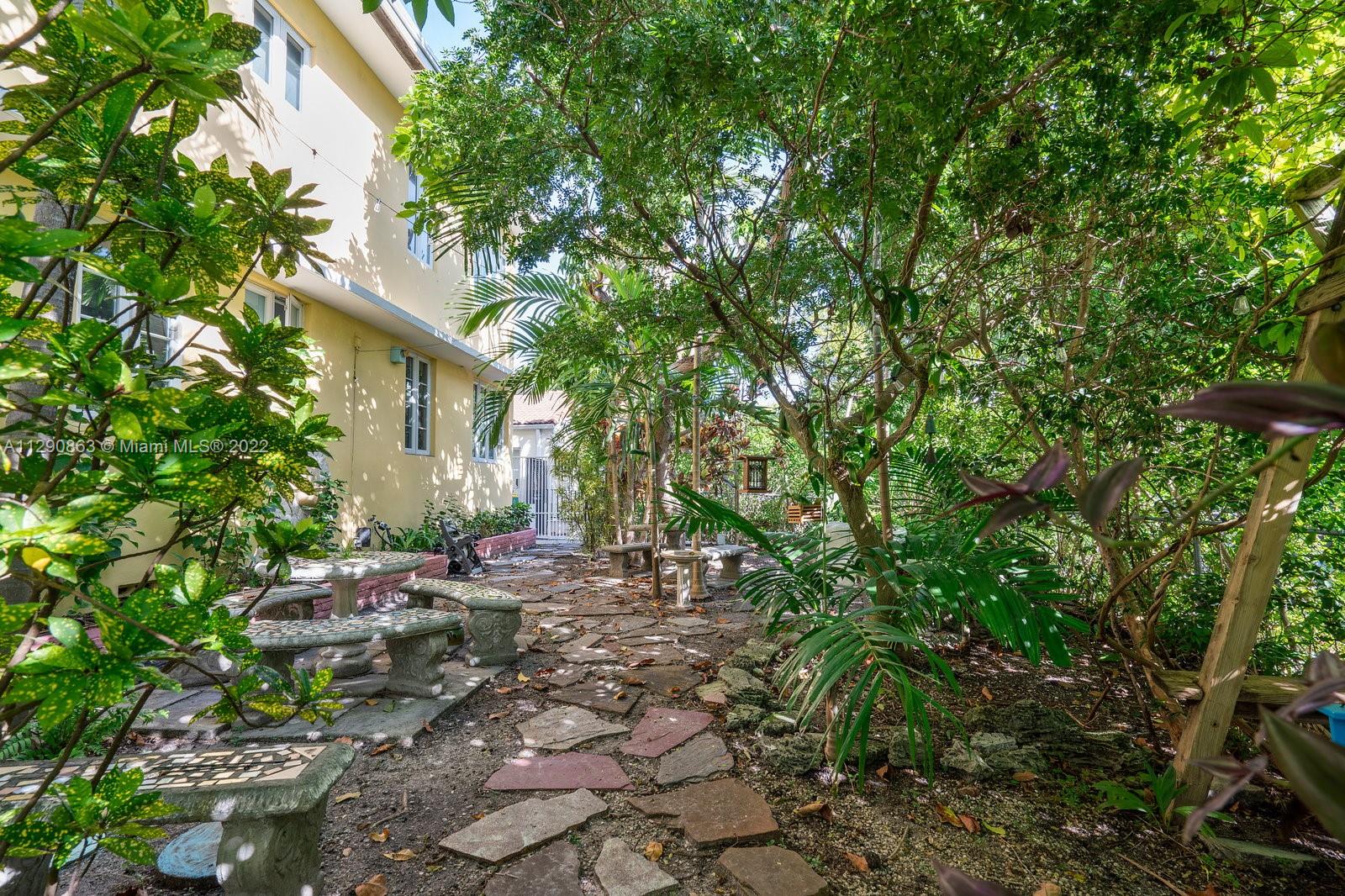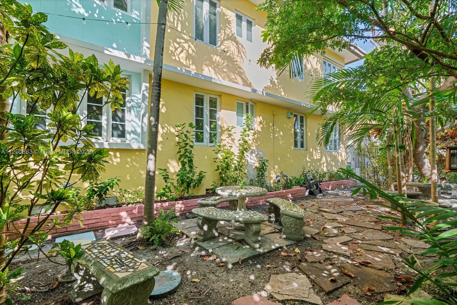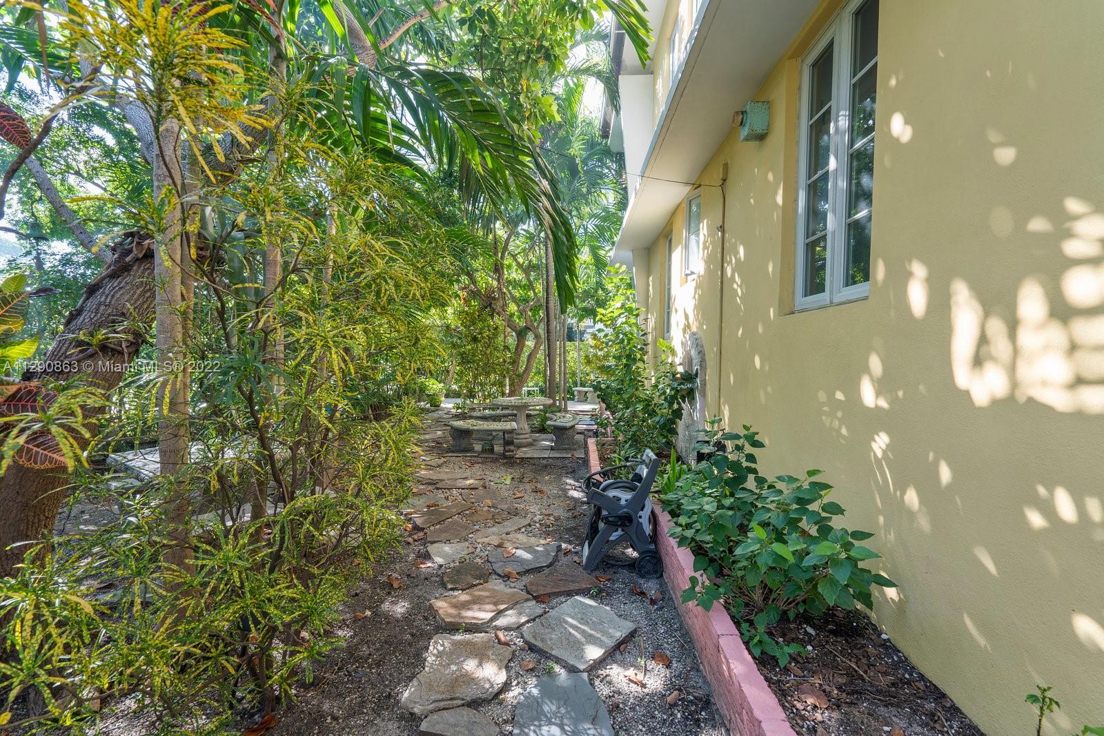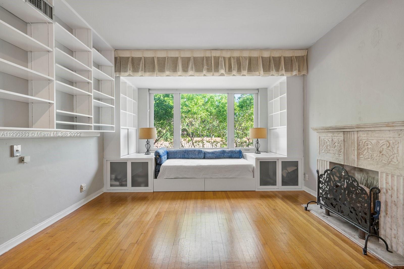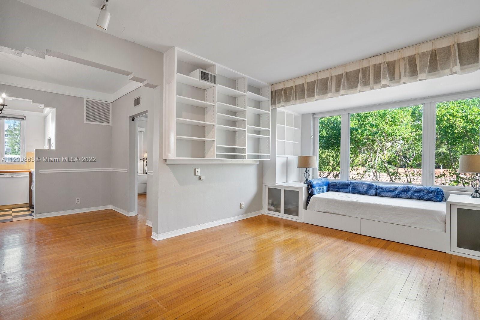 This mid-century deco building set back in lush, private garden was built by H.L Glasser. This charming spacious unit has treehouse views facing north and east, lots of natural light, 9 ft ceilings, red oak floors, gas fireplace & stove, 2 window side daybeds with one that pulls out into a queen bed, custom storage, built in bookcases & hurricane impact windows. This historic Art Deco building has 6 units and is well maintained by long term owners. Relax in the flourishing garden with BBQ-area. Building has a shared W/D plus W/D hook-up in the unit. A quiet neighborhood with just a short walk to Target, Publix and Whole Foods, Baptist Hospital’s Urgent Care Center and Archetectoninica’s new Canopy Park, 8 minute walk to the Beach & 15 minute walk to Lincoln Road.