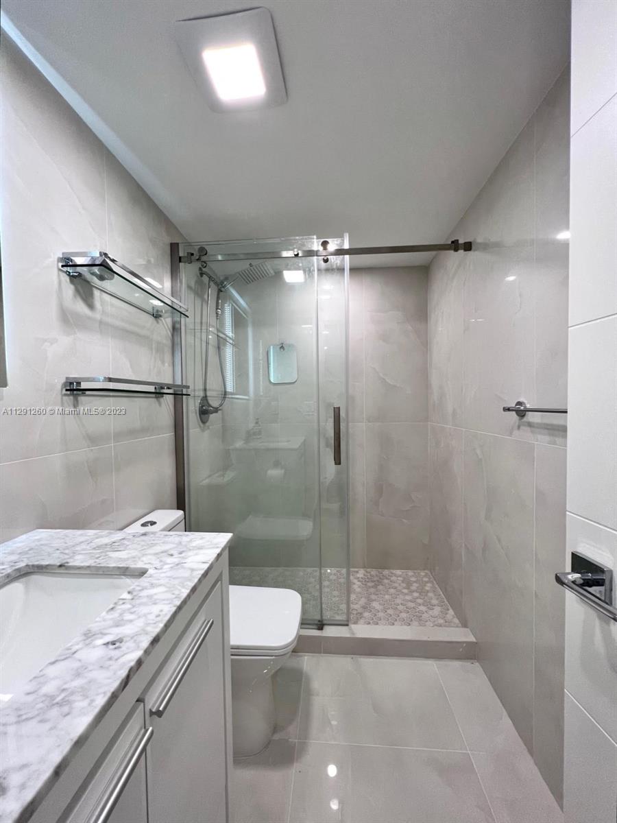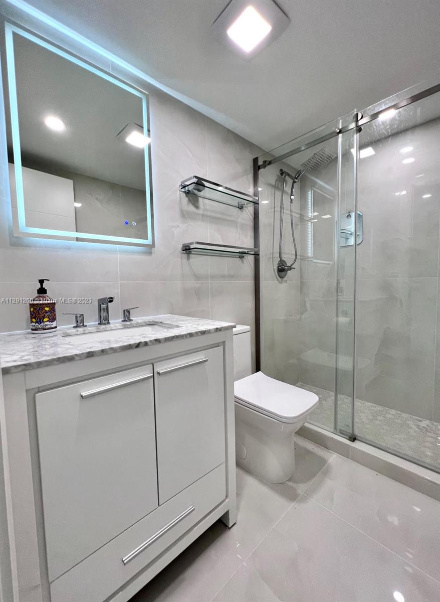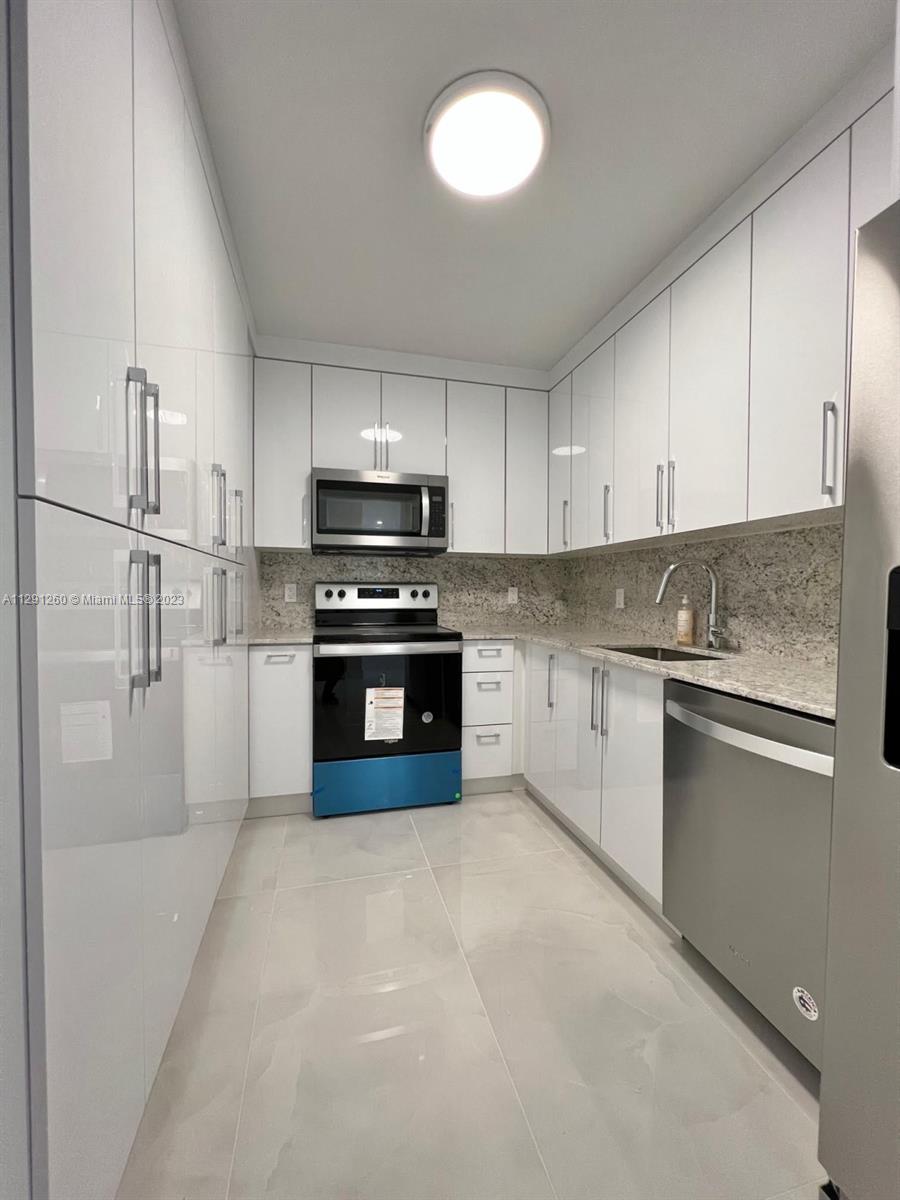 Completely remodeled unit. Rectified tiled floors throughout, Tiled shower and bathroom. Brand new European kitchen with granite countertops. Larger walk-in closet. New doors. Recessed lights thought the apartment. Brand new large refrigerator. Brand new appliances. Hurricane impact windows.