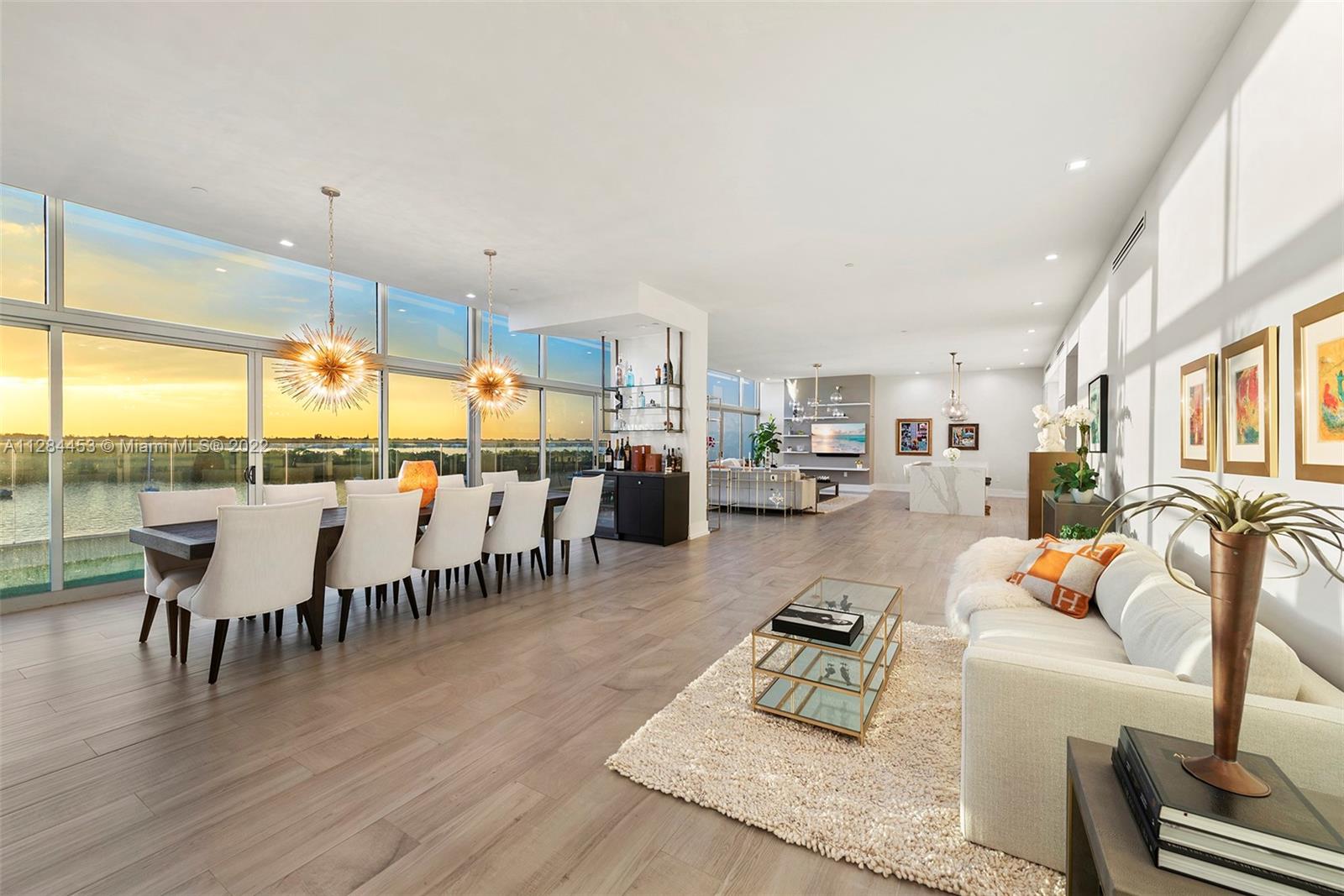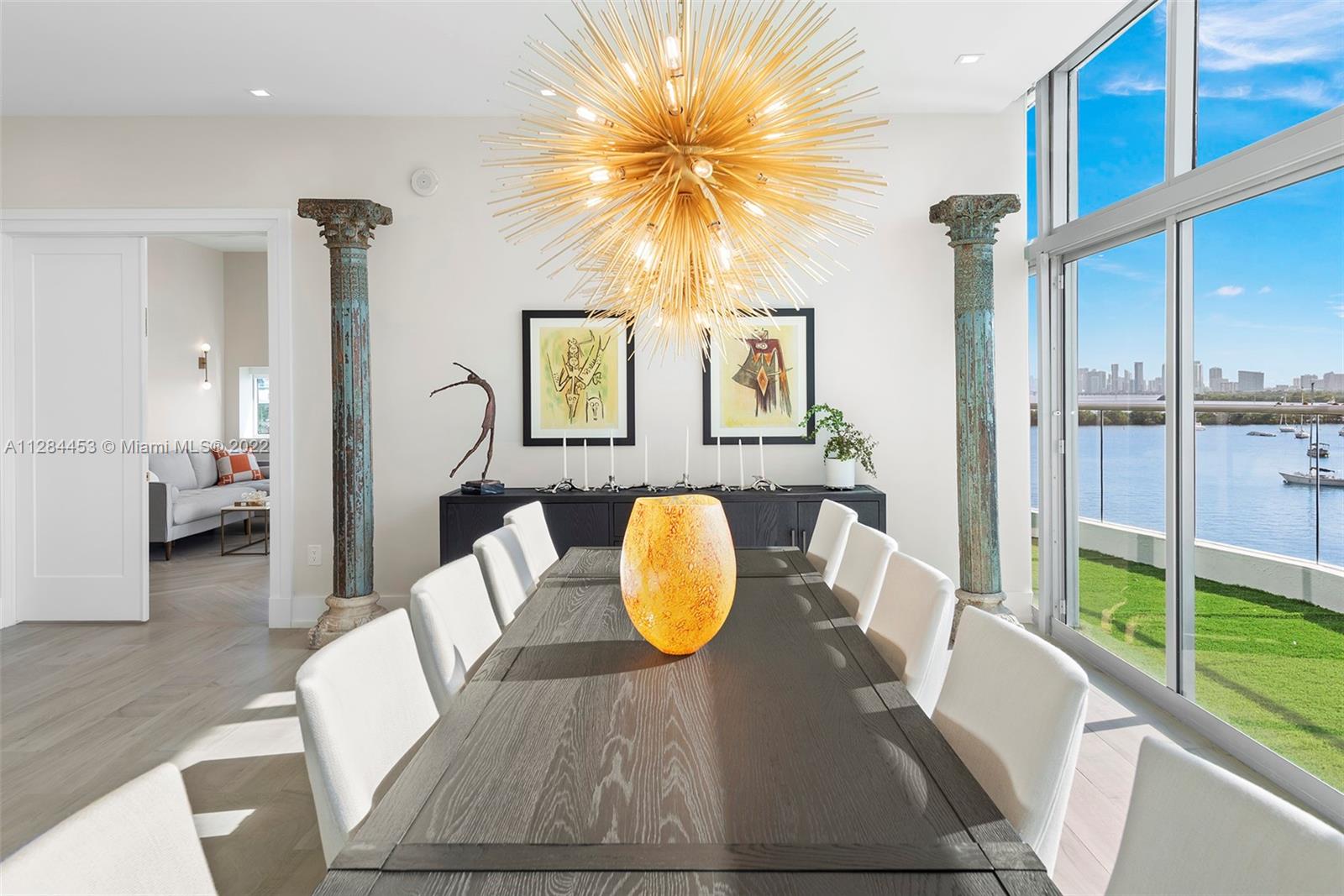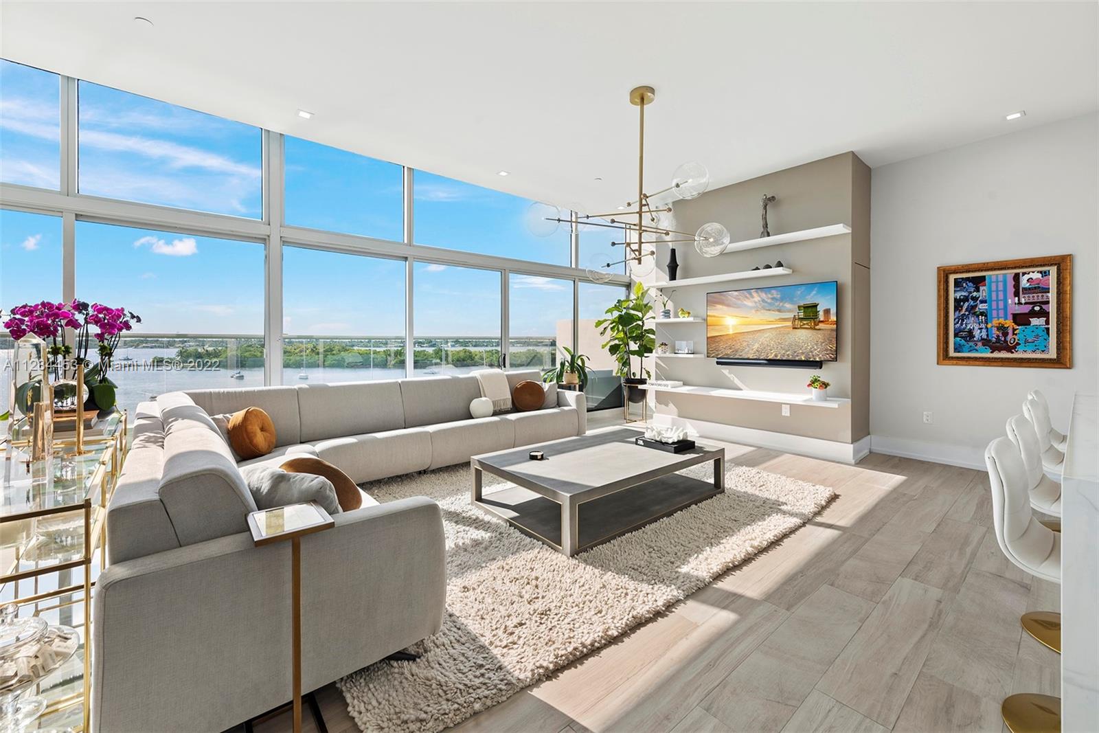 Rarely available, 4/3.5 corner, double-unit of 3,721 sq ft with amazing panoramic waterfront views in the idyllic islands of North Bay Village. Unit boasts open floor plan, with floor-to-ceiling and wall-to-wall impact glass windows and doors leading to an additional 350 sq ft of balcony overlooking the water. Impeccably and elegantly designed; no expense was spared. Features: large bedrooms (three en-suite) solid interior 8-ft doors, Miele and Wolf appliances, 10' kitchen island and high end lighting throughout. Building amenities include 24-hour security entrance, gated parking, private waterfront boardwalk with BBQ area, lush rooftop heated pool, and well-equipped fitness center. Four parking spaces, big dogs welcome. This peaceful waterfront home enjoys amazing sunsets.