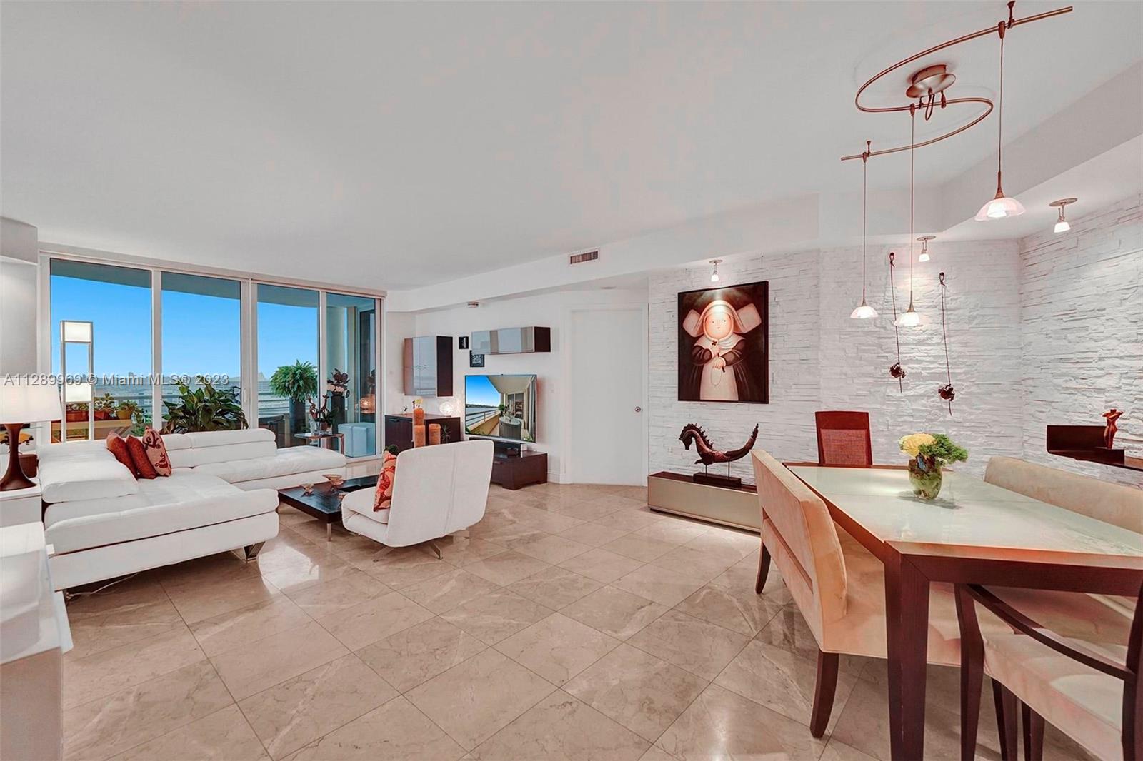 Experience beauty, comfort and breathtaking views in this unit overlooking the Biscayne Bay, the Miami River and the Ocean. Live in the heart of the modern and vibrant Business district, with the privacy, glamour and lifestyle of a tropical island. Move right in and enjoy the modern, yet timeless Italian décor, complete with a brand new kitchen and appliances, renovated bedroom and remodeled Electric blinds, white wood floors and marble floors add elegance to the living and dining areas. Additional guest/studi room with private full bath and walking closet. New A/ First class amenities await you in this remarkable property. Furniture could be included. Don'tiss out this opportunity. Note : 2nd Bedroom is a DEN..For more details please see virtual tour!!