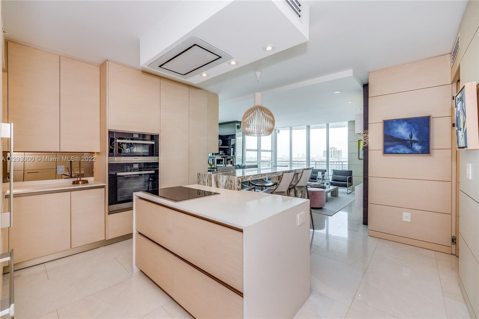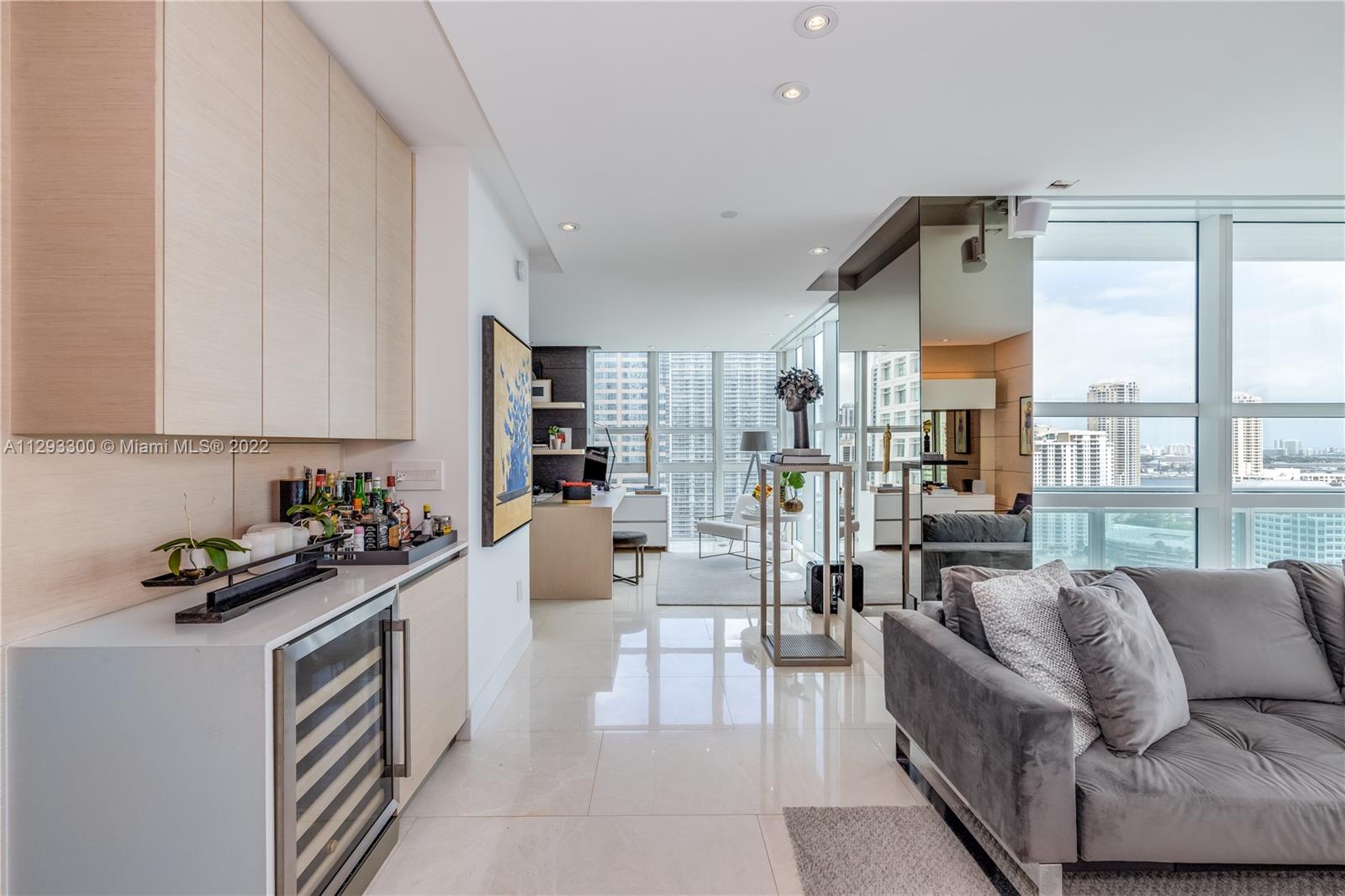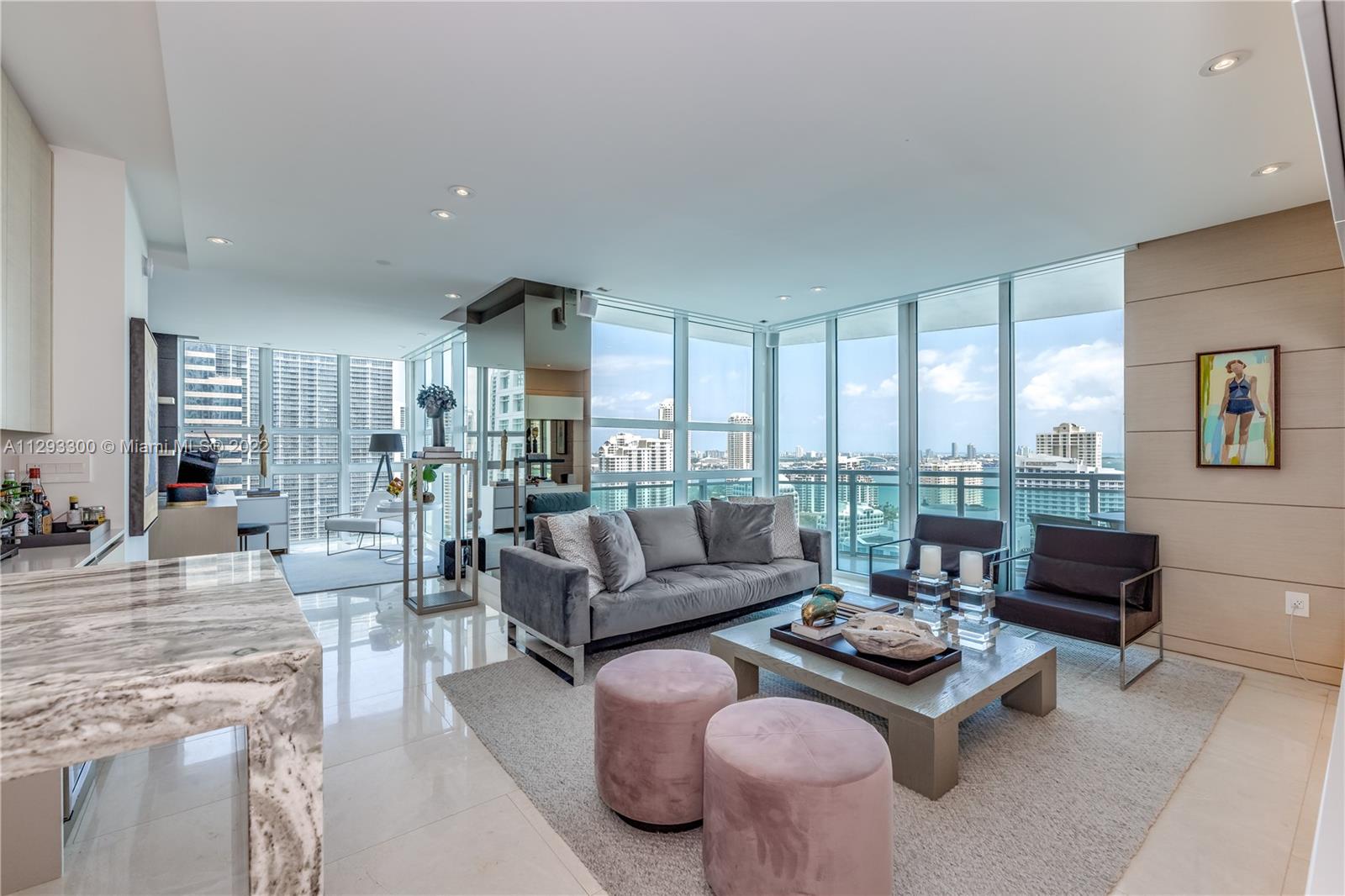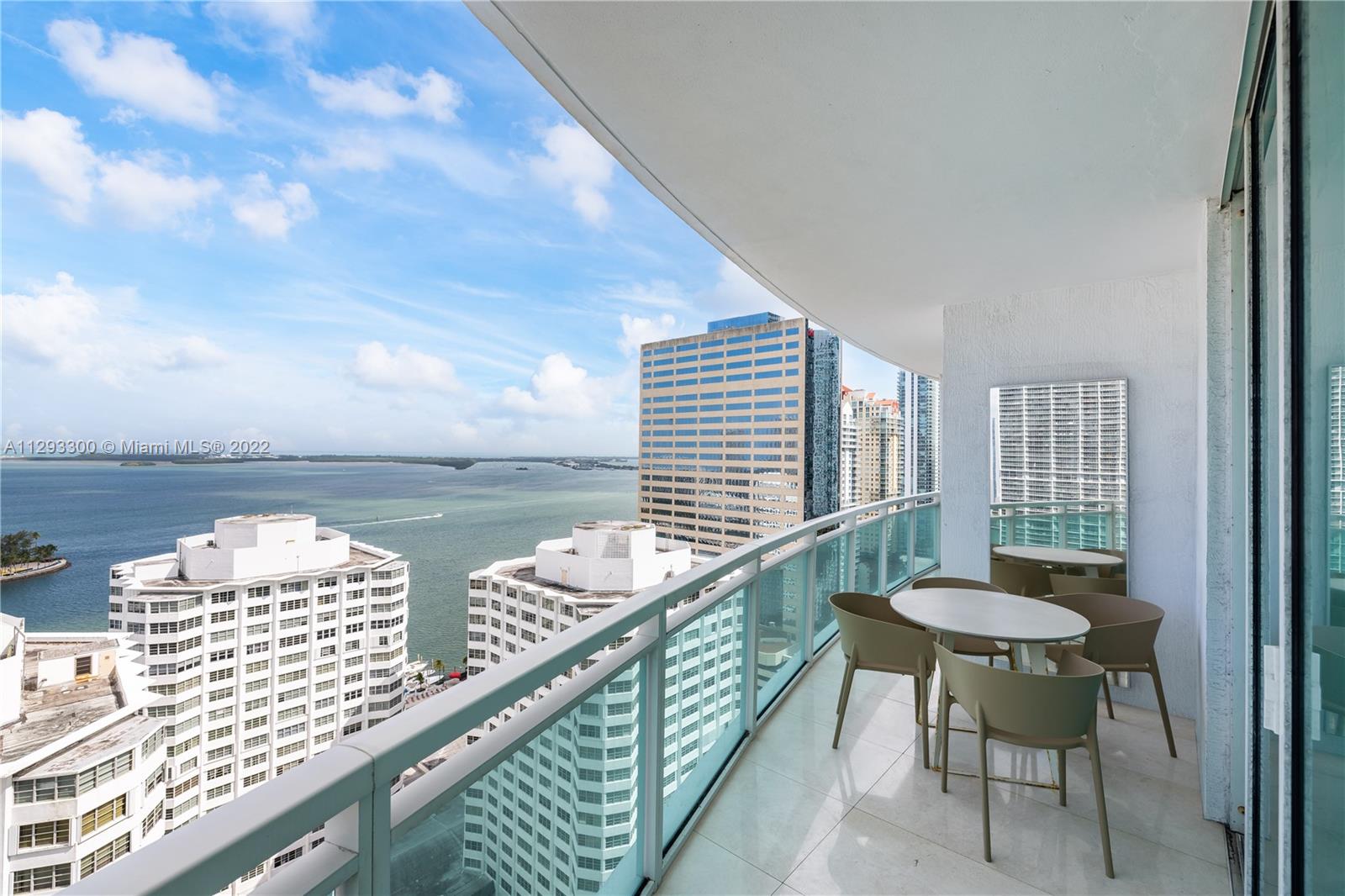 Spectacular panoramic views of Biscayne Bay. Designer remodeled and designer furnished - top-of-the-line appliances, marble floors throughout, European kitchen with built-in dining table, eletric shades & blinds. Second bedroom is used as an office with convenient Murphy bed. Enjoy coffee on your oversize terrace overlooking Key Biscayne, Brickell Key and Miami Beach. Amenties include gym, pool area, theater, party room, office center & valet parking. Centrally located to all Brickell has to offer. Walk everywhere on Brickell. Unit currently rented furnished for $6,500 a month until May 2023. Furniture is negotiable. Please use ShowingTime, text or call listing agent for showings.
