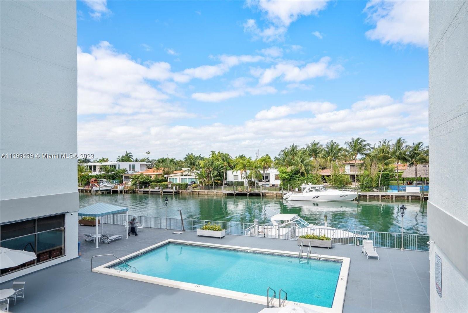 Largest 2bed/2Bths in the building. Amazing views of waterfront million dollar homes below & the bay from the large terrace. Living/dining room opens to a balcony overlooking the canal. Unit comes with 2 underground parking spaces & 1 large storage. Oversized pool deck. Other amenities include a fitness room, sauna, party room, ping pong tables, billiard, library, bike storage and a doorman. "A" rated public schools. Walking distance to the beach & Bal Harbour shops. Pet friendly. No lease first year of ownership. Needs a bit update. There is a $1,235.20 quarterly Special Assessment - started Jan 1, 2019 and ends Oct. 2025.