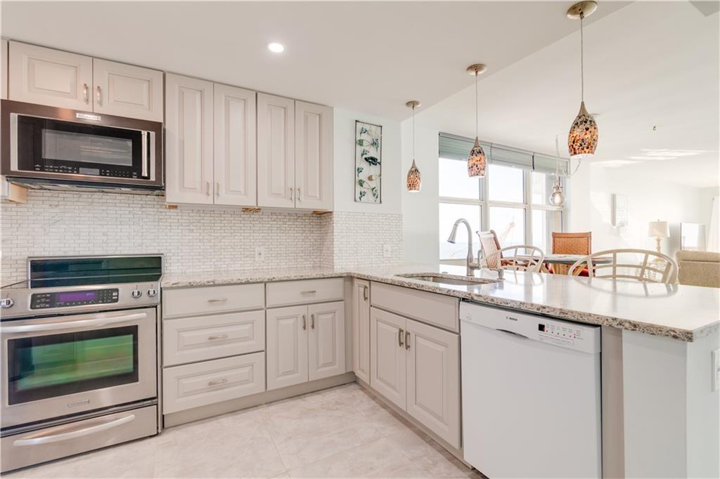 Rarely available direct oceanfront corner unit has been stylishly updated in a cool coastal style that is very inviting. This beautiful spacious condo with compelling views of the golden sand beaches and the blue waters of the Atlantic Ocean from the wrap-around balcony is ready for you. The recently remodeled eat-in kitchen features quartz counter tops, ss appliances, open space for entertaining. The bathrooms are remodeled and offer refined styling. Washer and Dryer in the unit. This 55+ building is conveniently located near shops and restaurants, offers guarded lobby entrance, beachfront pool deck, fitness room, community room, beach side bbq grill and tables. This unit comes with a garage covered parking space. Call today!