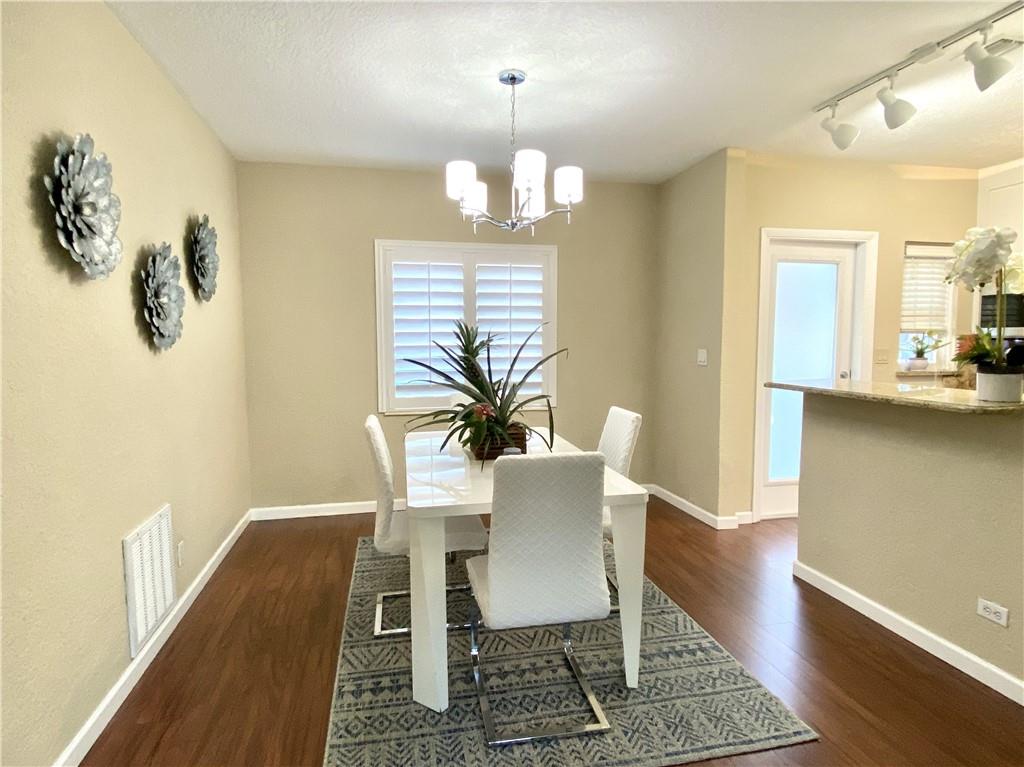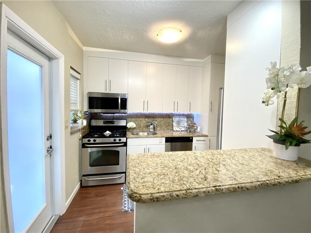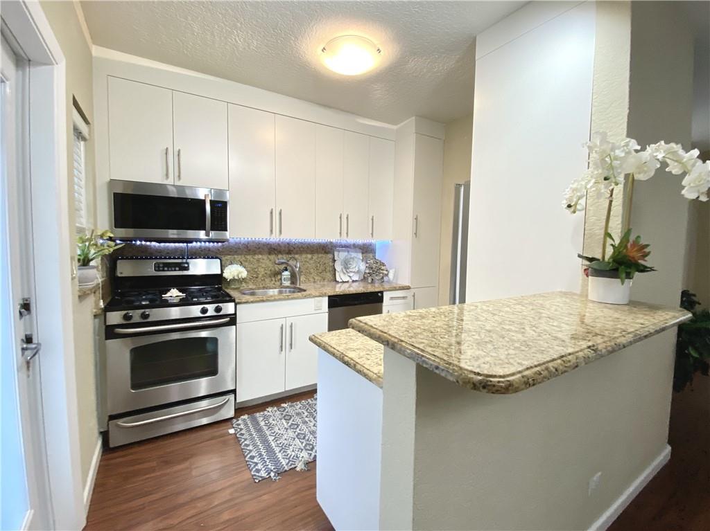 Bright and updated 2 bedroom garden condo situated in a very quaint and private community in the heart of Victoria Park. Condos in this boutique community rarely come up for sale. Foyer entry, spacious living & dining area with an open floor plan-wood look flooring, plantation shutters. Upgraded kitchen with breakfast bar, newer solid wood custom cabinets, granite counter tops, stainless appliances and natural gas cooking. One full bathroom with combination tub/shower, storage closet with private laundry connection. Lushly landscaped grounds with courtyard plus community pool & laundry facilities. One assigned parking space outside kitchen door. Low monthly maintenance of $370 includes water, sewer, garbage and natural gas. Very Pet friendly community and condos can be rented immediately.