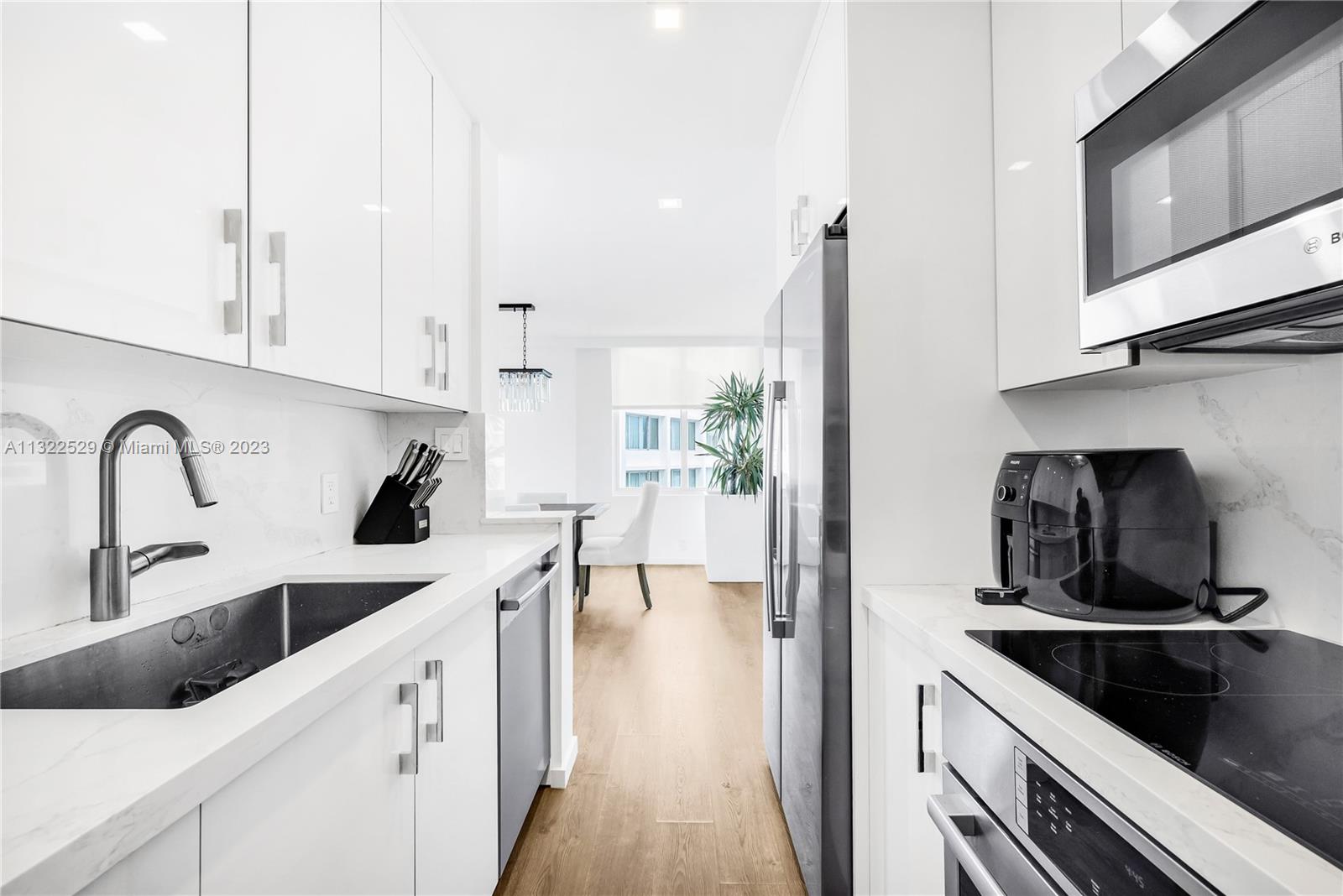 Modern design with attention to detail in this renovated 2 bedroom 2 bathroom corner unit. Enjoy stunning sunsets against the backdrop of Biscayne Bay and the Miami Skyline from your private balcony. Beautiful Porcelanosa floors throughout, modern updated kitchen, appliances, and washer and dryer. Plenty of natural and bright lighting from every room, with views of Biscayne Bay and Miami Skyline. Spacious bedrooms and living space throughout. Unit can be sold furnished. Building has 24HR security heated pool and jacuzzi, fitness club, convenience store. No short term rentals - one parking space in the garage plus additional valet parking at a fee. Mirador 1000 is walking distance to local restaurants, parks, shopping, whole foods and more.