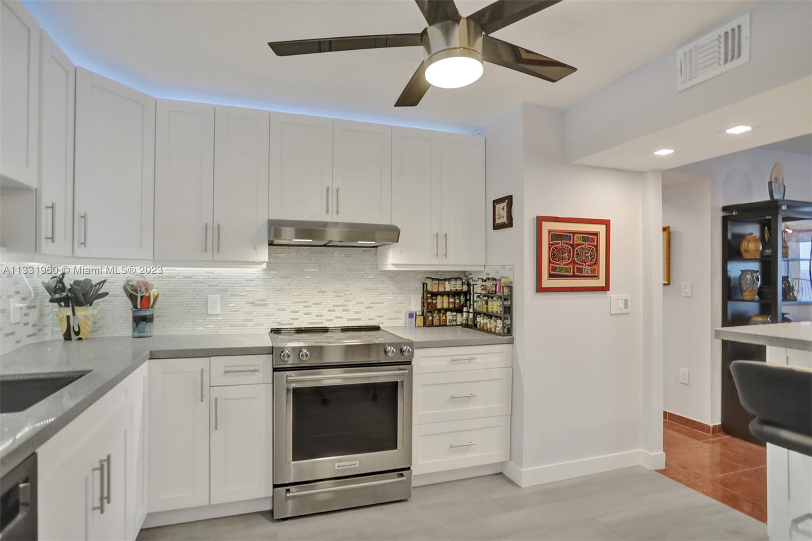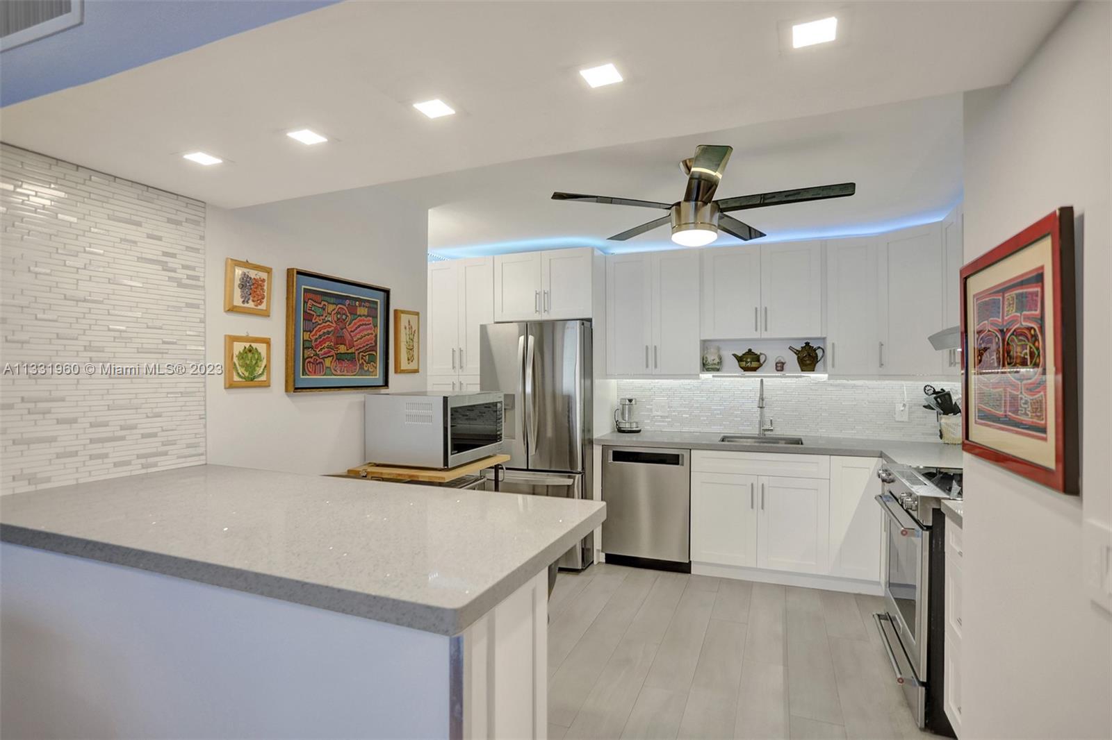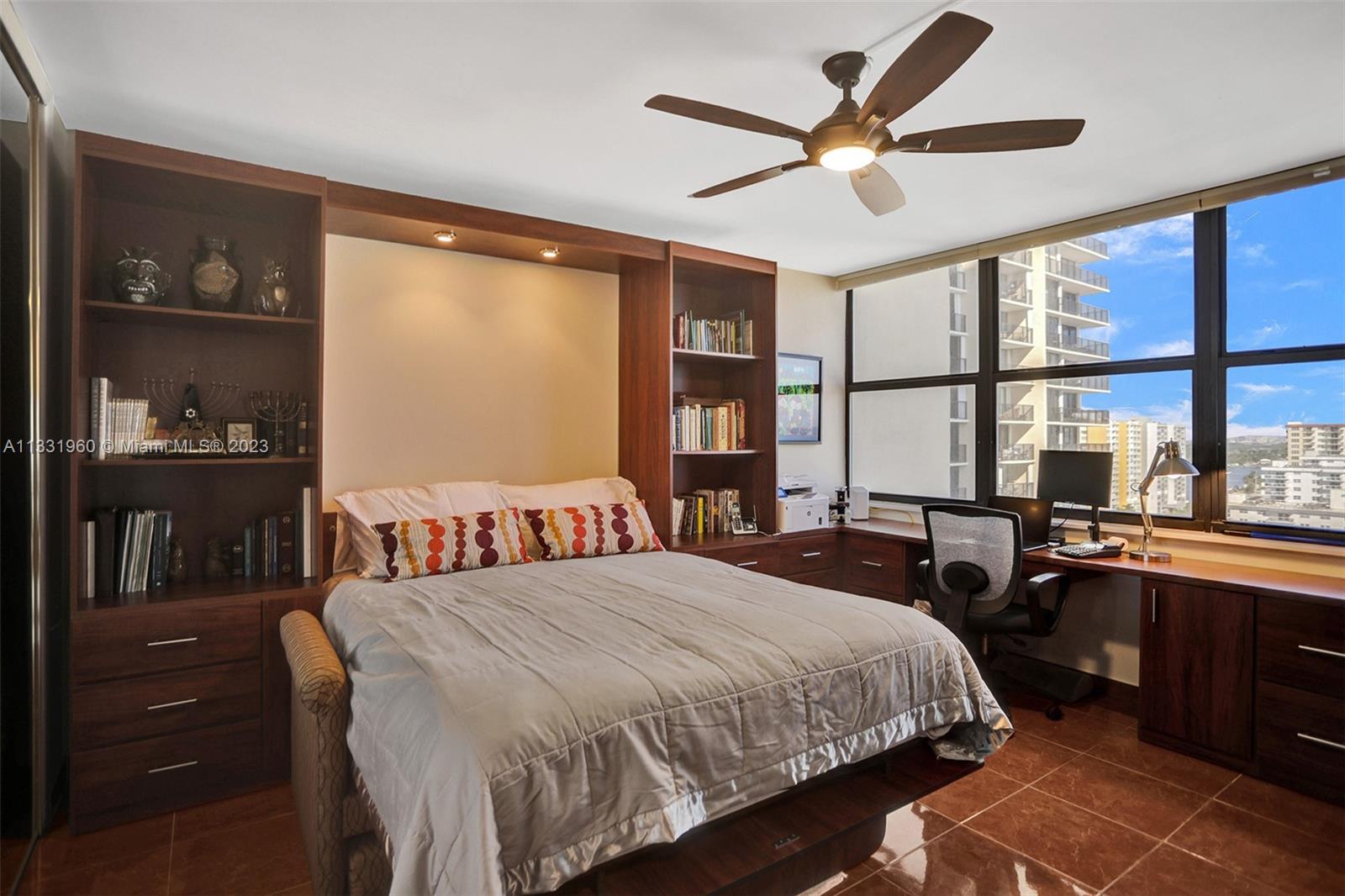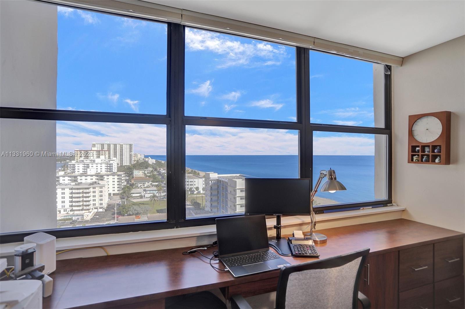 RARELY AVAILABLE, this NE corner oceanfront condo offers amazing views of the ocean & coastline! New, high quality updates (over 150k) include open kitchen w/shaker style cabinets, eat-in bar, lots of clever storage, quartz countertops, SS appliances & tile floors. Both bathrooms incl. all tile, custom layouts & premium fixtures (Toto Wash-let heated toilet). Guest bedroom w/custom Murphy bed /built-in desk, closet incl pullout workbench/custom storage. Primary bedroom w/amazing views of ocean, sliding impact windows / doors open to balcony, custom shelving inside walk-in closet. All new impact windows/doors, new plumbing, electrical, LED lighting, AC, elec. panel, & ceiling fans. Enjoy the many fabulous resort-style amenities at Quadomain. Close to Hollywood Broad walk, Gulfstream & FLL.