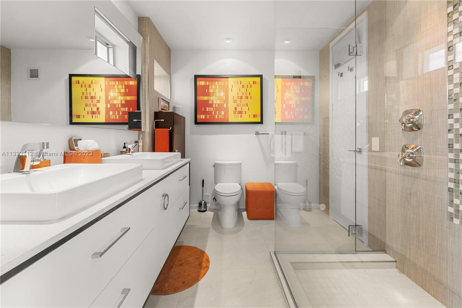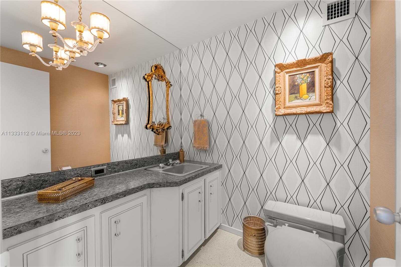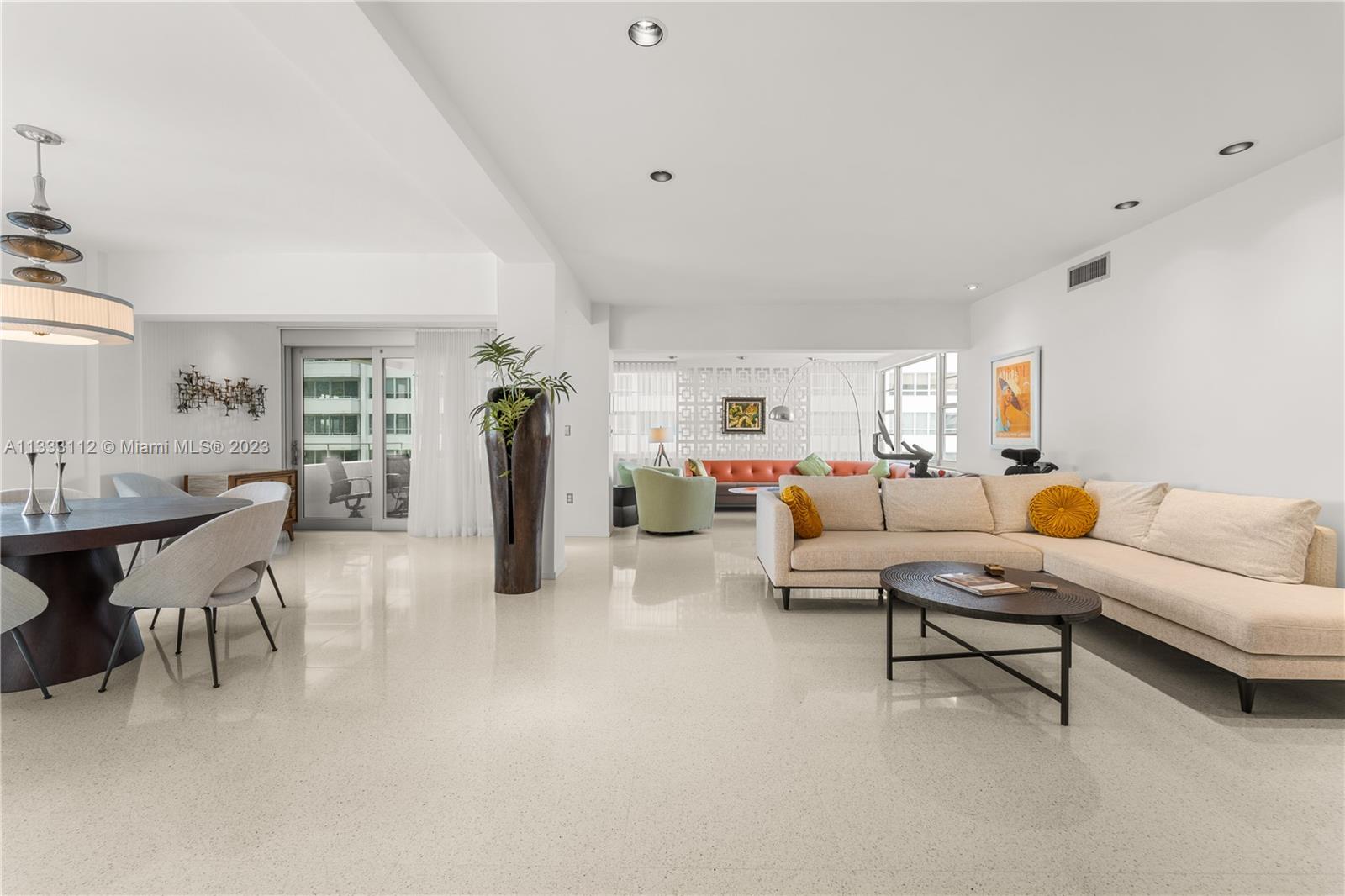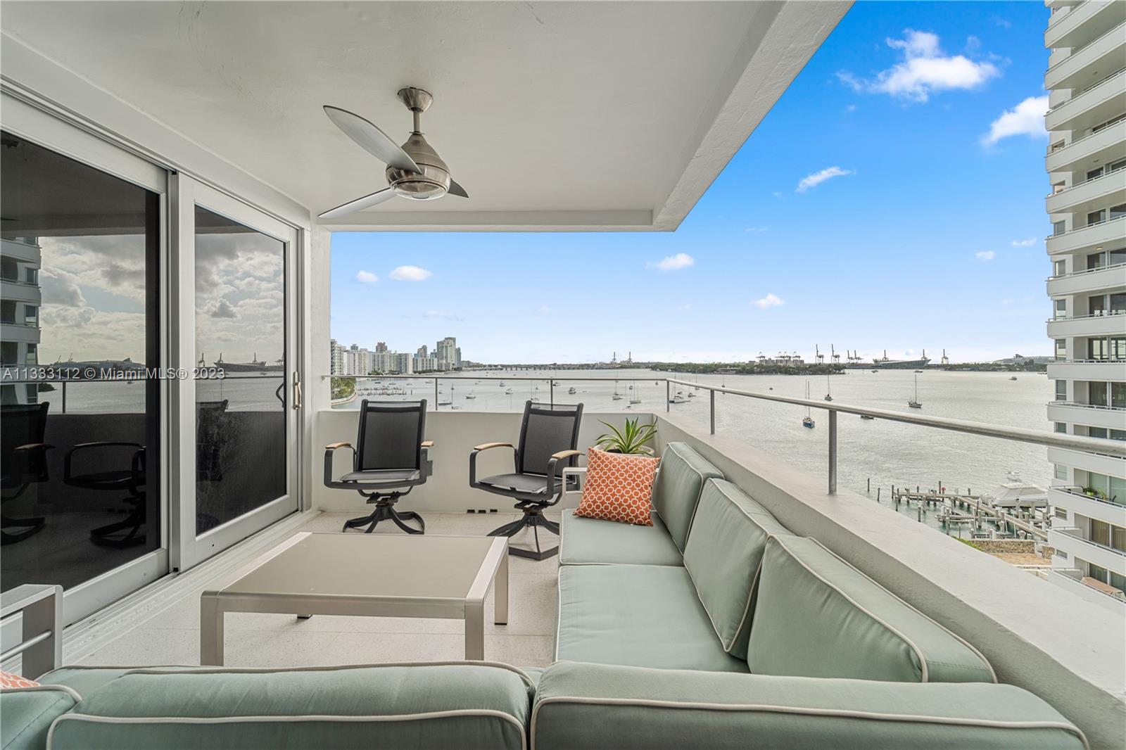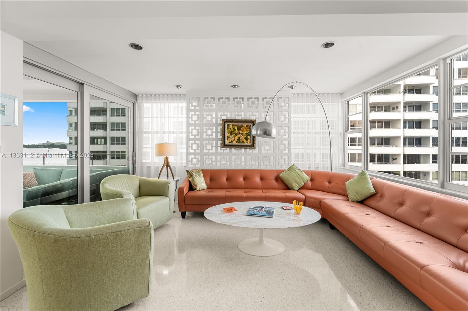 Recently renovated 2 Bed 2.5 Bath with meticulous attention to every detail of the original midcentury modern design of Belle Towers. UNIT IS 1950 SQ/FT. Finishes include terrazzo floors, decorative concrete block, custom walnut cabinetry, roman brick & vintage light fixtures throughout. The design is seamlessly blended with modern conveniences such as induction cooktop, quartz countertops, full size washer/dryer, 60" TV with Sonos sound bar, impact windows & power window shades. Generous storage includes walk-in closets in both bedrooms, kitchen pantry and an internal storage room large enough to accommodate bicycles. Enjoy views of Biscayne Bay from every room and your private terrace great for entertaining. Convenient location walkable to Miami Beach shopping and dining.