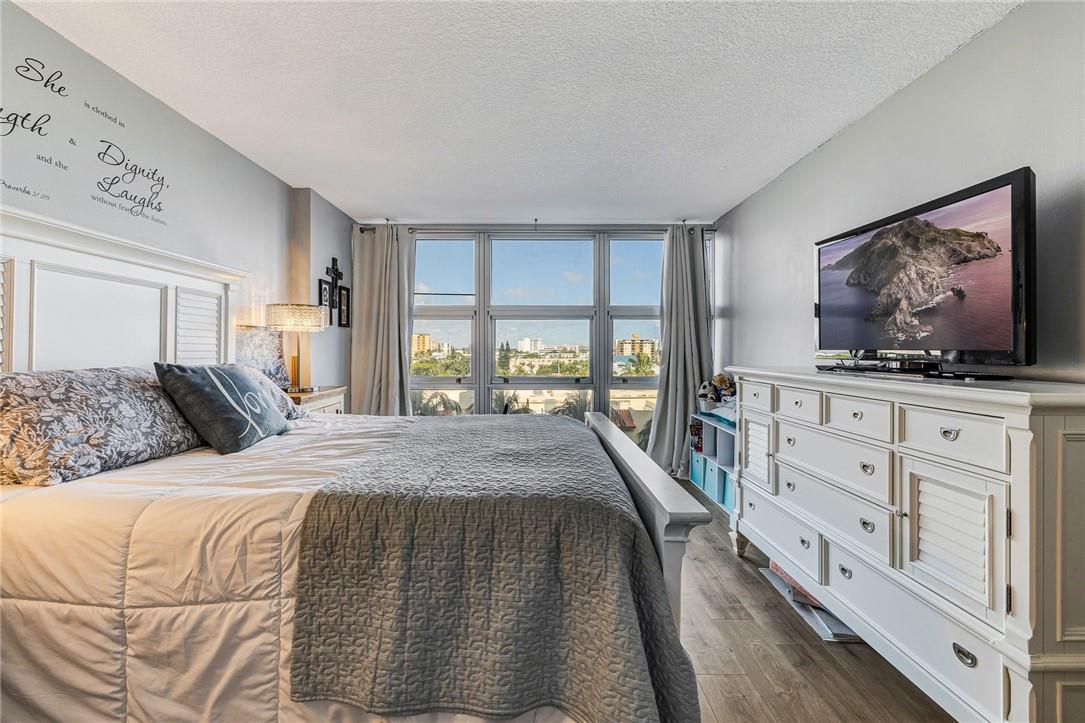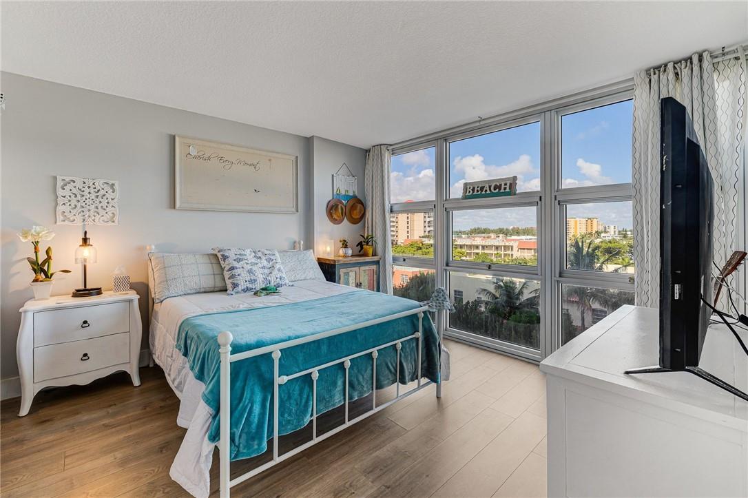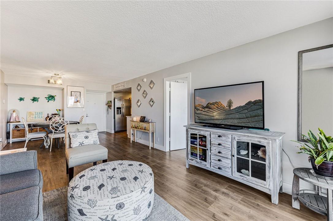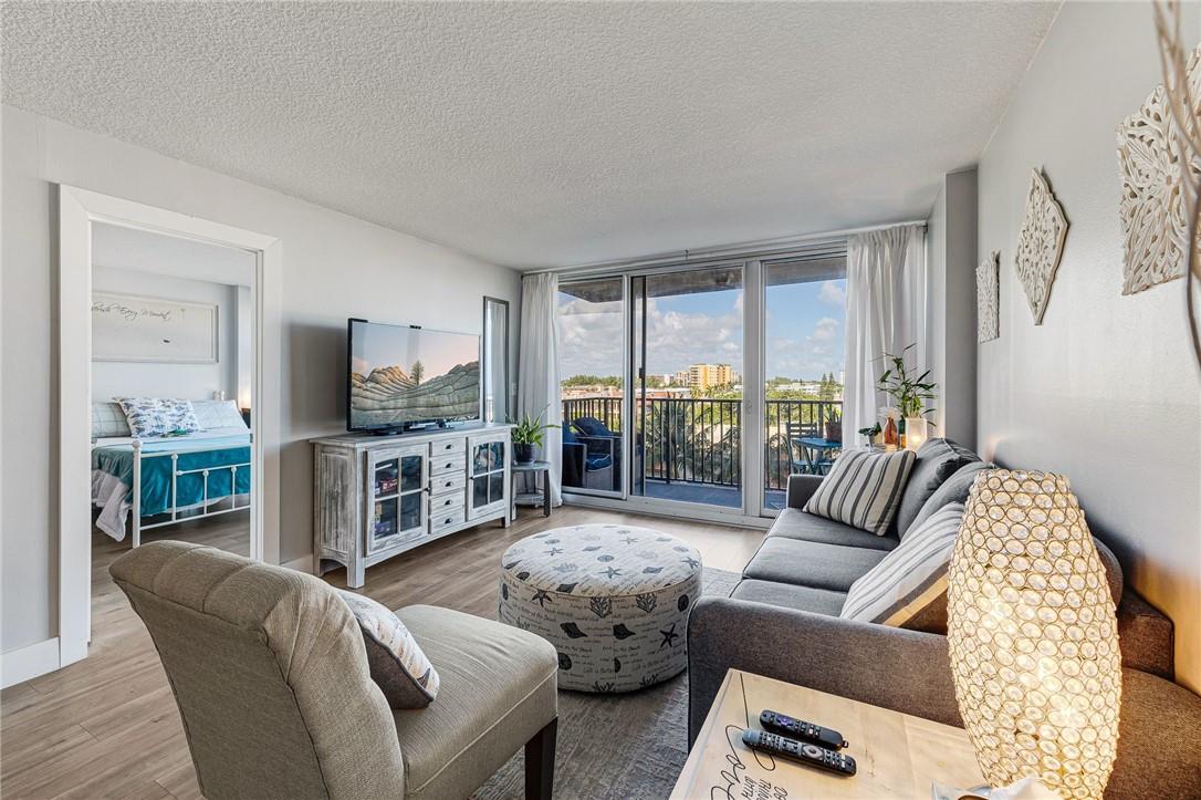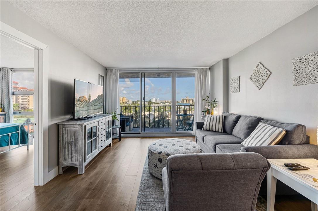 UPDATED PRICE! This 2 bed/2 bath move in ready across from the beach with beach access. No detail missed in this property, updated bathrooms, updated kitchen, stainless appliances, newer water heater, (2) barn doors in the guest room, all carpeting has been removed, popcorn ceilings have been removed, Covered parking spot, with 3 complete outdoor kitchens by the heated pool(s). Enjoy the workout area, sauna, bocce court, join the pickleball club, tennis and or relax at one of the two heated pools. Watch the Holiday fireworks or boat parade from your balcony, come and see, this property will not last long!