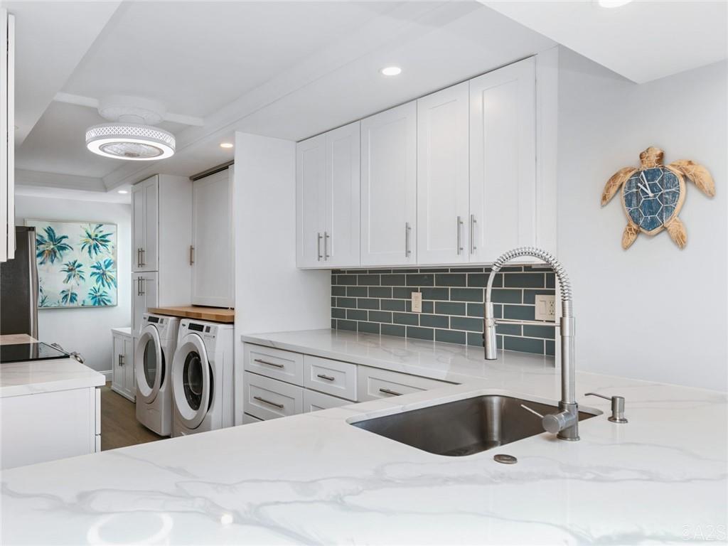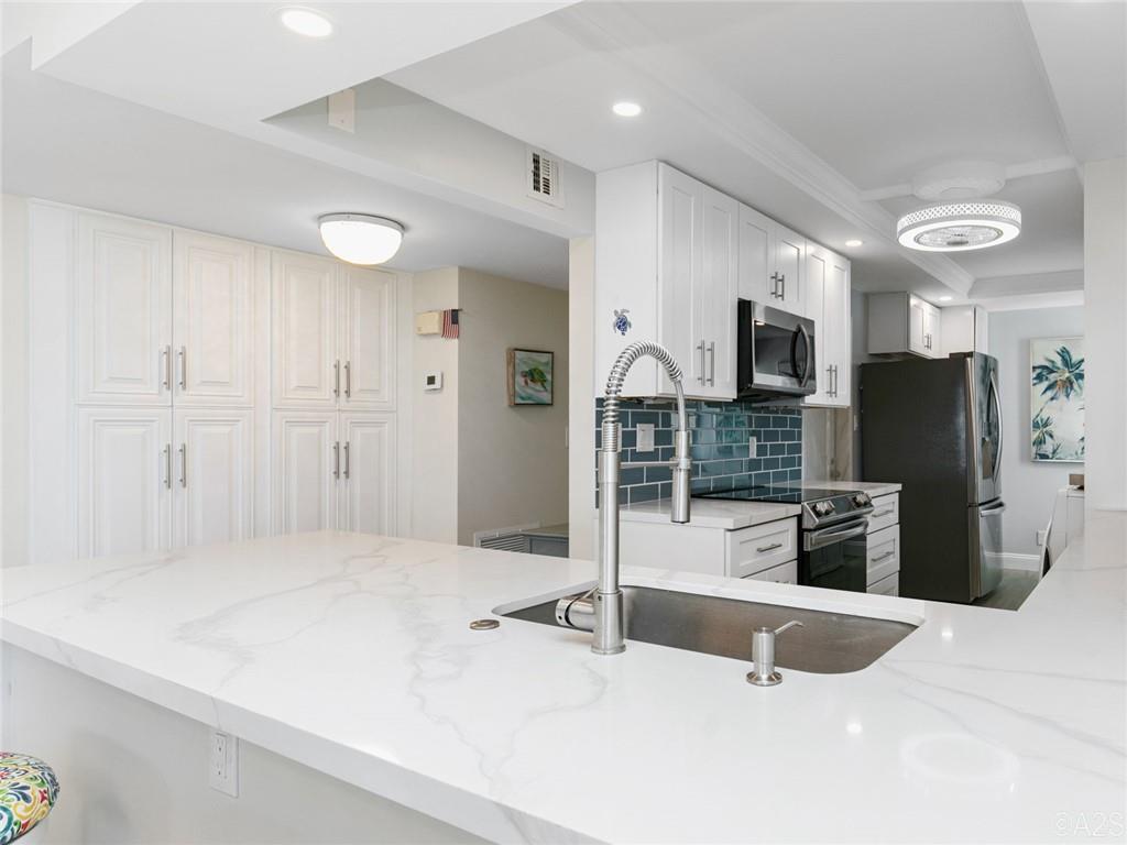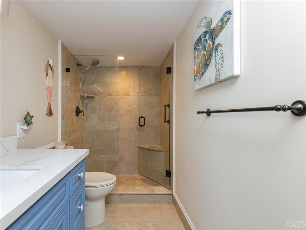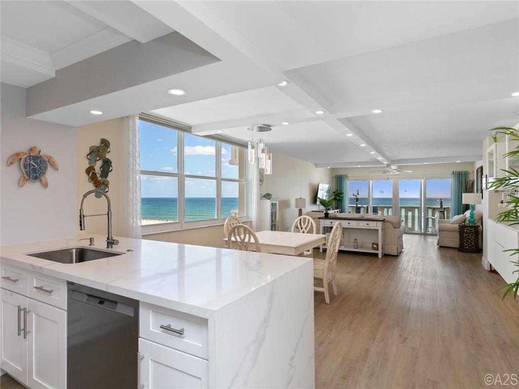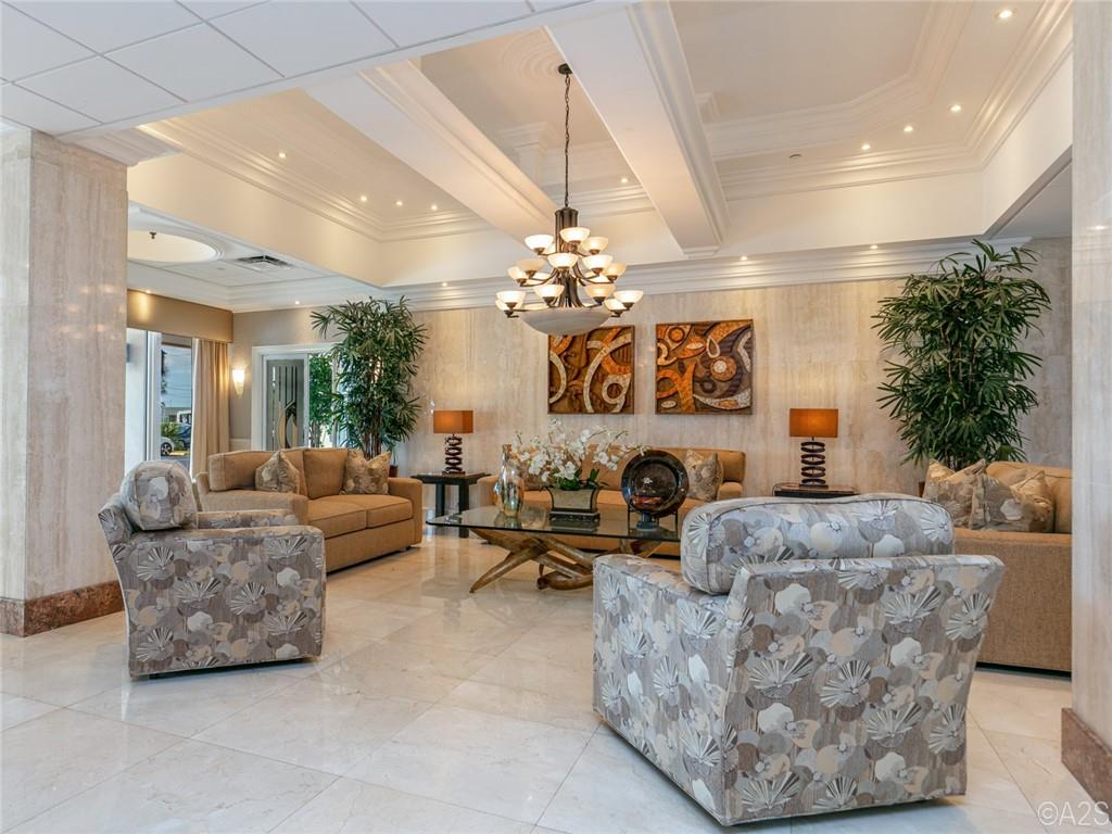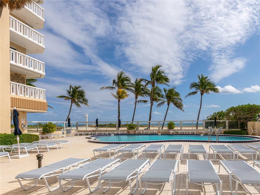 Gorgeous & Spectacular MUST be used to describe this rarely available end unit with direct ocean view & wrap around balcony. Tastefully remodeled in 2022, it features impact windows, shutters, a European Kitchen w/quartz counters and a full-size washer & dryer. You have covered parking and a private storage locker. Upgrades include a coffered ceiling, LED lighting, new fixtures, fans, luxury vinyl plank flooring throughout (except the bathrooms), new AC, BIG storage closets, linen closets in every bathroom, the list goes on. A beautiful 55+ community with deeded beach access, a guarded lobby, beachfront heated pool, fitness room, community room, a beach side BBQ and plenty of activities and close to shops & restaurants. No pets. OK to rent.