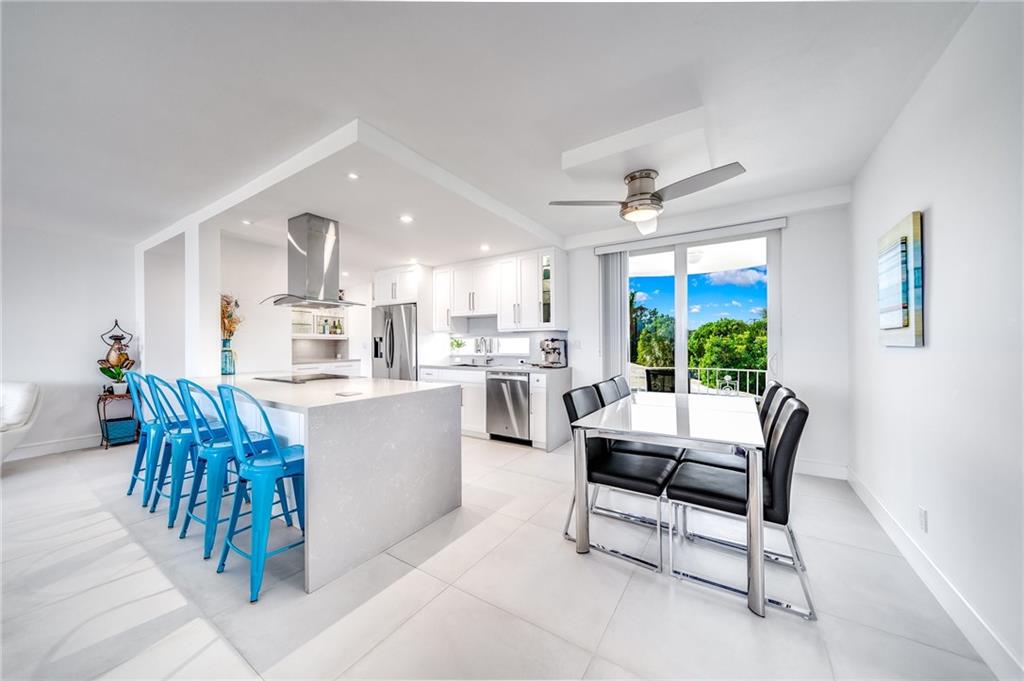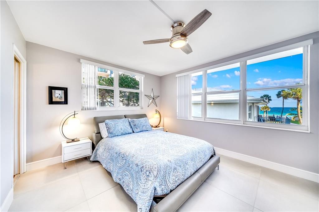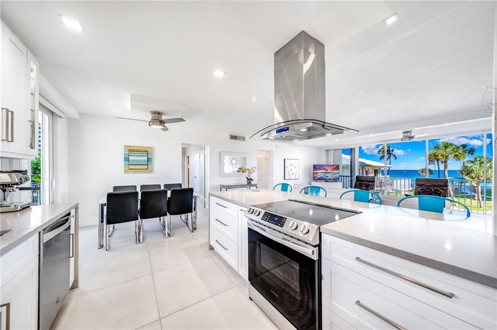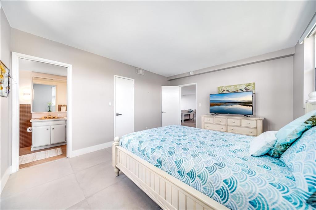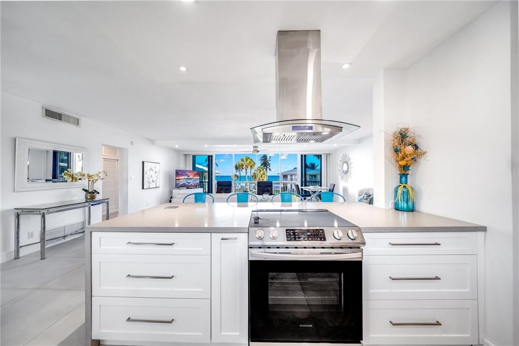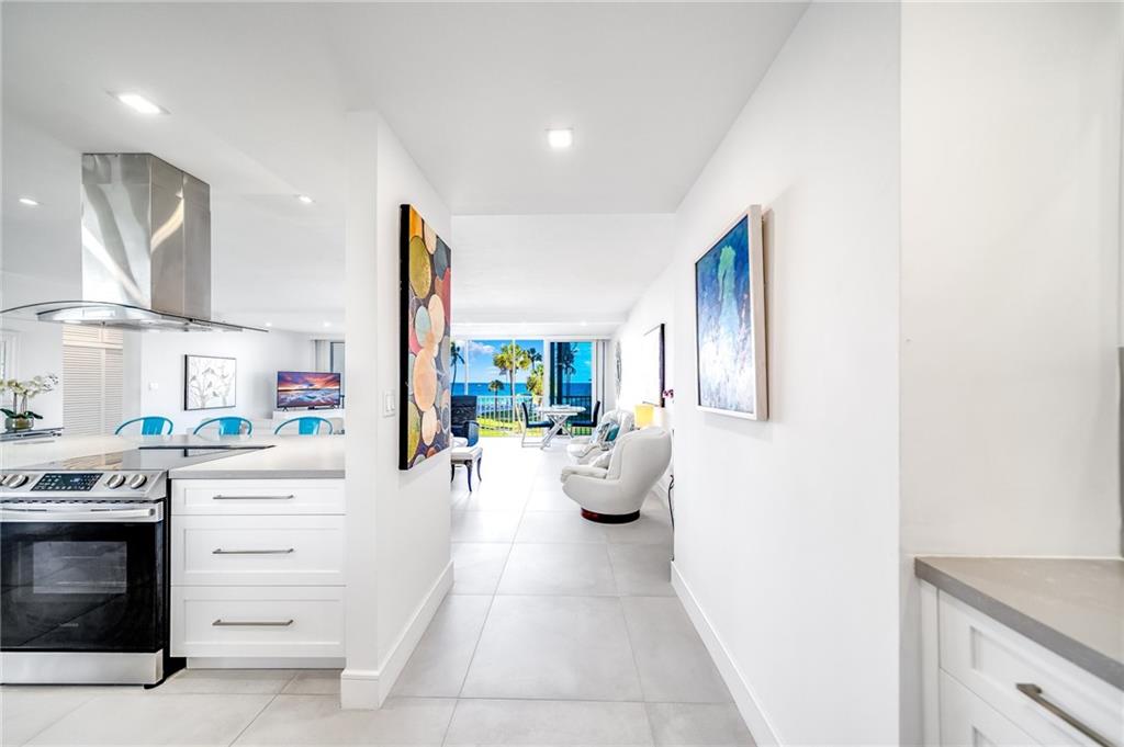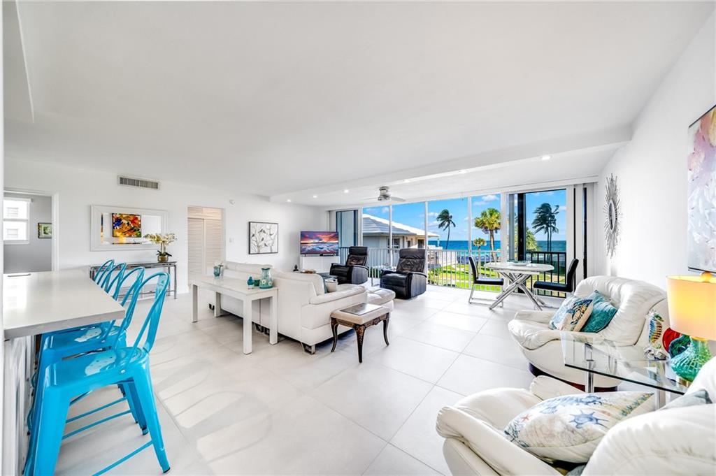 Paradise Perfected. This 2 bedroom, each with an ensuite bathroom and walk-in closet, features an open living area with amazing direct views of the ocean! This unit was renovated in 2022 and includes rectified 32" floor tiles throughout, new kitchen cabinets & quartz countertops as well as a designated bar area with wine rack. The a/c was replaced in 2022 as well as the electrical panel, tankless water heater, and new shut-off water valves. The fridge, stove, dishwasher and exhaust are all 2 years old. The unique vintage mid-century restored bathrooms add to the overall quality comfort of this spacious and bright end unit. Impact windows and doors throughout as well as remote controlled blinds reveal a full-wall of sliding glass doors to enjoy your morning coffee with stunning ocean views.