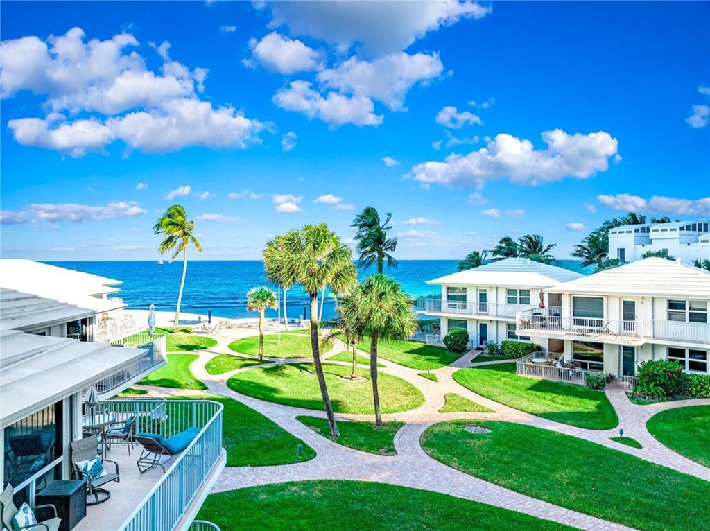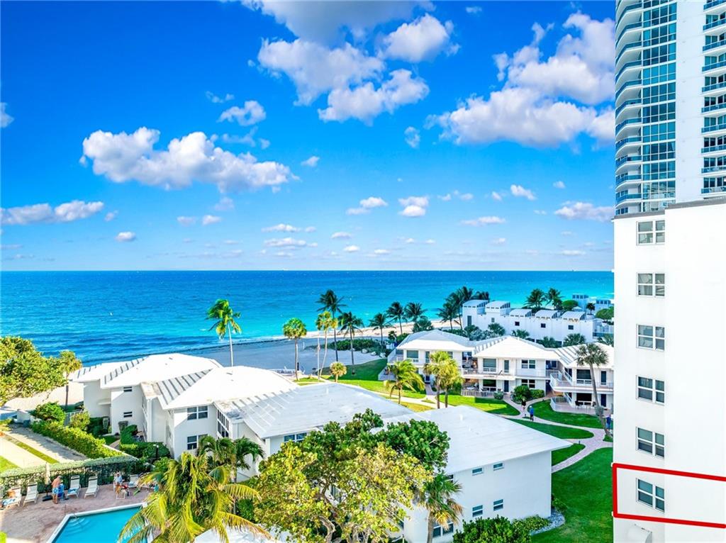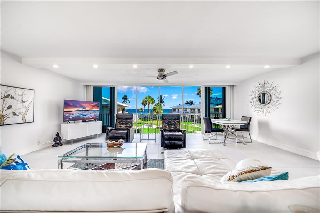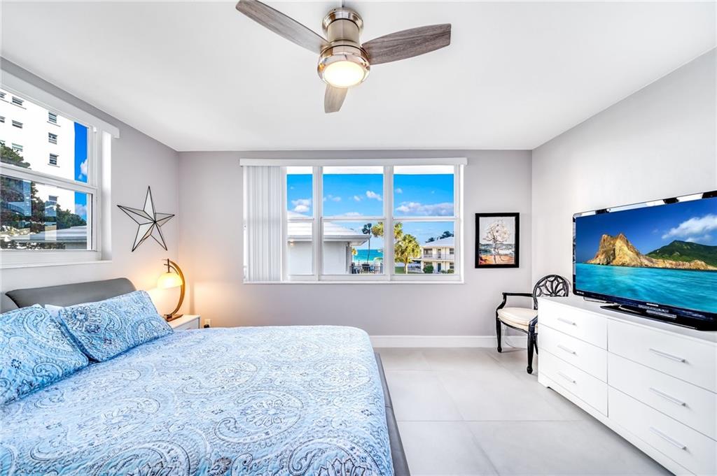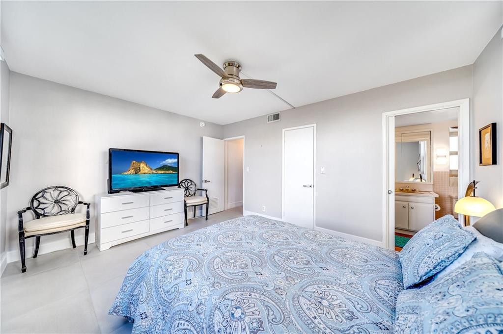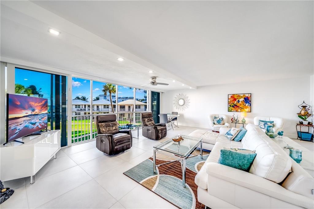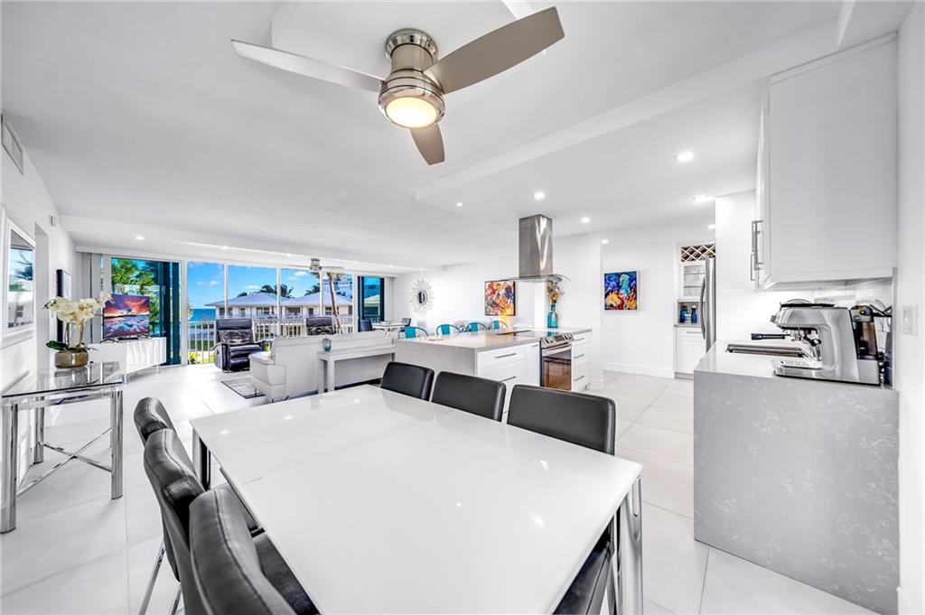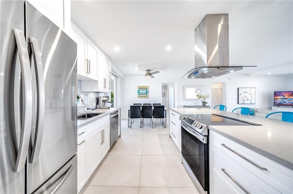 Paradise Perfected. This 2 bedroom, each with an ensuite bathroom and walk-in closet, features an open living area with amazing direct views of the ocean! This unit was renovated in 2022 and includes rectified 32" floor tiles throughout, new kitchen cabinets & quartz countertops as well as a designated bar area with wine rack. The a/c was replaced in 2022 as well as the electrical panel, tankless water heater, and new shut-off water valves. The fridge, stove, dishwasher and exhaust are all 2 years old. The unique vintage mid-century restored bathrooms add to the overall quality comfort of this spacious and bright end unit. Impact windows and doors throughout as well as remote controlled blinds reveal a full-wall of sliding glass doors to enjoy your morning coffee with stunning ocean views.