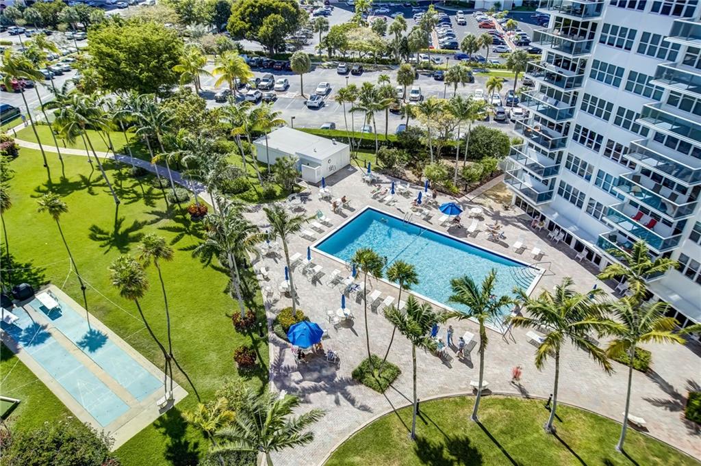 PARADISE BY THE SEA. 2 bed 2 bath CORNER UNIT with OCEAN and INTRACOASTAL views. Granite countertops in nicely updated kitchen. Fresh, modern bathrooms. Walk to the beach, dozens of restaurants, retail shopping, grocery stores - in the middle of everything on this 5 acre oasis. Community room in main building PLUS a CLUBHOUSE directly on the intracoastal. Move right in and start enjoying the good life today. High speed fiber optic internet and cable included in maintenance. Brand new roof in 2023 and fully funding reserves - building is in excellent financial condition. One buyer must be age 55 or over.