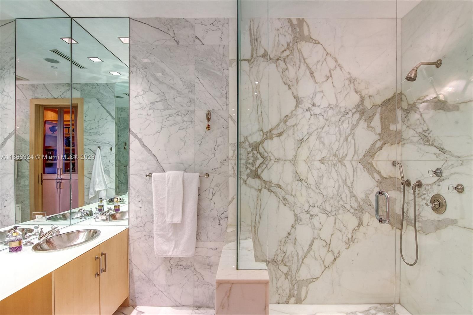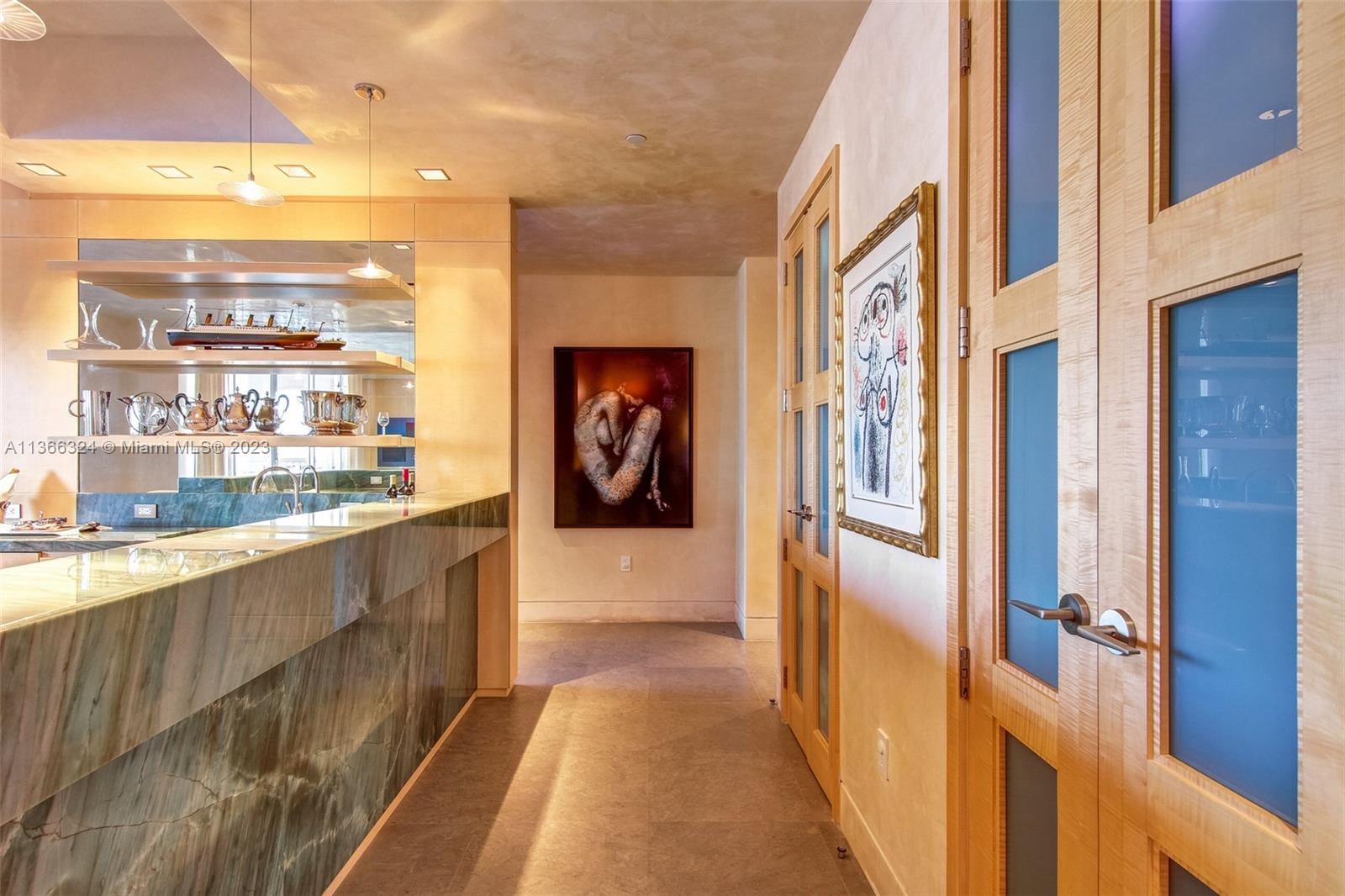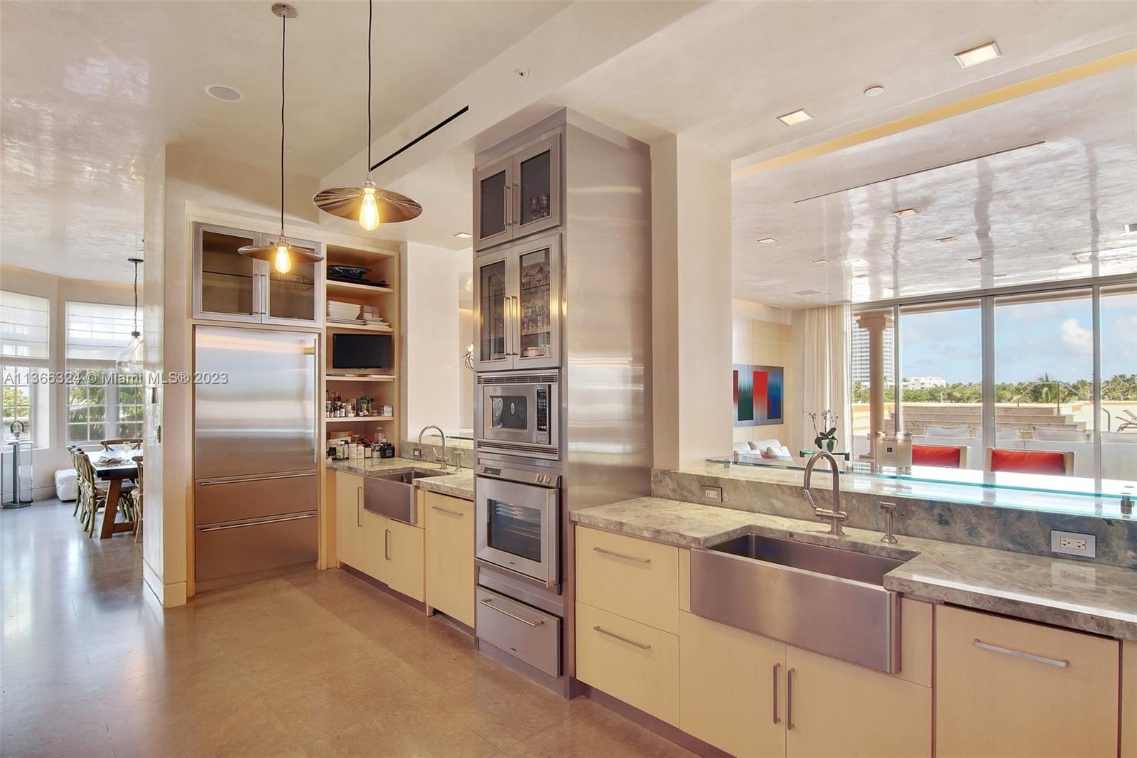 Coveted large 4BR ground floor unit in Palazzo Del Mare! Boasting ultra luxurious contemp finishes & decor in serene neutral colors. Soaring ceilings, MSTR suite w/cozy library/den & sep his/hers MSTR BA & PVTE TER. Ample brs w/en-suite BA, serene grey limestone flrs. Natural stone throughout, chandeliers & fixtures by Waterworks. Includes 3 GAR parking spcs, A/C STGE & one golf cart. Expansive 4000+/-SF TER w/summer KIT perfect for entertaining. Breathtaking SOBE views. Discrepancy between MLS and tax rolls the correct total 4,861 SF(as per floor plan)