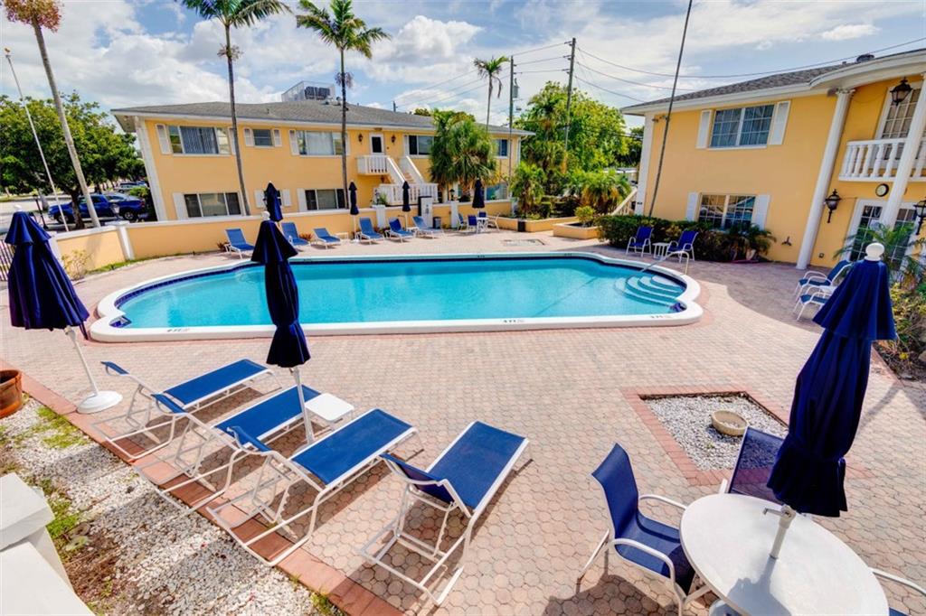 Excellent Location! Ready to move in 2 bed/1.5 bath condo in Imperial Point Gardens. Surrounded by private single family homes. Gorgeous fully renovated kitchen with new refrigerator. Ceramic tile throughout, accordion shutters, fabulous view of heated pool. Renovated club house, laundry on premises. Near Holy Cross Hospital, restaurants, library and 2 miles from the beach! One assigned parking spot near unit. Most see !!!.