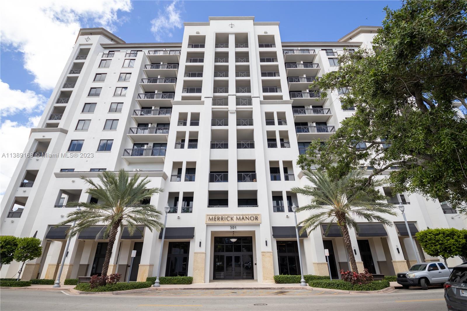2 bd 2 bath w Extra Large private terrace at luxury, full-service Merrick Manor. Approx 906 SF unit, covered Terrace +200 SF adds another room to unit. Extra high ceilings 10 ft. 2019 construction. Impact windows. Built-in Bosch SS appliances, white quartz counters. 24 hr concierge/security. Gorgeous amenities include: outdoor pool, summer kitchen and al fresco dining, top of the line gym. 1 assigned parking. EV charging in garage. Easy to rent, condo allows 6 month rentals. In the heart of Coral Gables, close to world class shopping, dining and business district.