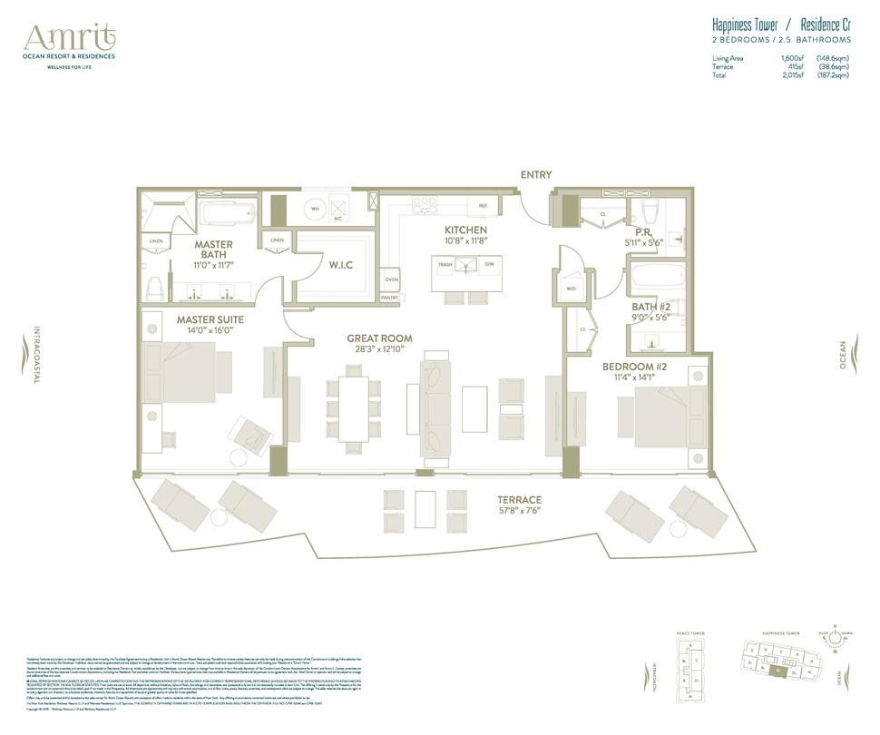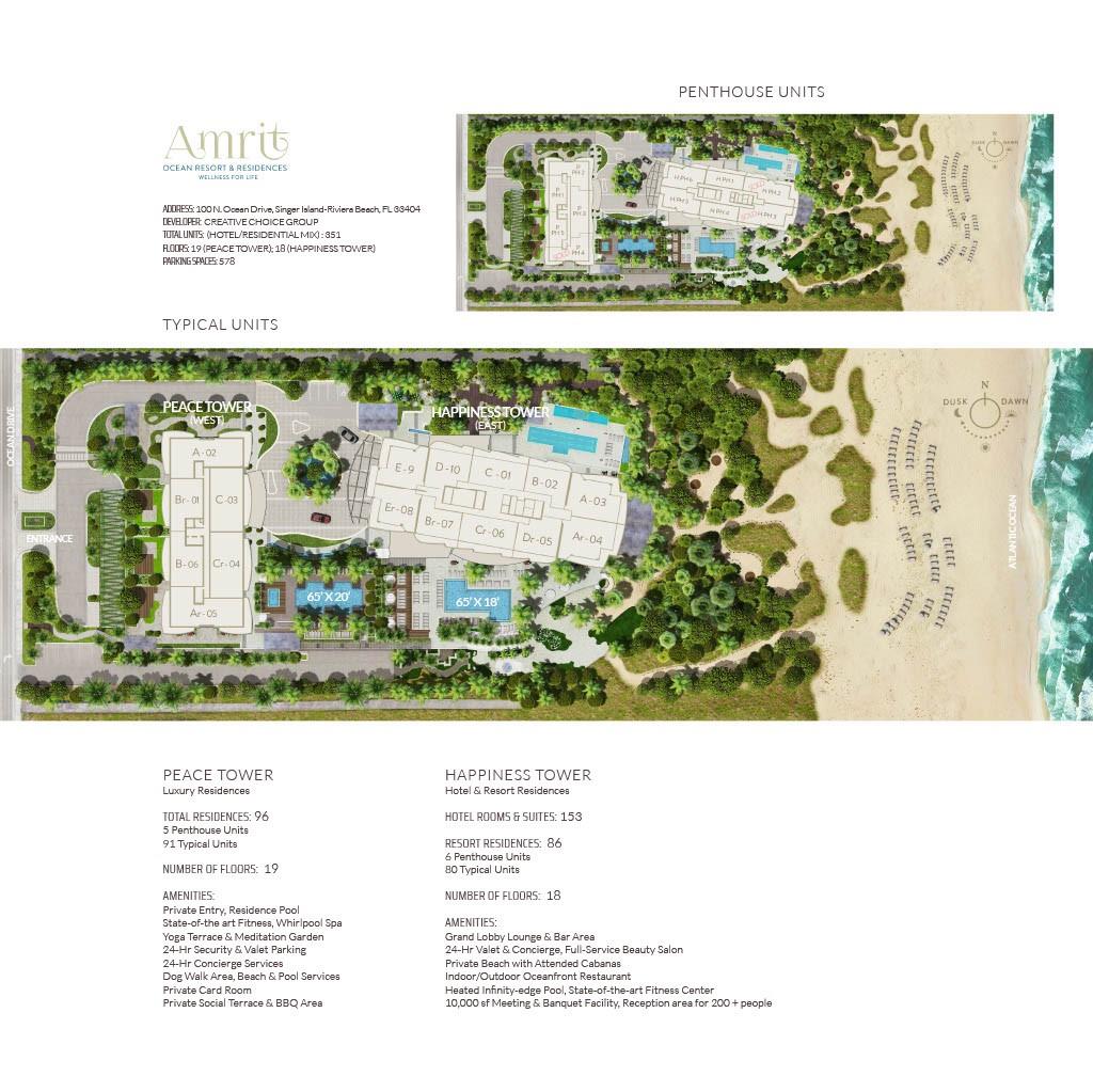 Perfect Southeast exposure offering amazing ocean & intracoastal views from this 2 bedroom, 2.5 bath home. 1,600 sq ft of interior living space, and an expansive 415 sq ft terrace with access from all rooms. Amrit offers contemporary coastal living with unmatched amenities and lifestyle in The Palm Beaches. Set to open in 2023, Amrit is a Wellness Resort set on just under 8 acres with over 300’ of oceanfront, offering 182 private residences. All residences are move-in ready with Italian porcelain flooring, top of the line Italkraft cabinetry, quartz counter-tops, Miele appliances, high-impact glass and over-sized wraparound balconies. The Resort offers 155 hotel rooms and over 100,000 sq. ft. of wellness amenities, incl. a 56,000 sqft Spa. Four food and beverage venues on property