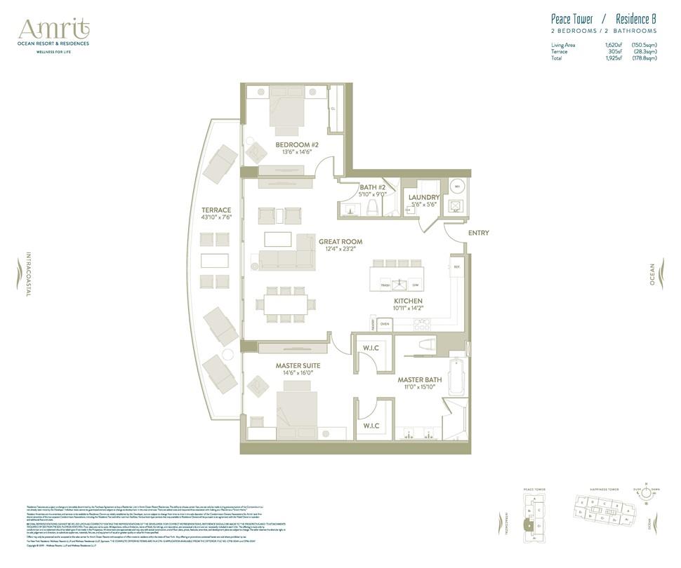 Fabulous intracoastal views & Sunsets from this floor 2 bedroom, 2 bath home. 1620 sqft of interior living space, and a 305 sqft terrace from all rooms. Amrit offers contemporary coastal living with unmatched amenities and lifestyle in The Palm Beaches. Set to open in Summer 2023, Amrit is a Wellness Resort set on just under 8 acres with over 300’ of oceanfront, offering 182 private residences. All residences are move-in ready with Italian porcelain flooring, top of the line Italkraft cabinetry, quartz countertops, Miele appliances, high-impact glass and oversized wraparound balconies. The Resort offers 153 hotel rooms and over 100,000 sq. ft. of wellness amenities, incl. a 56,000 sqft Spa. Four food and beverage venues on property.