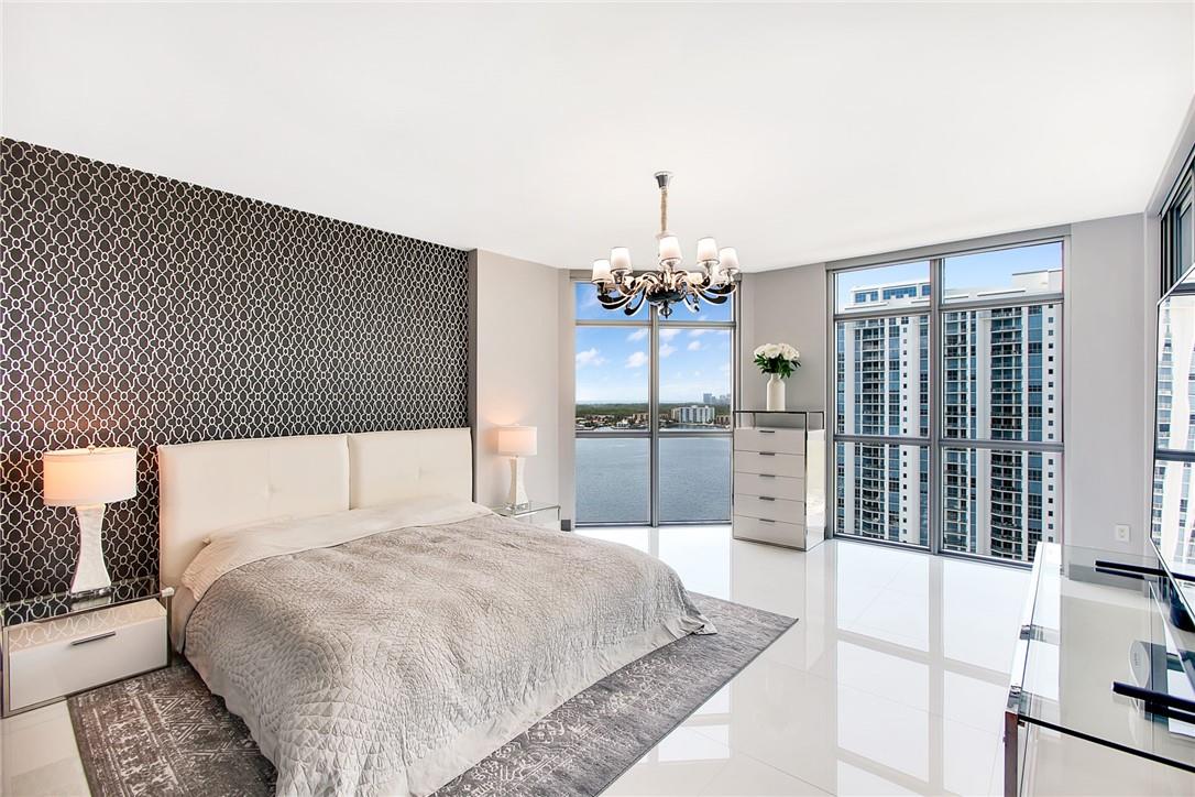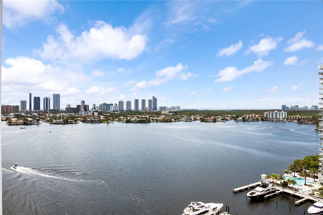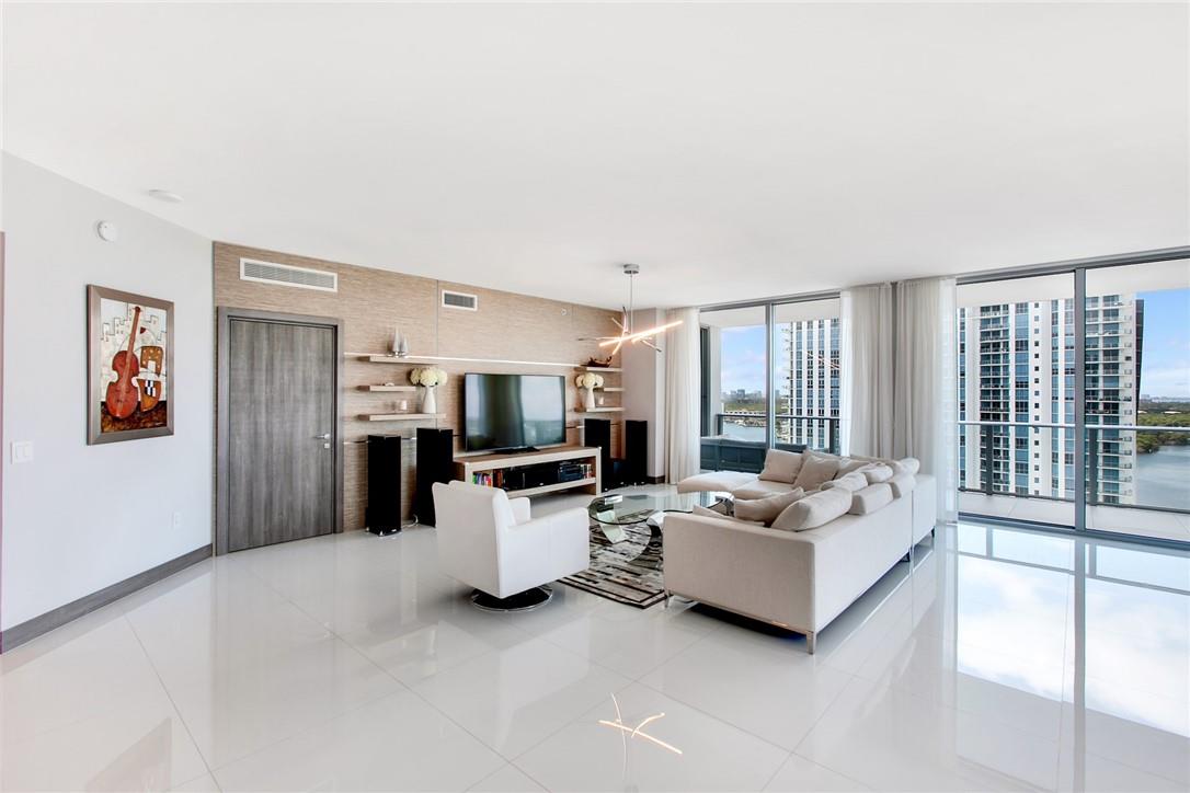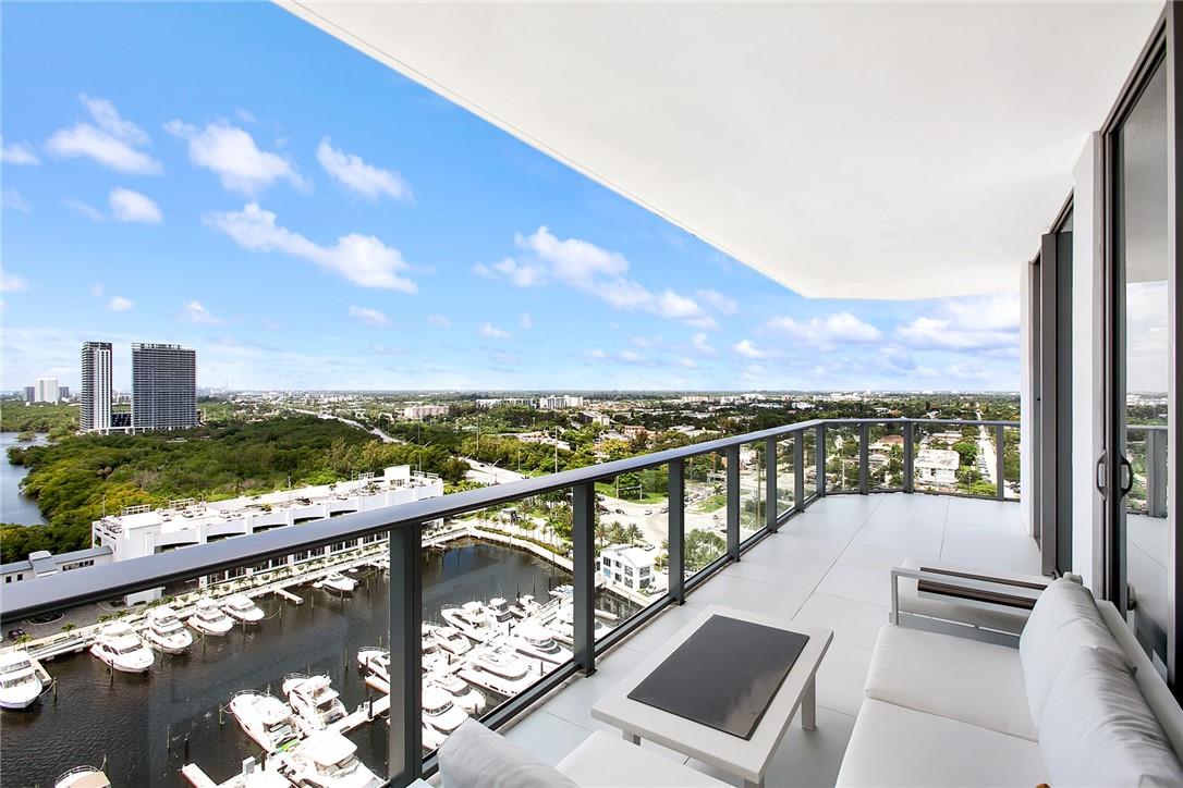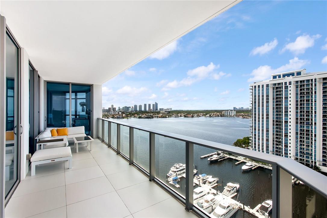 Modern design decorated and furnished residence at Marina Palms North building. South corner with intracoastal, marina and ocean views. 2156 sq feet spacious two bedroom with den or third bedroom. Features white porcelain floors, open gourmet kitchen with wolf appliances, sub zero refrigerator, large marble bathrooms, huge balcony, custom closets, custom window treatments and built ins. The complex of Marina Palms offers the best amenities, full service marina, amazing pool deck on the bay, state of the art gym, concierge, kids and teen centers, 24- hour gated security and surveillance, extra storage space.