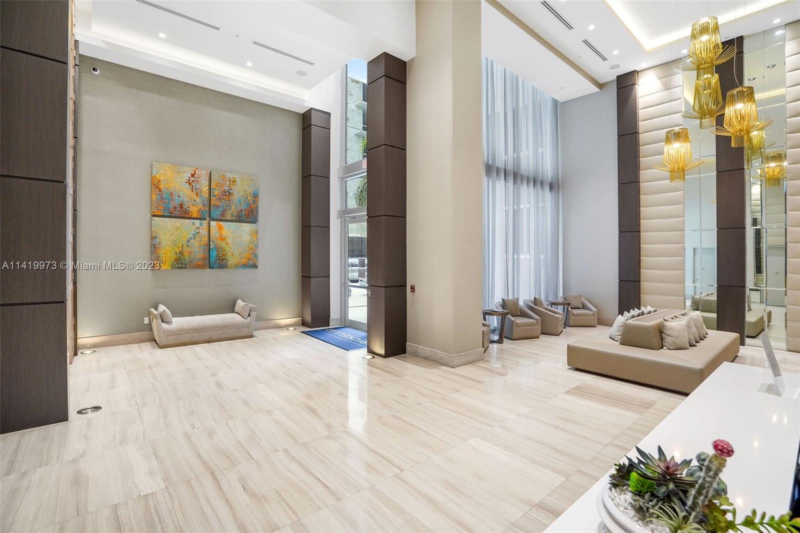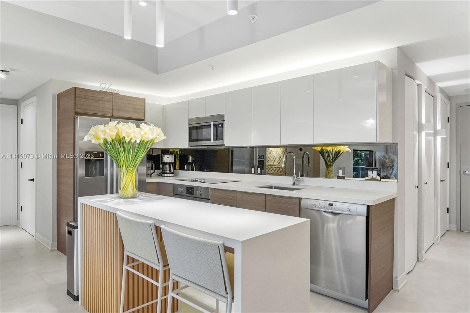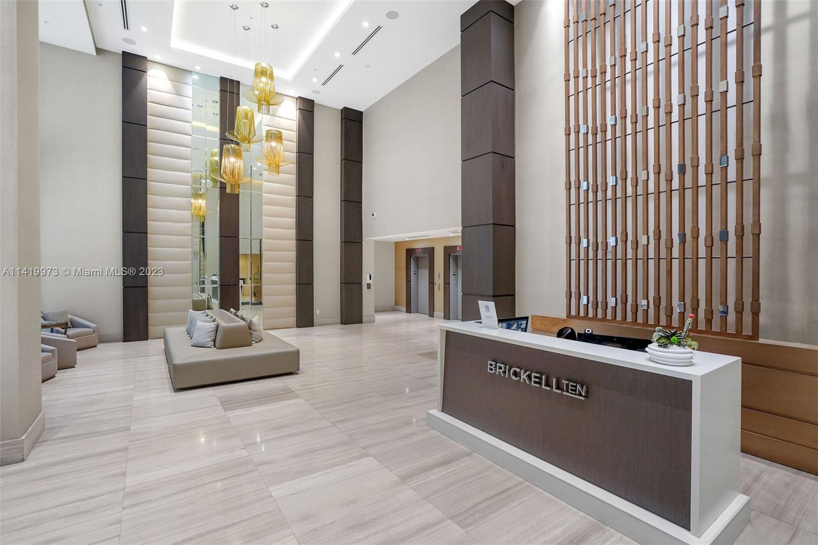 Professionally remodeled & furnished at Brickell Ten is available for sale. This home has been decorated with furniture from Artefacto & CB2. The remodeling includes custom wood paneling on several walls, solid wood built-in entertainment centers in the living room & both bedrooms, built-in bedroom furniture, high end custom closets, completely remodeled bathrooms & lighting throughout the unit. Brickell Ten is within walking distance to the offices, shops & restaurants that Brickell has to offer and has easy access to I-95. Amenities include a large pool area, rooftop gym & jacuzzi, club room and 24 hr security. The finishes, furniture & design of this unit is more commonly found in $1M+ properties.