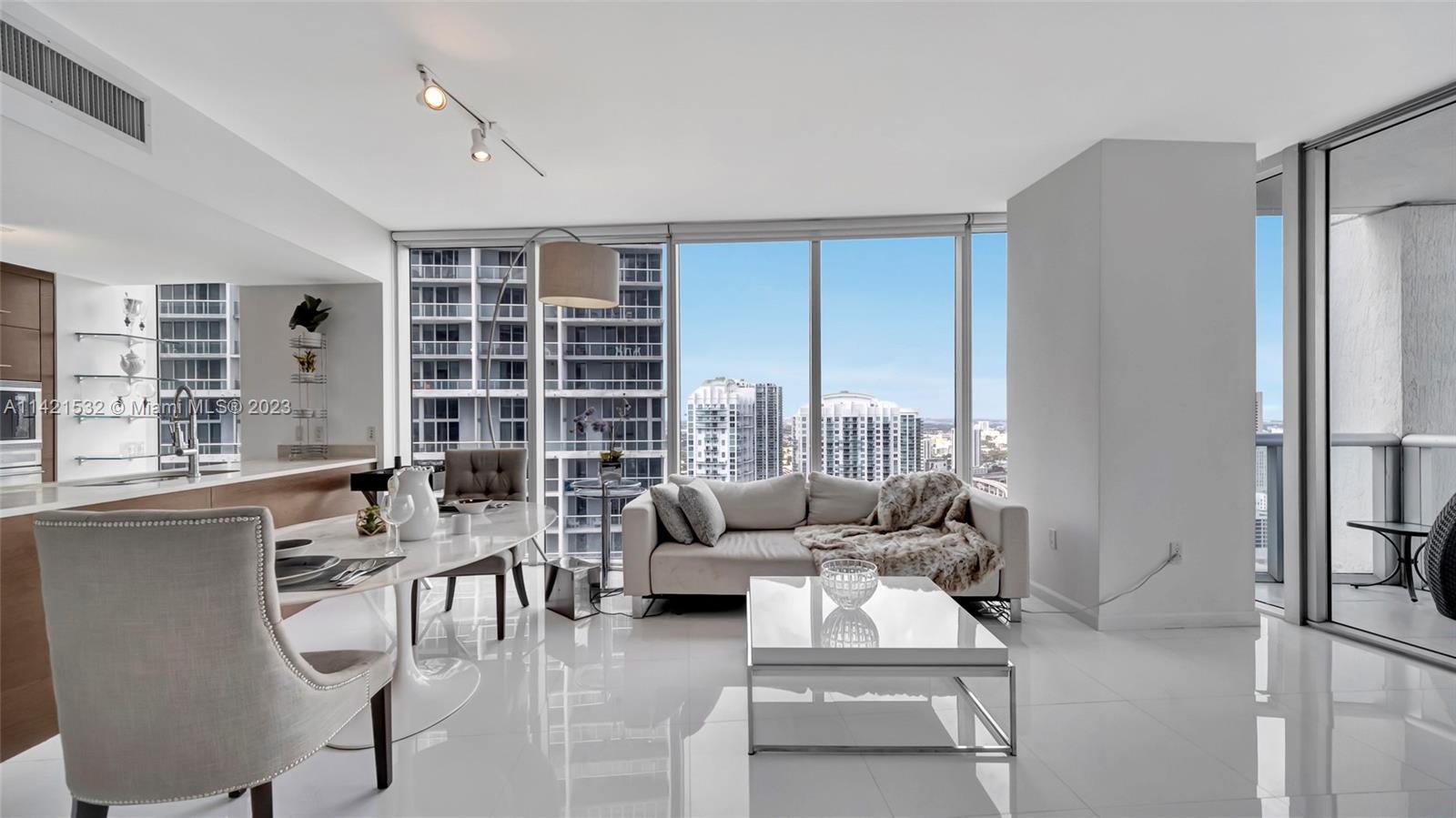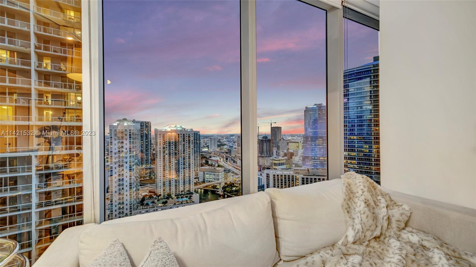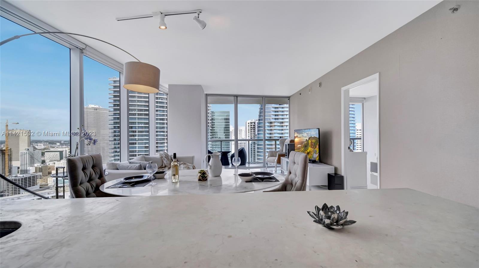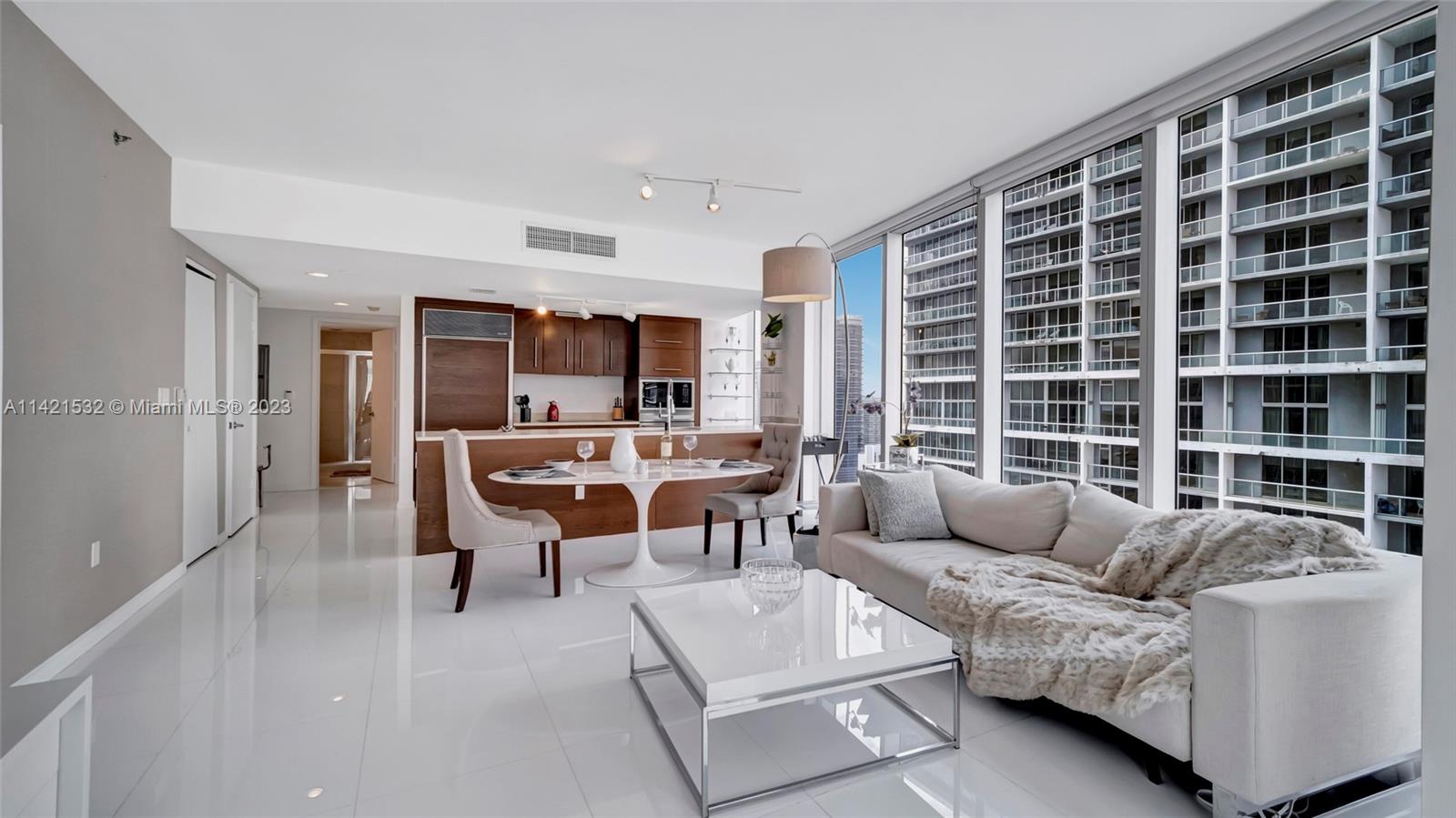Indulge in the epitome of luxury living with this extraordinary corner unit, boasting mesmerizing water and city views. Floor-to-ceiling windows flood the interior with natural light, creating an ambiance of elegance. Step onto the balcony and immerse yourself in the captivating bay, river, and Miami skyline views.The kitchen features high-end Wolf and Sub-Zero appliances, complemented by European cabinetry and pristine white porcelain tiles. Enjoy modern comforts with a new A/C system, convenient washer/dryer, and stylish accent walls throughout. The Icon offers unparalleled amenities, including a state-of-the-art fitness center, an ultra-luxurious spa, and an expansive pool deck with fine dining options, private cabanas, and impeccable poolside service. Furniture negotiable!