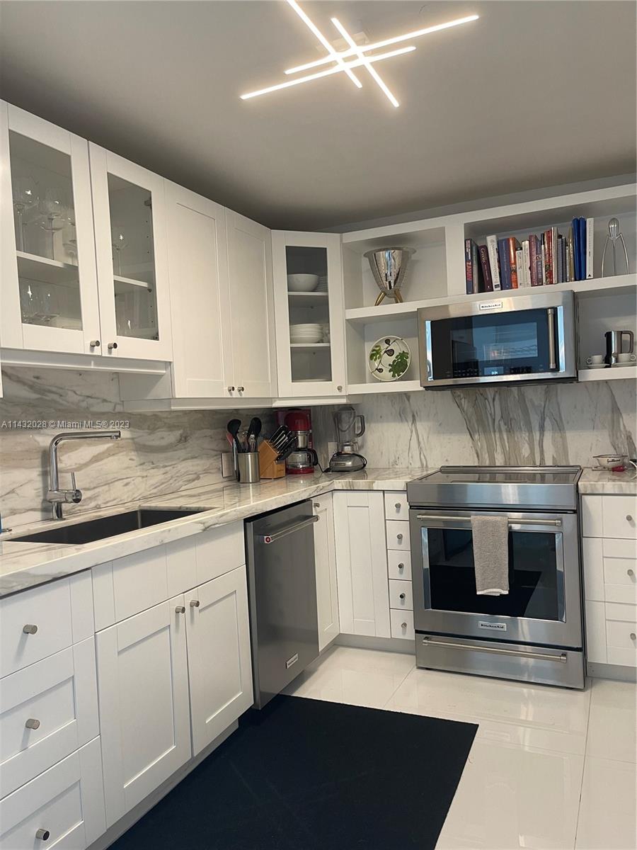 Sleek SoBe updated unit. Gorgeous large white porcelain tile with wood floors in the bedrooms. New bathrooms, kitchen appliances, windows, CAC (all within last 2 years). Custom window treatments, California closet wall unit and elfa closets....PLUS Bosch Washer/Dryer. Great natural light and beautiful unobstructed views. Pet friendly updated building with reserves.