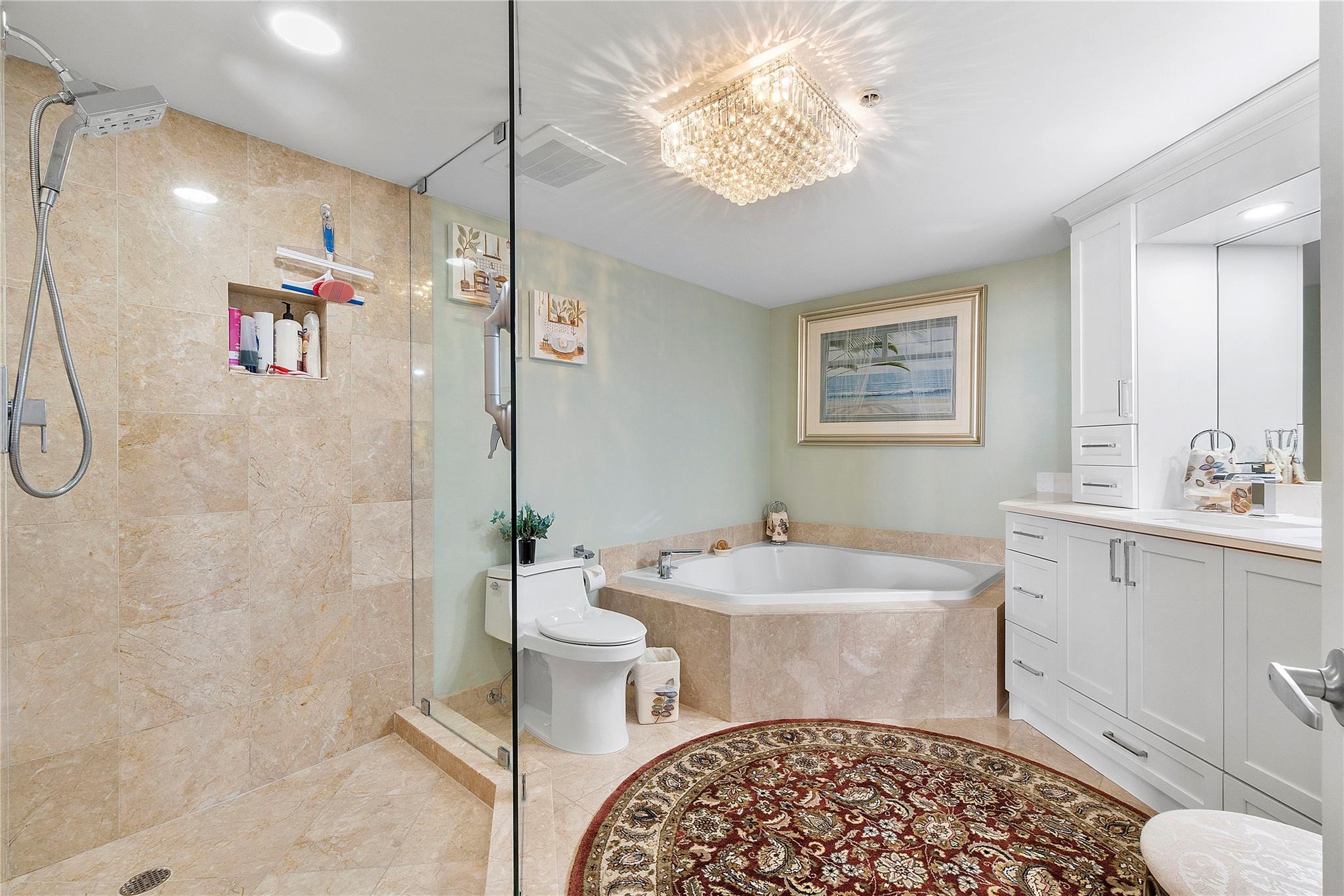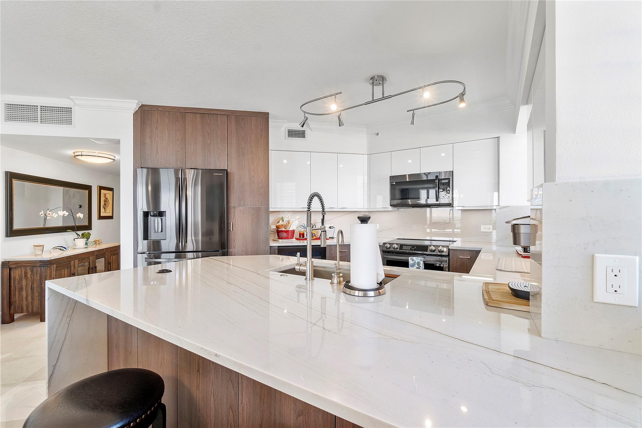 Experience breathtaking ocean views as you step into this fully remodeled 3 bed, 3 bath condo in The Vue. This unit boasts a wrap-around balcony & a plethora of upgrades throughout including luxurious marble floors, elegant crown molding, brand new a/c unit, closet systems in each bedroom, Impact glass windows & doors, professionally designed 2023 kitchen featuring a sleek Quartz waterfall countertop & top-of-line stainless steel appliances. This unit also comes with the convenience of three private parking spaces. Embrace a lifestyle of comfort & leisure with access to the resort-style amenities, private beach club, 24 hr security & valet parking. Elevate your living experience at The Vue, where every detail has been carefully curated to offer you the ultimate in coastal luxury.