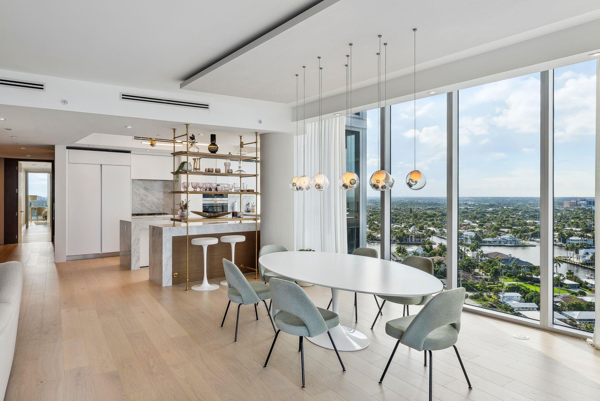 One of a kind combination corner residence at the new Auberge Beach Residences. Original owner combined two units into the most spectacular 5 bedroom, 5 bath unit with 4,241 sq/ft of interior living space. Professionally designed by DKOR Interiors, no expense was spared when finishing the unit with custom built-ins, wood flooring, closets, window treatments and furnishings. The 180 degree views from this NE corner flow-thru unit include direct ocean, intracoastal and downtown views. The kitchen was custom designed to be one of the largest at Auberge and includes an island, 2 full size wine coolers and gas cooktop. 4 parking spaces included. Auberge offers 5 star amenities including: upscale restaurant and spa, fitness center, two pools, cinema, golf simulator, billiards, wine room etc
