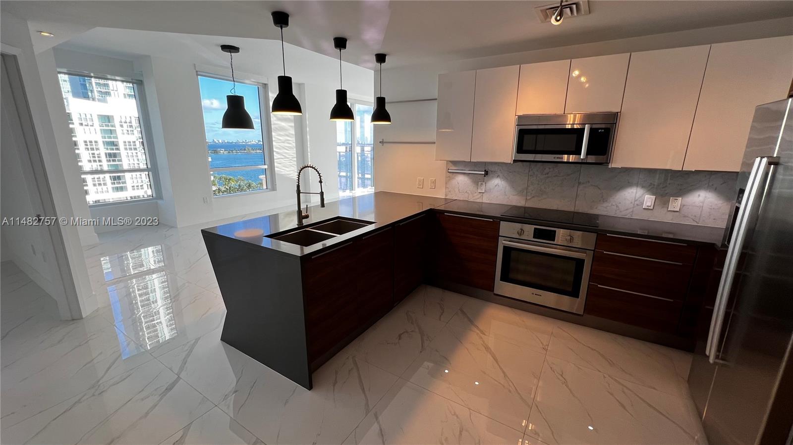 Beautiful waterfront boutique building. Apartment features floor to ceiling windows with majestic water views of Biscayne Bay, brand new porcelain floor & new mater bath. Contemporary Italian kitchen cabinetry, quartz counter tops, Bosch stainless steel appliances. Amenities includes pool deck, landscaped promenade, sundeck, hot tub, outdoor/indoor mini-theater, cyber cafe, lounge, BBQ area, a business center, state-of-the-art fitness center yoga room 2 parking spaces, High-tech controlled security access throughout the public and common areas.