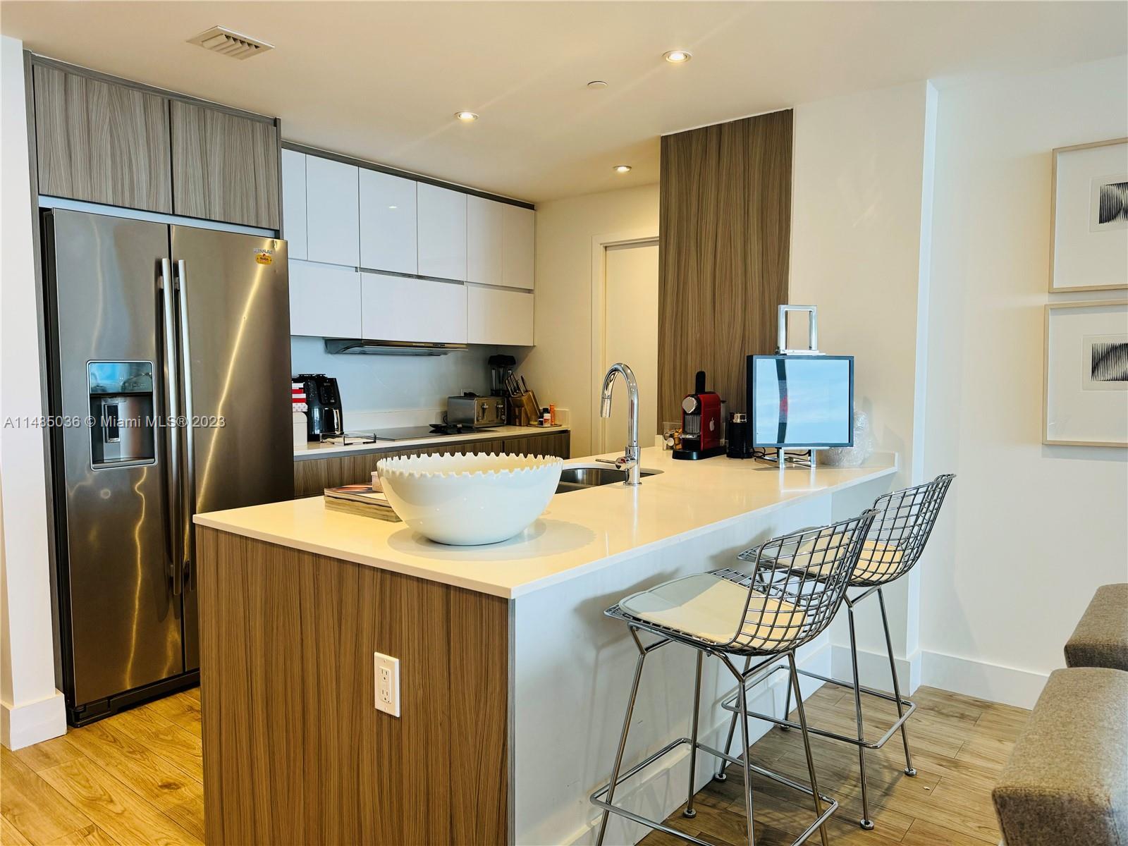 Introducing a stunning 3-bed residence in Bay House, East Edgewater. Captivating Biscayne Bay views greet you in the living room and primary bedroom, while guest rooms provide beautiful sunset scenes. A private 7-foot terrace offers outdoor relaxation with panoramic bay views. High ceilings and abundant natural light create a spacious feel. The kitchen boasts Italian cabinetry, stone countertops, and top-tier appliances and comes with two parking spaces. Amenities include an infinity pool, summer kitchen, day beds, outdoor lounge, kids play area, yoga room, and fitness center. Only 160 units and semi-private elevator. Close to the Design District, Brickell, and Miami Beach. Immerse yourself in the vibrant dining scene, boutique shops, and cultural offerings of the area.