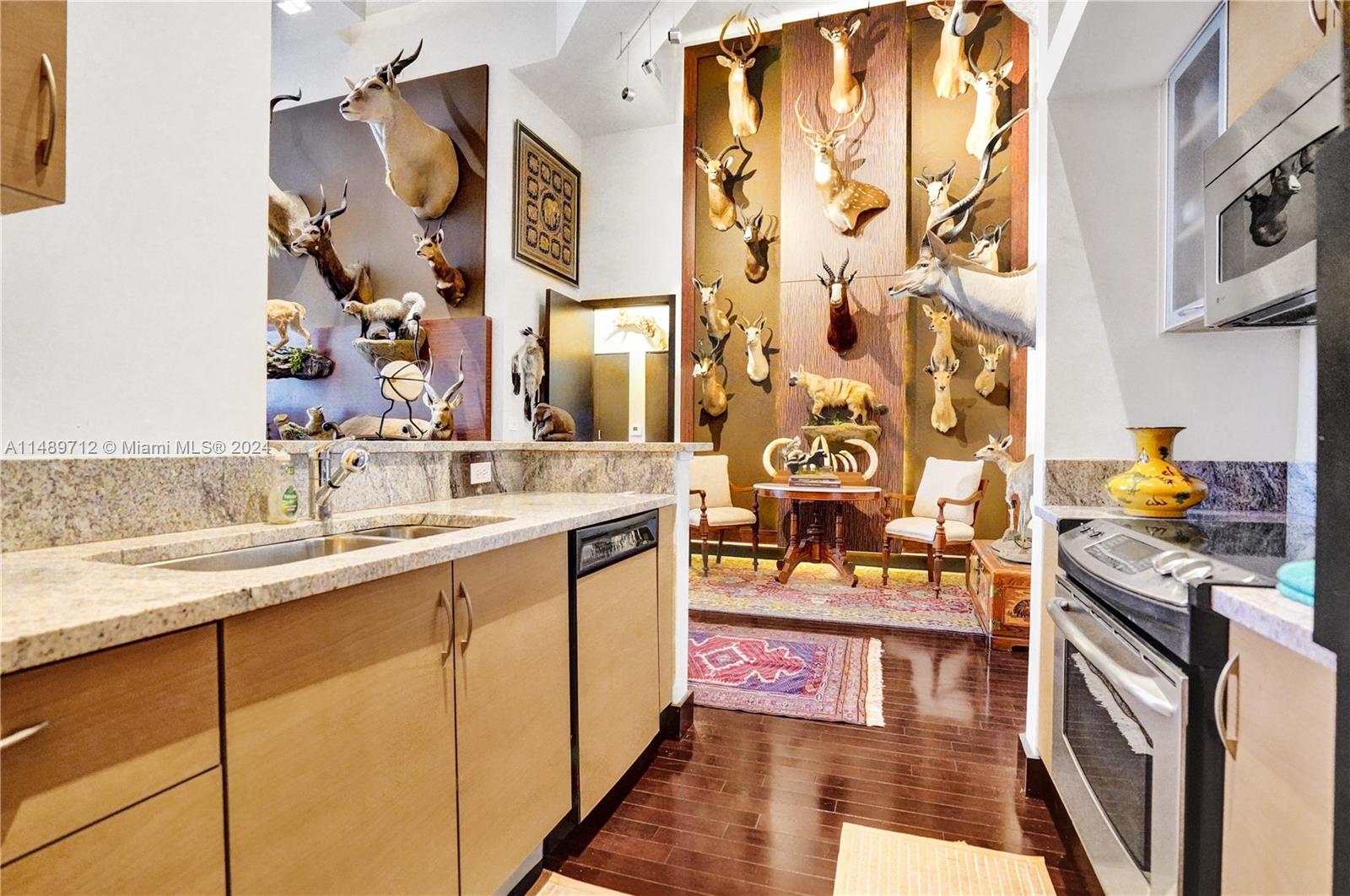 RARE OPPORTUNITY to own a first floor 2/2 with 20-foot high ceilings offering a direct view to the pool. There is ONLY ONE high ceiling 2/2 unit with DIRECT view to the pool in the building. Listed at $540,500 WITHOUT the furniture & animal mounts or at $780,000 with everything included. Taxidermy and furniture can be removed before closing. Hardwood floors, closet and doors. RARELY available too: Two covered parking spaces & two large storage spaces come with this unit. Boutique building, 24/7 concierge, pools, party room, cinema theater, business center. Located in the heart of Aventura, close to shops, restaurants, grocery store, houses of worship, Aventura Mall, the beach. No recreational showings.