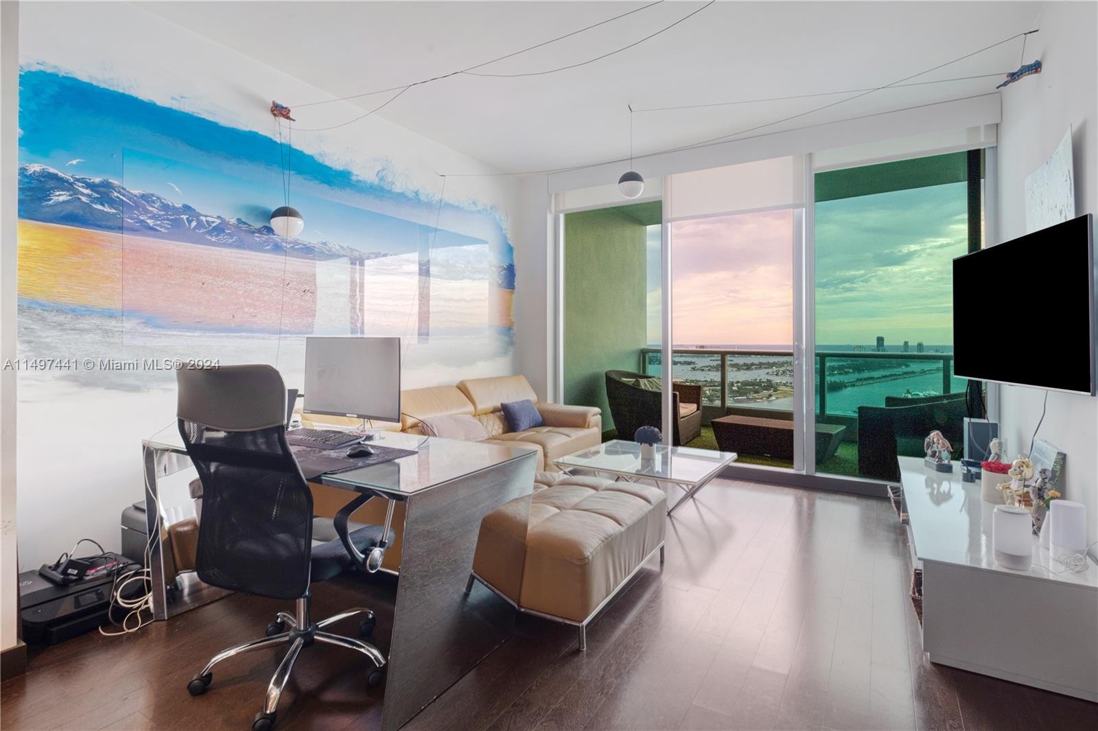 900 Biscayne Bay is a 63-story condo building in Downtown. It includes 516 units + retail/office spaces. Walking distance to Kaseya Center, Frost and Perez Art Museum, Adrienne Arsht Center, Bayside and Miami Worldcenter shops. Near Maurice A. Ferre Park, it's ideal for leisure and dolphin watching. A must-see unit owned by an art enthusiast, offers 1 Bed + den with a Murphy bed, two bathrooms, and a spacious balcony with panoramic views. Kitchen includes Miele appliances, marble countertops and wine rack. FURNITURE included. Amenities- two pools, hot tub, gyms, spa, saunas, steam rooms, movie theater, BBQ area, clubroom with piano, concierge, valet parking, kids' playroom, restaurants, a nail salon, an eye doctor, and a nutrition store.