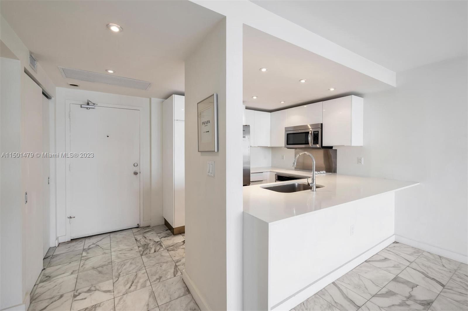Bright & beautiful renovated 1 bed/1 bath. This unit with unobstructed city skyline views is located in a quiet oceanfront building in South of Fifth. With open kitchen, quartz countertops, stainless steel appliances, marble floors, impact windows and door, large walk-in closet and extra close that is perfect for a washer/dryer (nowadays, building allows owners to install if desire). 40 year recertification is completed. The Building just installed new elevators, finished pool deck, and more improvements are in progress. Low maintenance fee, 24Hrs security, cable, internet, etc. pool, deck and private ocean entrance. Ideal South of Fifth - South Beach location. Walk to the finest restaurants, clubs, beaches and shops that South Beach has to offer - Right over Ocean Drive.