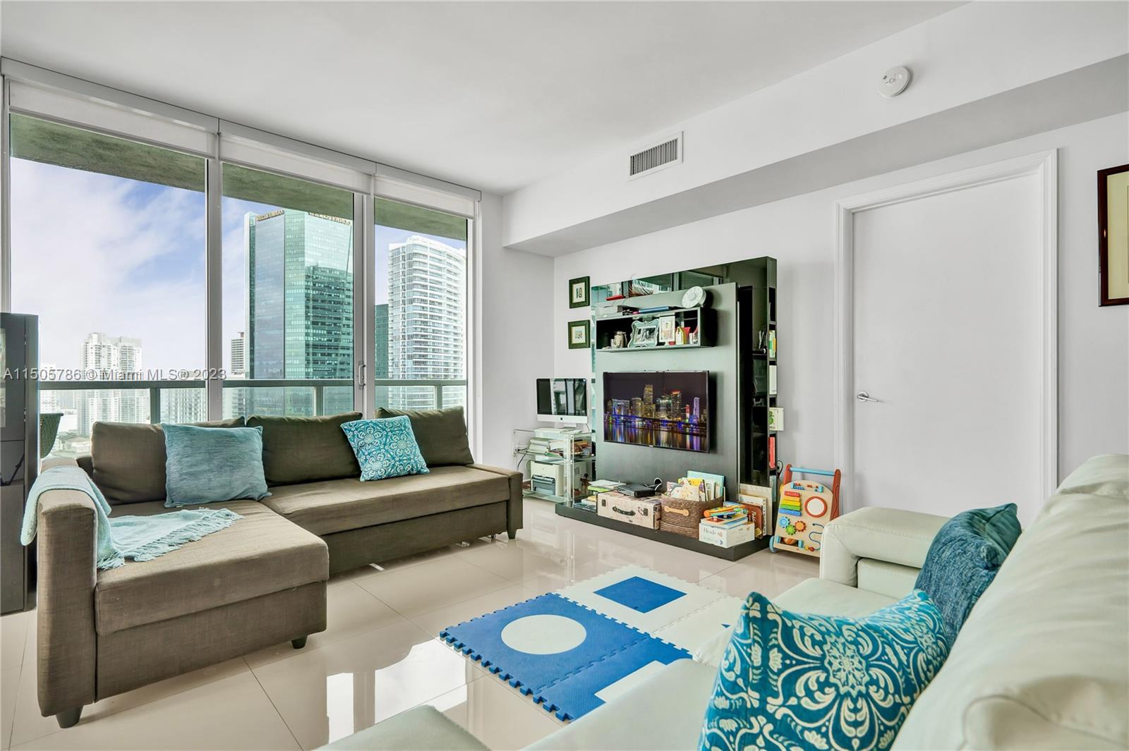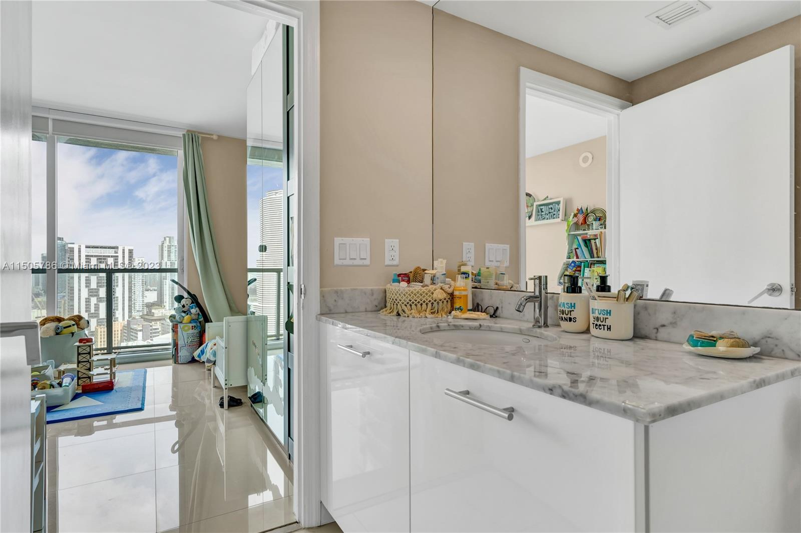 Excellent location in Brickell. Corner unit with river and bay views in the sought-after 500 Brickell West tower. Best split floor plan, 2 MASTER BEDROOMS with en-suite bathrooms, double height ceilings, porcelain flooring throughout, large kitchen with quartz countertops & stainless steel appliances, roller shades on all windows, jacuzzi tub & separate glass-enclosed shower, walk-in closets. Includes 1 assigned parking space. Building amenities include 42nd-floor rooftop pool & sundeck, 11th-floor infinity pool & poolside cabanas, sauna & steam room, hot tub, club rooms, concierge, 24-hr valet, fitness center & more. Across the street from Brickell City Center, just a few blocks away from Downtown and next to a Metro Mover station. SHORT-TERM RENTALS ALLOWED 30 DAYS MIN, 12 TIMES PER YEAR