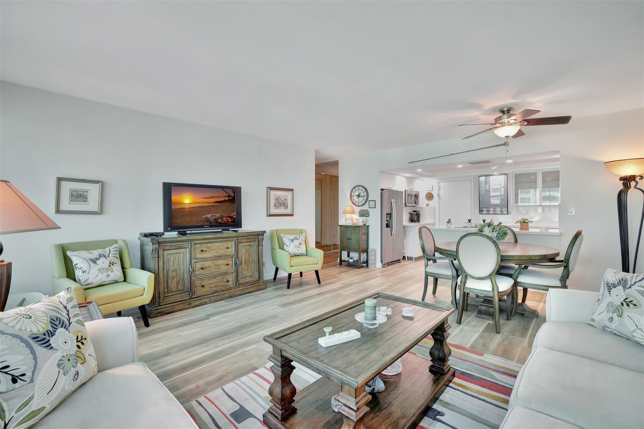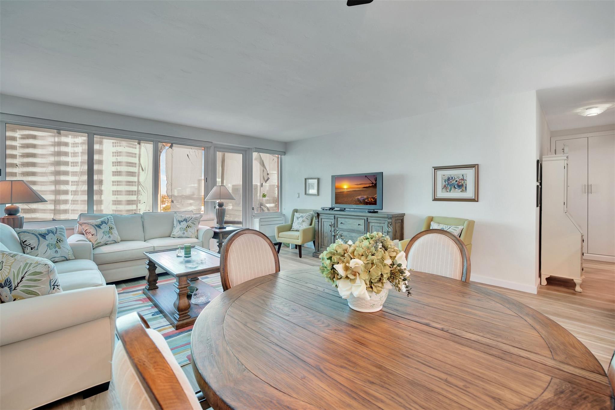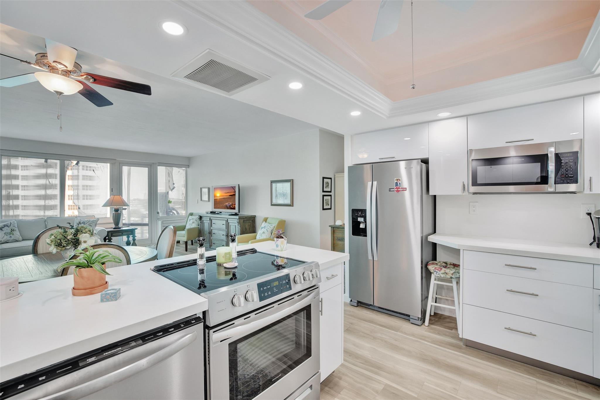 Step into this gorgeous fully renovated one bedroom, one bath and you will see why this is a very desireable stack. The views are spectacular from the intracoastal to the ocean. This unit has brand new open kitchen with quartz counter tops, stainless steel appliances, designed for easy entertaining. Custom floor to ceiling high quality closet cabinetry to maximize storage. This spacious move in ready unit offers an abundance of light throughout. The Building renovations include new paint, and glass balconies. Amentities include a heated swimming pool, bbq pavillion, a putting ground, a fitness center, library and community room. CRT offers 24 hour secuirty and management on site. A short walk will take you to our beautiful beach, fine dining, live entertainment/ shops. 55+community.