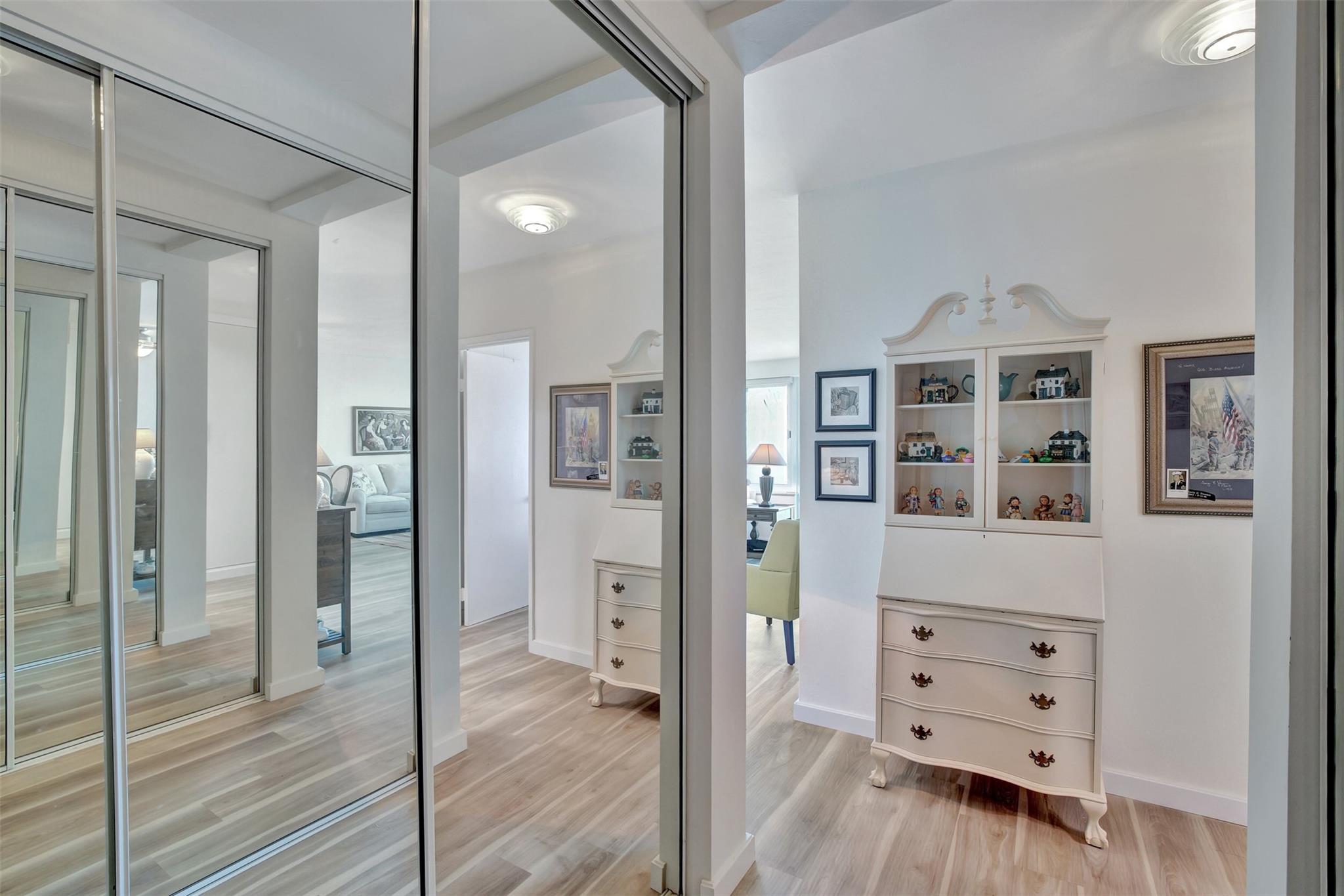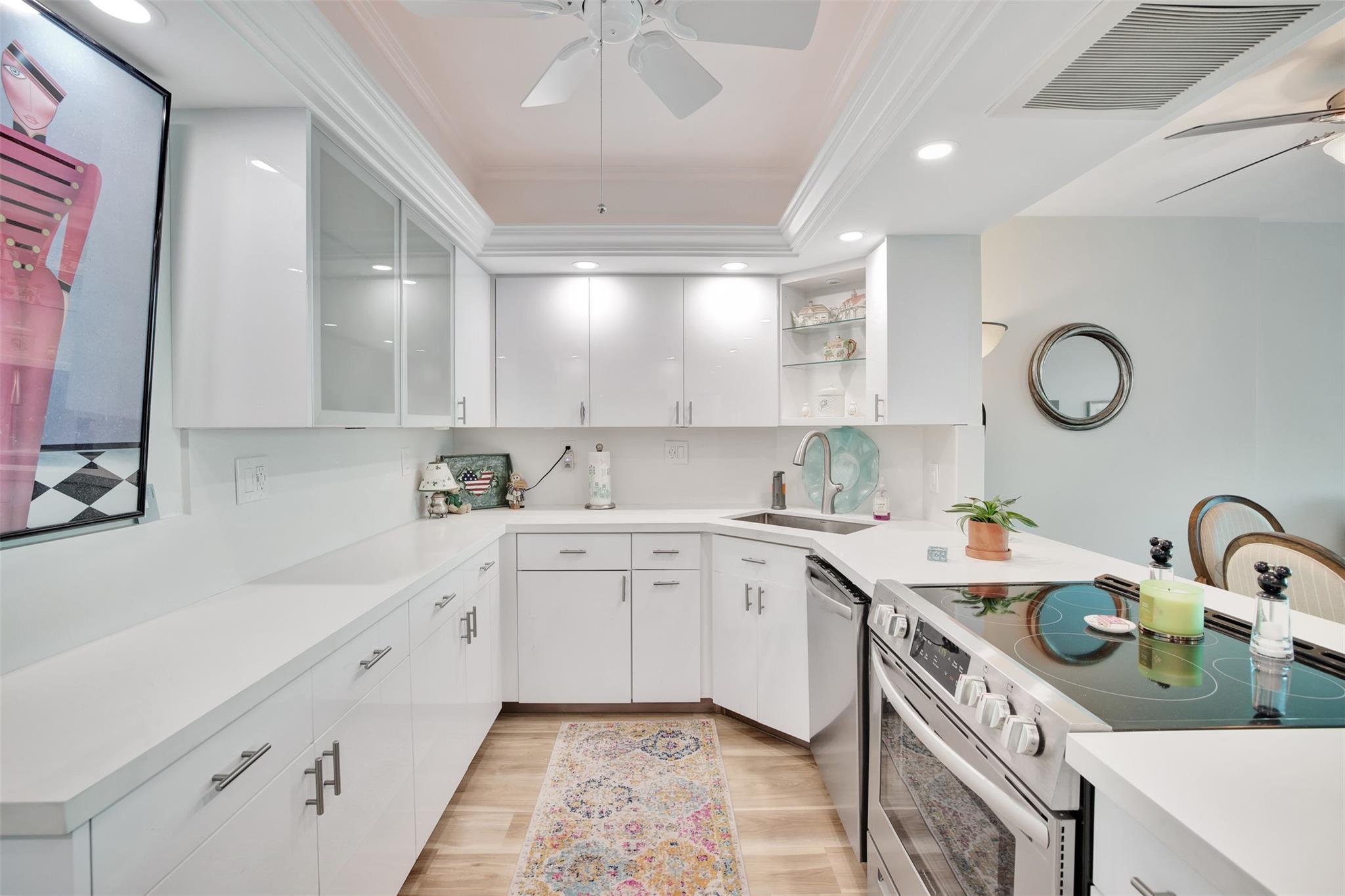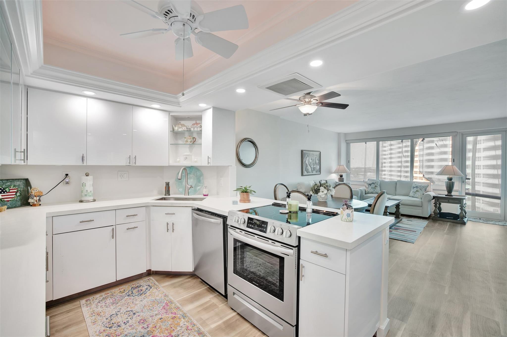 Step into this gorgeous fully renovated one bedroom, one bath and you will see why this is a very desireable stack. The views are spectacular from the intracoastal to the ocean. This unit has brand new open kitchen with quartz counter tops, stainless steel appliances, designed for easy entertaining. Custom floor to ceiling high quality closet cabinetry to maximize storage. This spacious move in ready unit offers an abundance of light throughout. The Building renovations include new paint, and glass balconies. Amentities include a heated swimming pool, bbq pavillion, a putting ground, a fitness center, library and community room. CRT offers 24 hour secuirty and management on site. A short walk will take you to our beautiful beach, fine dining, live entertainment/ shops. 55+community.