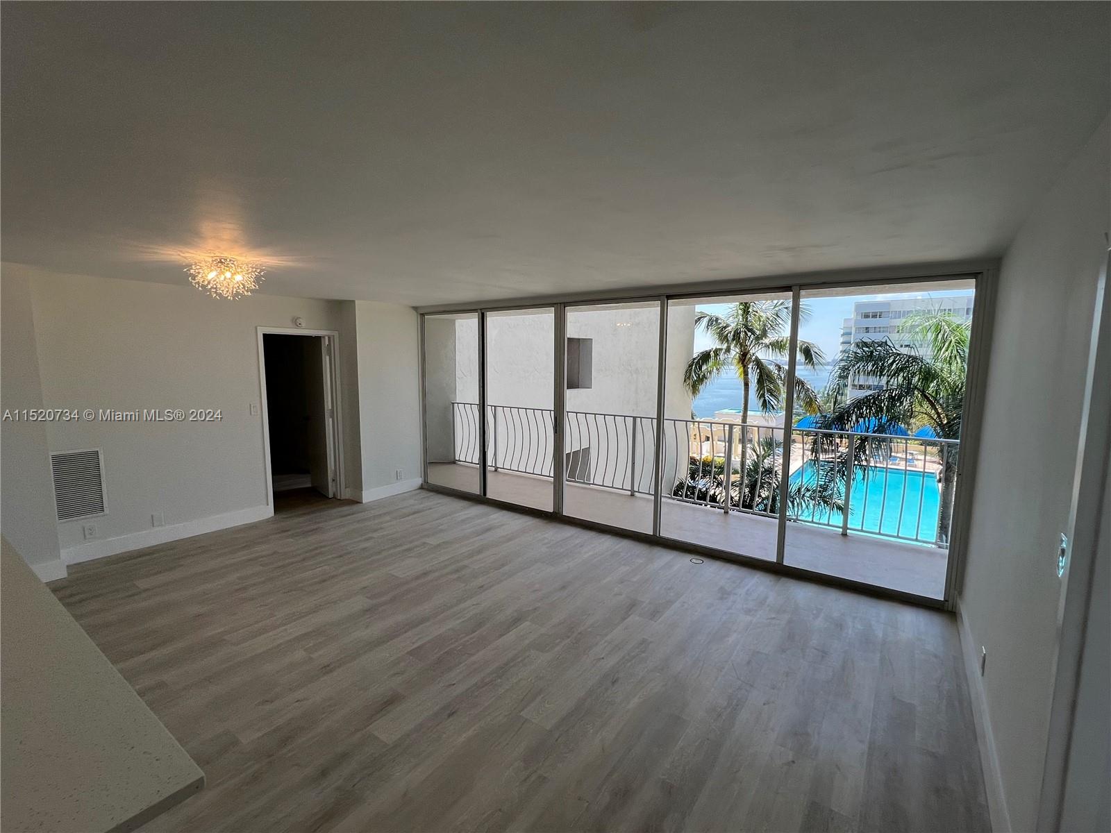 Beautifully remodeled 2bed/2bath unit with water views overlooking renovated swimming pool & tropical terrace area. All work was done with permits. New modern kitchen, bathrooms, flooring & lighting. Open split floor plan. Extra-large balcony. New A/C installed in 2024. One deeded covered garage parking spot. Additional parking can be purchased or leased. Security and management on site. Tenant in place until October 31, 2024. Current tenant pays $2,900/monthly. No Special Assessments. Management also says they have enough reserves to cover upcoming cost for 40 yr. recertification