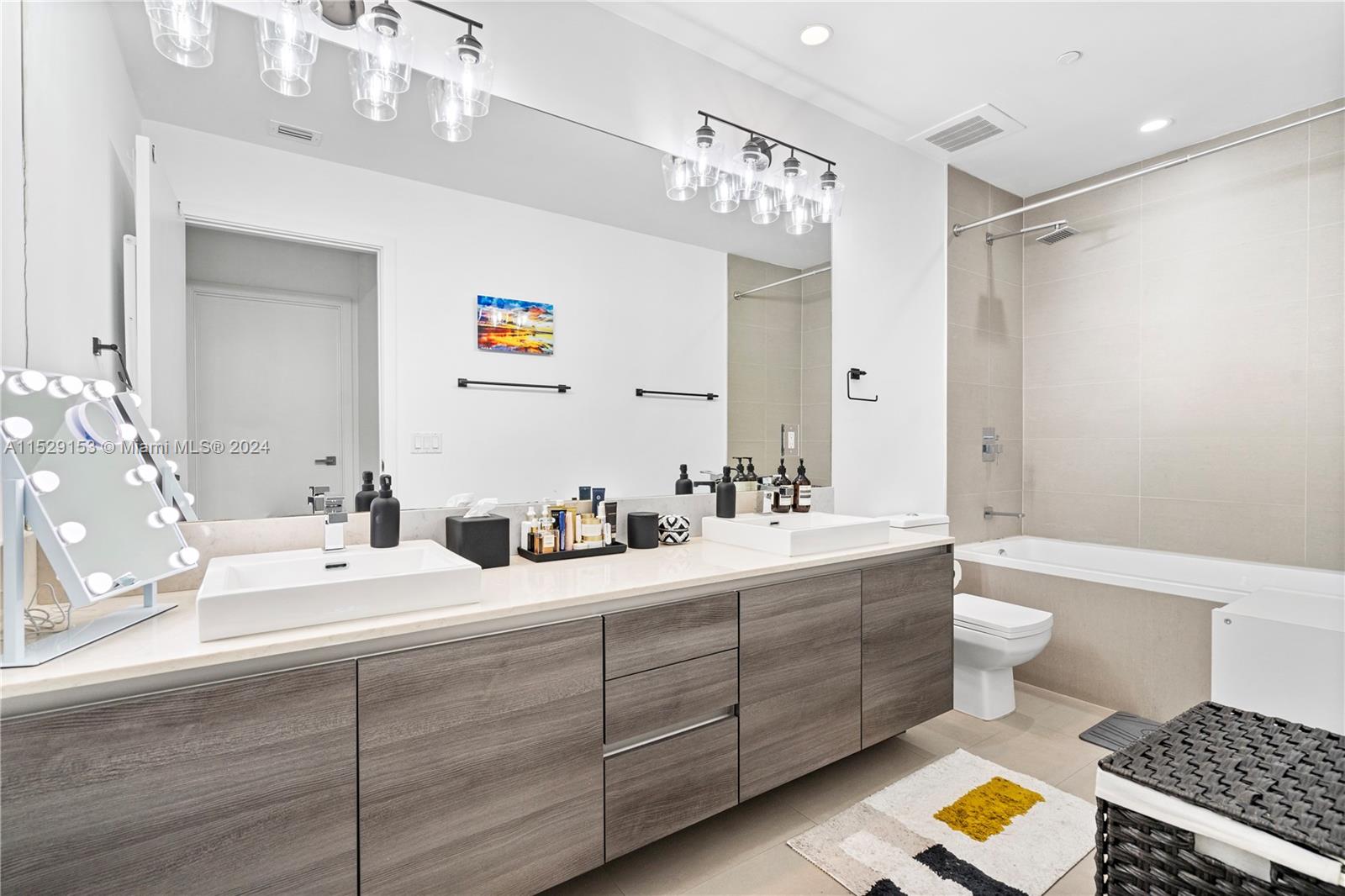 Immerse yourself in breathtaking views of Miami's skyline from this spacious 1-bed + Den / 1.5 bath unit at The Bond on Brickell. The largest and best-priced 1+ Den in the building, facing both bay and city views. Enjoy tasteful updates including new light fixtures, lime wash paint throughout, and updated bathroom + kitchen fixtures. Featuring floor-to-ceiling glass windows, Bosch appliances, and a spacious balcony this unit is the epitome of luxury living. Amenities include a sundeck, lap pool, fitness center, business center, children’s playroom, and The Parliament Lounge. Valet parking and concierge services complete the luxury living experience.