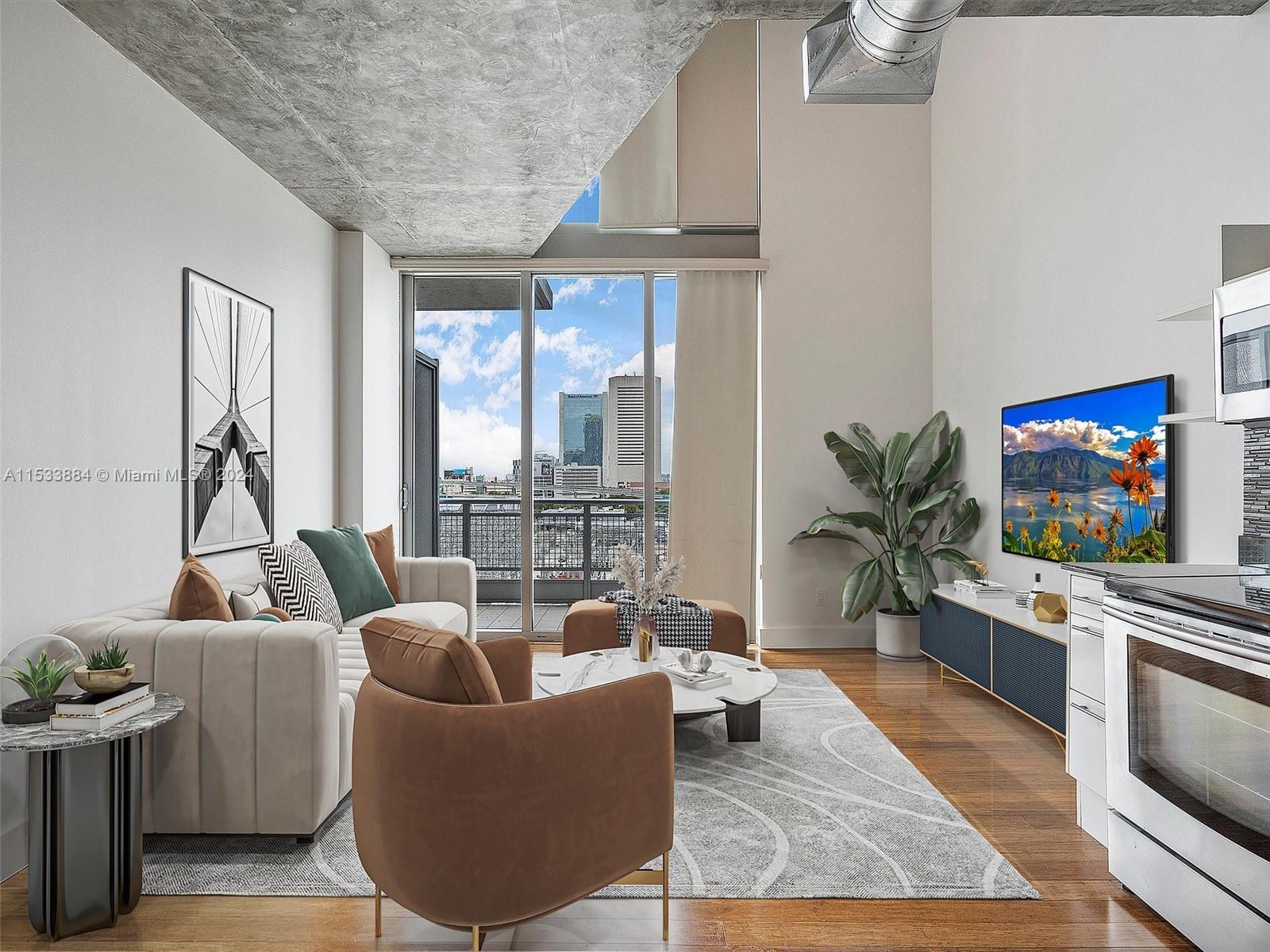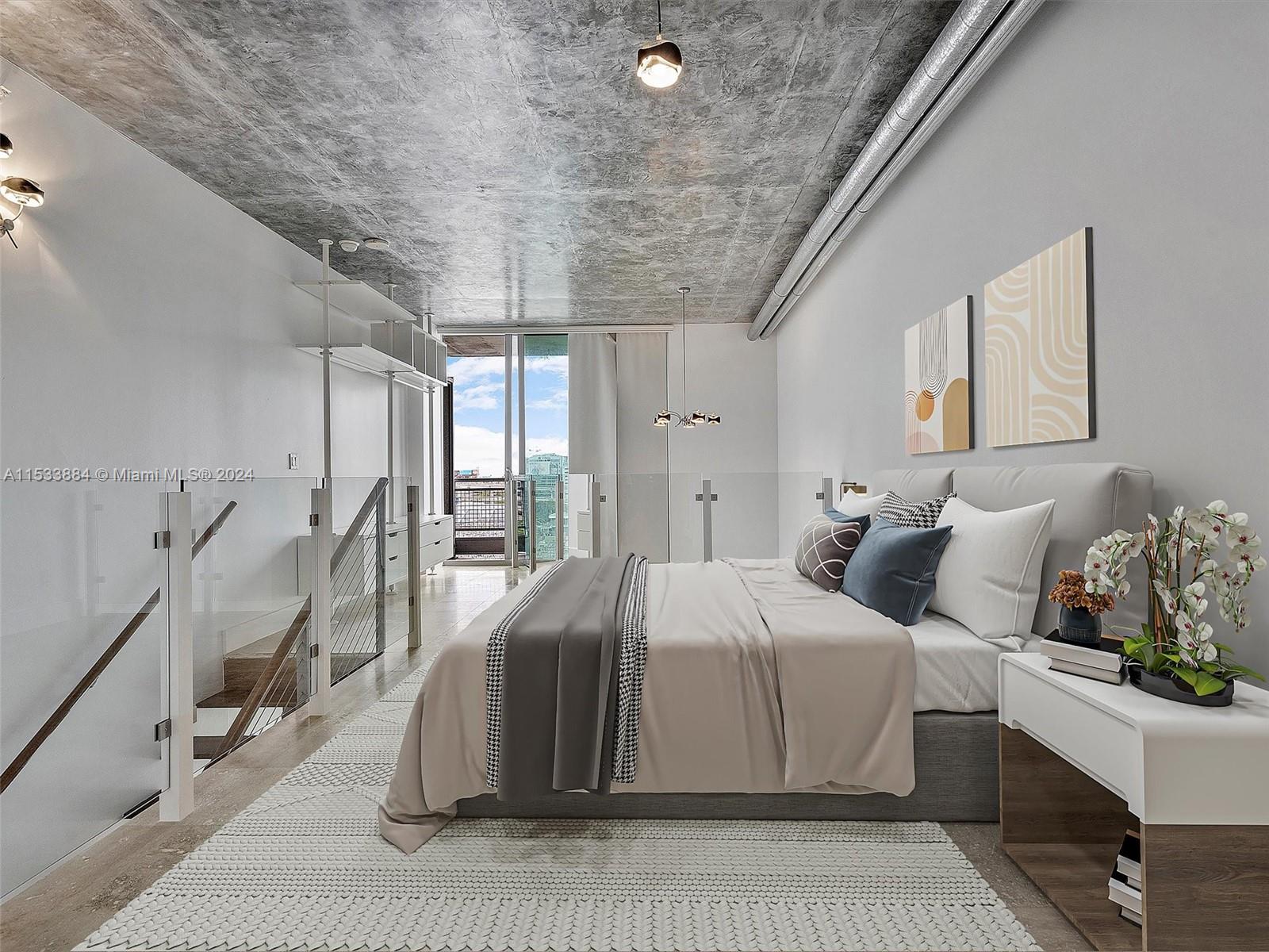 Amazing 2 story loft in the Neo Vertika building. This one-bedroom, open floor plan unit has an industrial-modern style with 2 balconies and great views of the Miami River. It features a spectacular floating staircase, 20-foot ceilings, bamboo flooring, and floor to ceiling windows. Upstairs you will find a king-size bedroom surrounded by glass partition walls, a full bath and balcony. The unit has been freshly painted. There is an assigned parking space in garage. The Neo Vertika complex has 24-hour front desk security and a valet parking service. The amenities are endless. Step outside of your apartment and into the pools, hot tubs, fitness center, dog park, racquetball court and more.