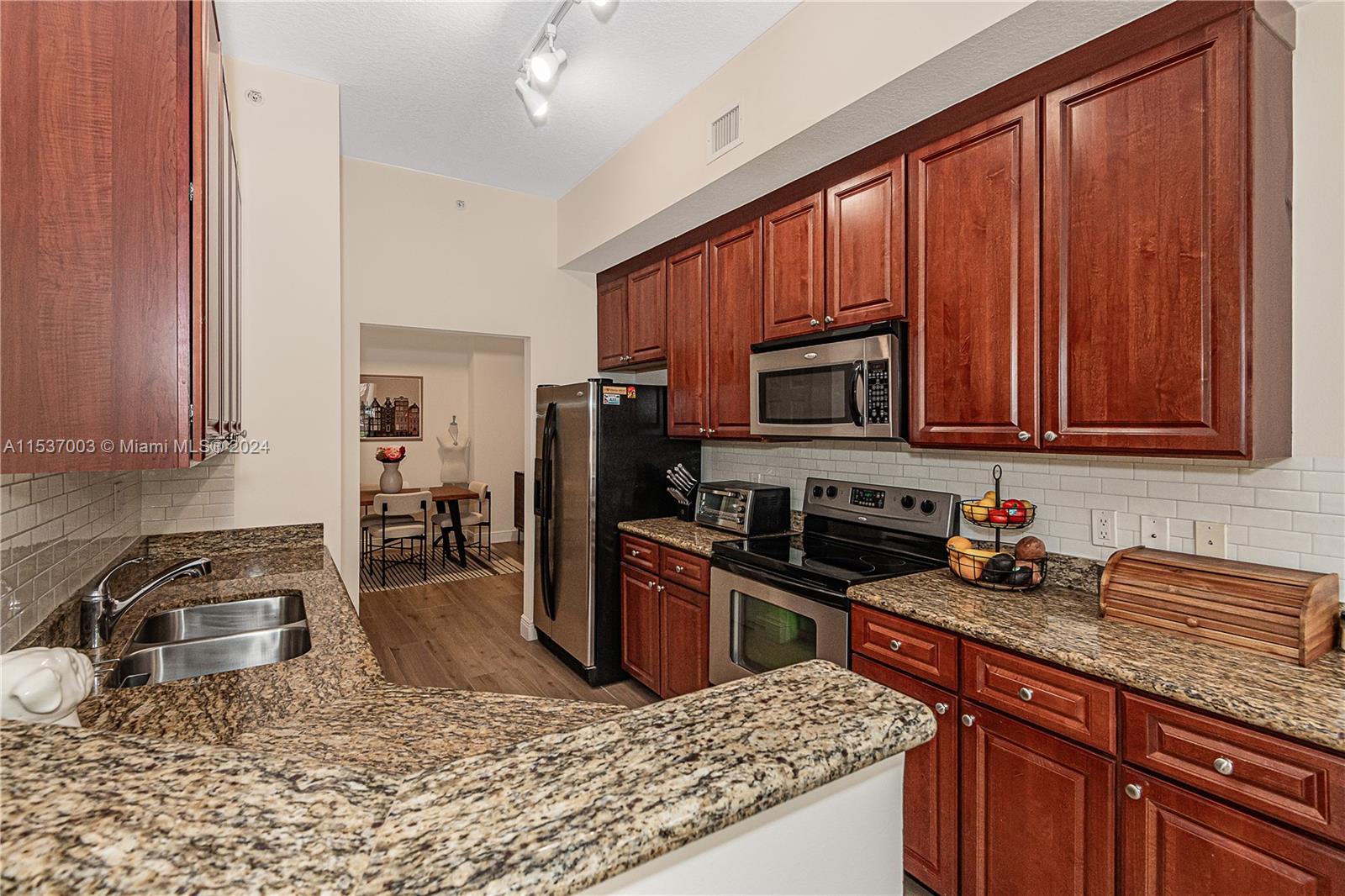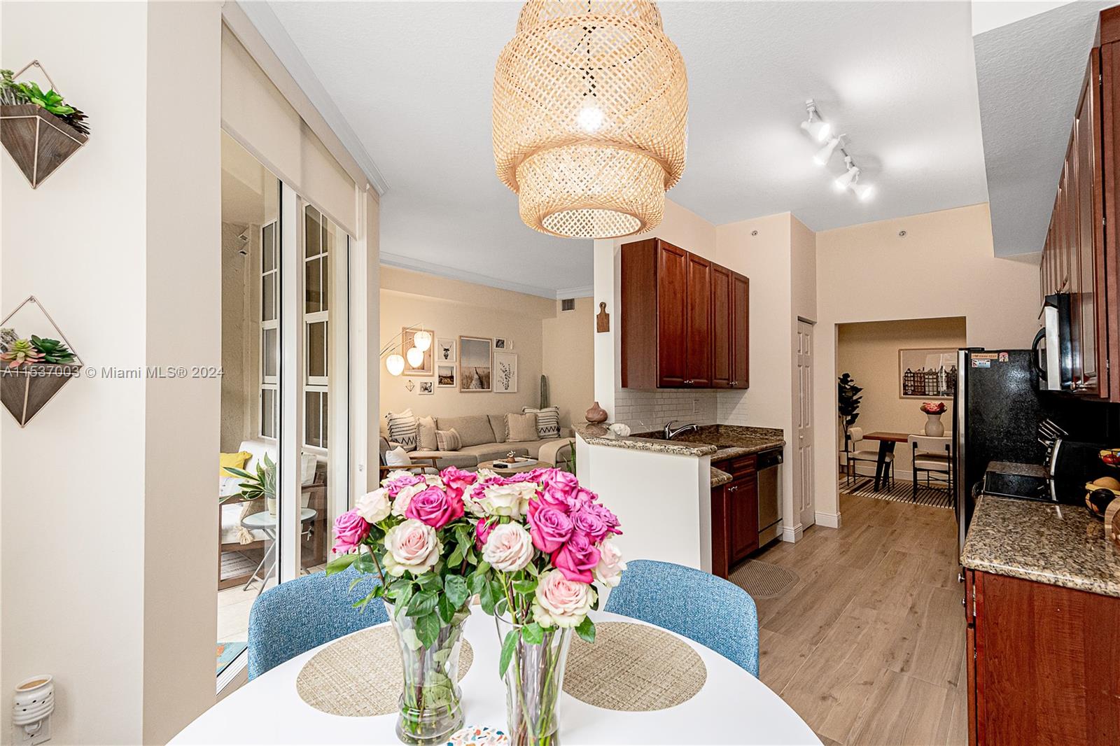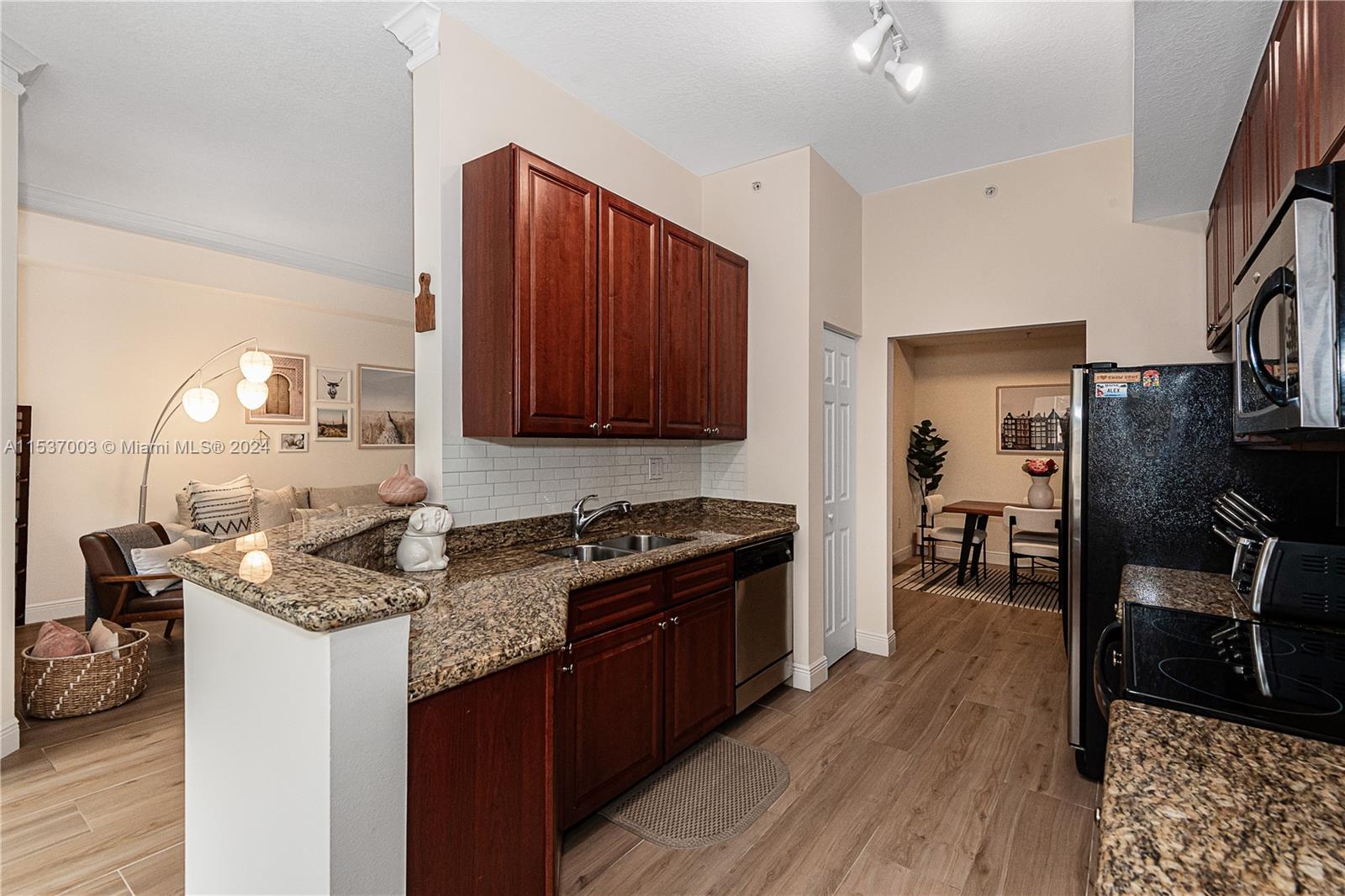 Stunning 1 bedroom, 1 1/2 bathroom residence, remodeled with 10' high ceilings overlooking the pool area. This is the largest one bedroom unit in the building with no neighbors on either side, and two large walk-in closets. Open kitchen with granite counter, stainless steel appliances, new A/C, and washer-dryer inside of the unit. Alaqua is a gated community just minutes away from the Aventura Mall and the beaches. The building offers a state-of-the-art fitness center, hot tub, pool, playground, business center, 24-hour security and more! ASSOCIATION REQUIRES ALL BUYERS TO HAVE MIN 690 CREDIT SCORE