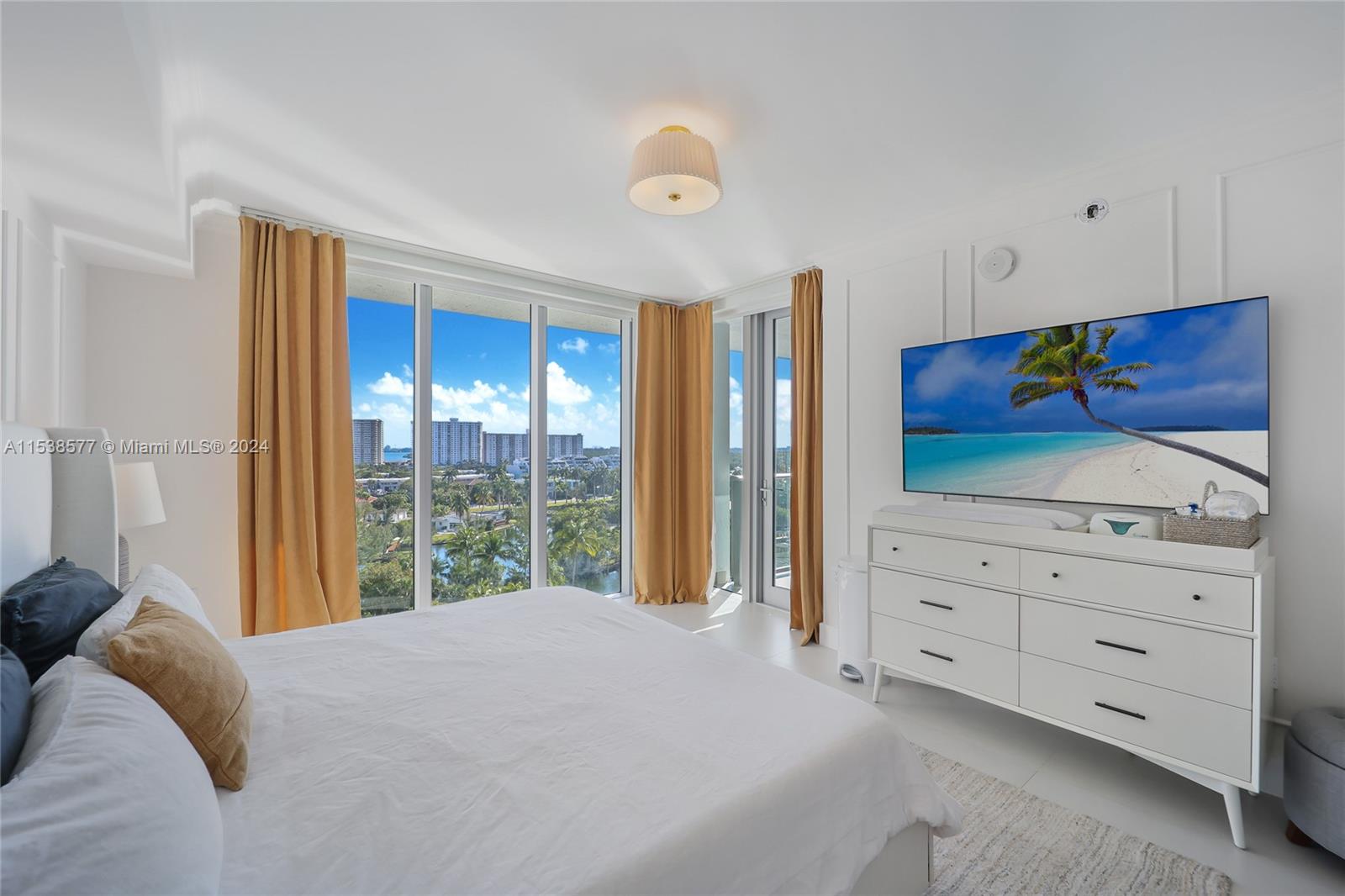 3 Bed, 3.5 Bath Condo in Parque Towers. This stunning residence is a masterpiece of design and comfort, offering breathtaking views of the water and an array of sophisticated finishes. The apartment features crown moldings and wall molding designs. Guest Bathroom redesigned with beautiful wallpapers, a chic mirror, and elegant new lighting. Enjoy blackouts and curtains in each room, with the living room curtains operated by a remote control. The living room boasts a custom bar and wine cooler. The ceilings have been refined to remove knockdown finishes, presenting a smooth, modern aesthetic. Master bathroom features elegant wallpapers, built-in speakers, and a built-in TV within the mirror, blending luxury with relaxation. A fully equipped laundry room. Panoramic Water Views.