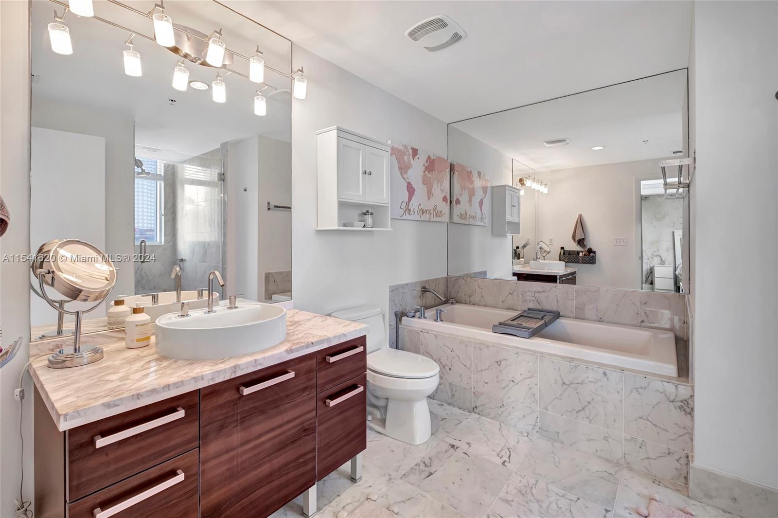 Welcome to one of the most unique floor plans in all of Downtown Miami . It features one large bedroom and a den that is currently being used as a bedroom but can also be perfect for an office. The master bedroom has blackout shades, a view of Biscayne bay and the city, a master bathroom with a soaking tub and a shower with a view. The main room features an open floor plan with blackout/thermal curtains. Vizcayne is a luxury building with a high end gym (heavy free weights and classes), 4 pools, clubhouse, cinema, office space perfect for remote work, and a private storage unit. Ideally situated right in front of Bayfront park in a Downtown area bustling with development you are close to everything Miami has to offer. Can be sold furnished. 30 day + rentals are allowed. Reach out today.