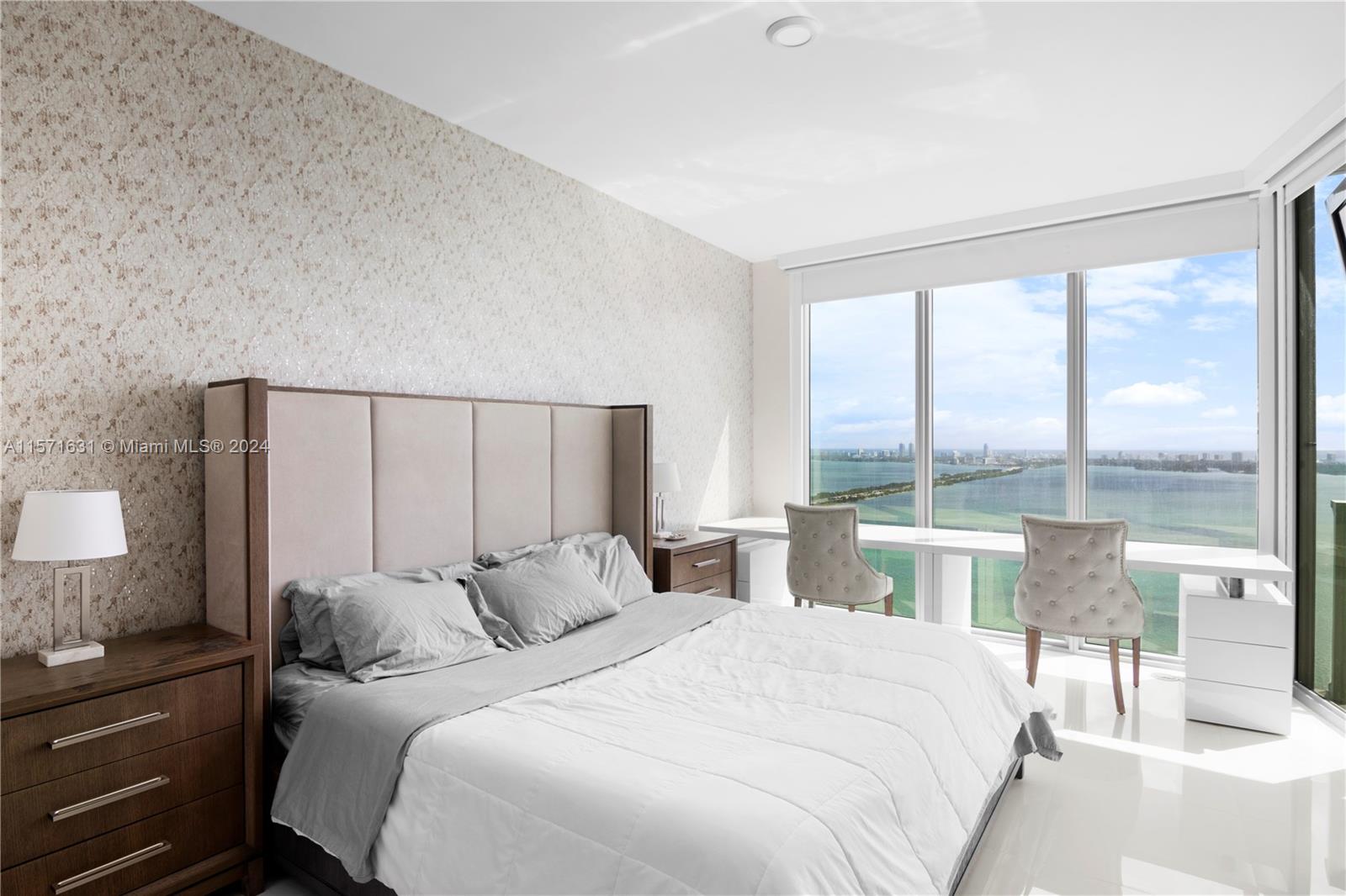 Fully furnished 2 bedroom, 3 bathroom residence with stunning 41st floor, direct bay and ocean views. Floor-to-ceiling windows, balcony access direct water views from every room in this thoughtfully designed split-bedroom layout. Top-of-the-line appliances, wood cabinetry, motorized solar blackout shades, designer closets, private elevator foyer an extra deep balcony with space for outdoor dining. 2 parking spaces conveniently located on the 1st 3rd floors. Private storage locker. Biscayne Beach is a luxury, waterfront condominium in Edgewater with resort style amenities like a fitness floor, beach club, sand volleyball courts cabanas, multiple pools, private indoor outdoor entertaining areas, tennis courts, spa more. Steps away from the Design District, Wynwood Midtown.