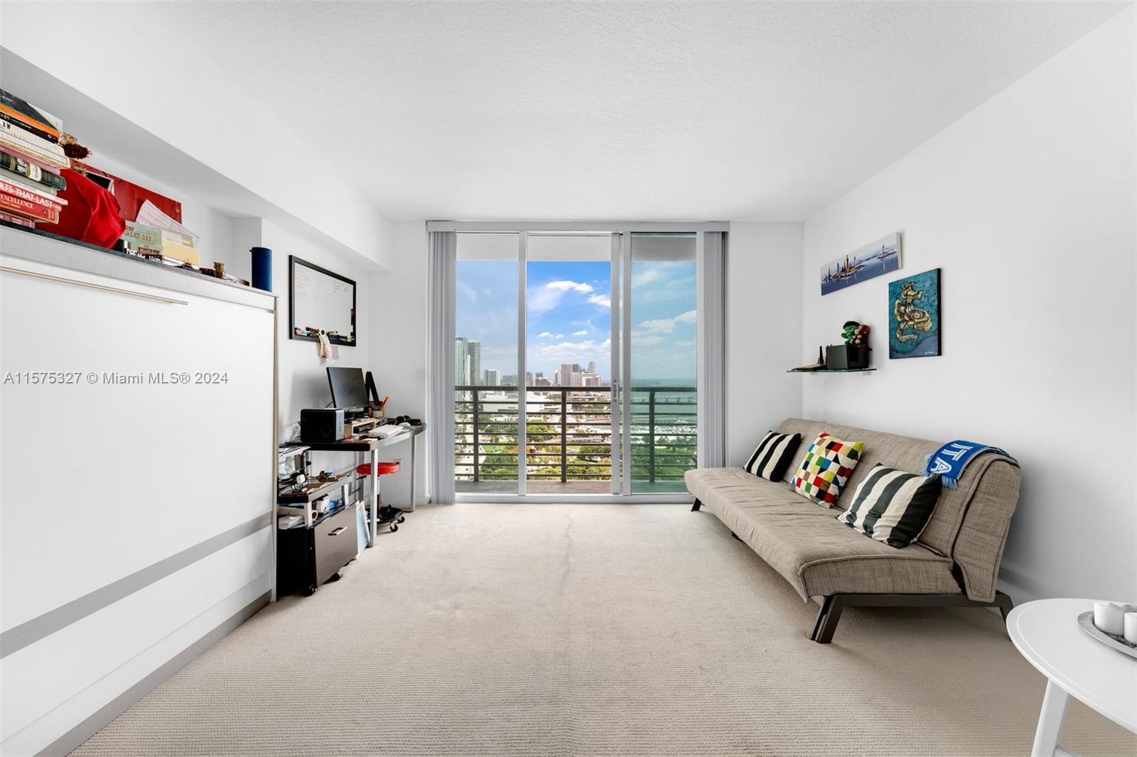 A beautiful studio at One Miami West with 507 interior square feet, a balcony, granite countertops, stainless steel kitchen appliances, in-unit washer/dryer, walk-in closet, and floor-to-ceiling glass windows with a breathtaking view of Biscayne Bay and the Downtown Miami skyline from the 33rd floor. Includes a large Murphy bed, mounted flatscreen TV, and one (1) assigned parking space. Amenities include two swimming pools, a hot tub, fitness center, valet parking, 24-hour concierge, and clubroom. There is a current special assessment. The quarterly payment is $245.88 for the next 6 years.