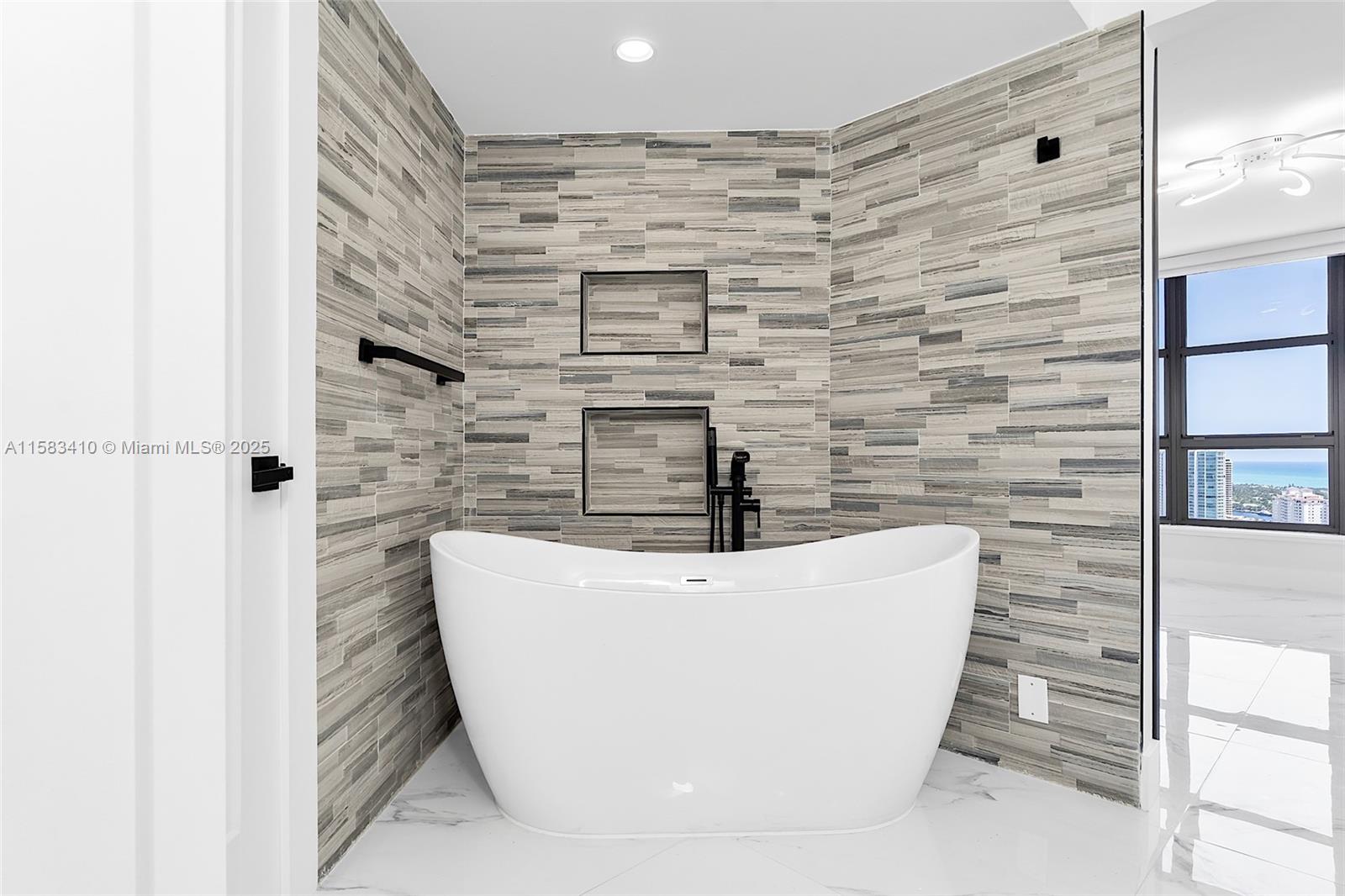 ONE OF A KIND. Completely remodeled 2 beds plus den and 2 full bathrooms.Enjoy the most beautiful and spectacular panoramic views of the ocean,Turnberry Golf course,skyline from this spacious apartment in the prestigious Mystic Pointe.Apartment features an exquisite open kitchen with new stainless steel appliances and wine-cooler. Unit features exquisite bathrooms, separate new washer and dryer in the unit. Entire home has tile throughout. Split floor with extensive wrap-around balcony with breathtaking views and shutter.Full building amenities including: Fitness center, heated pool,library,7 clay tennis courts,2 pickle ball courts,1 basketball court and dog park,mini market, beauty salon and restaurant. Mystic Pointe is a desirable and all-inclusive 24 hours gated community.