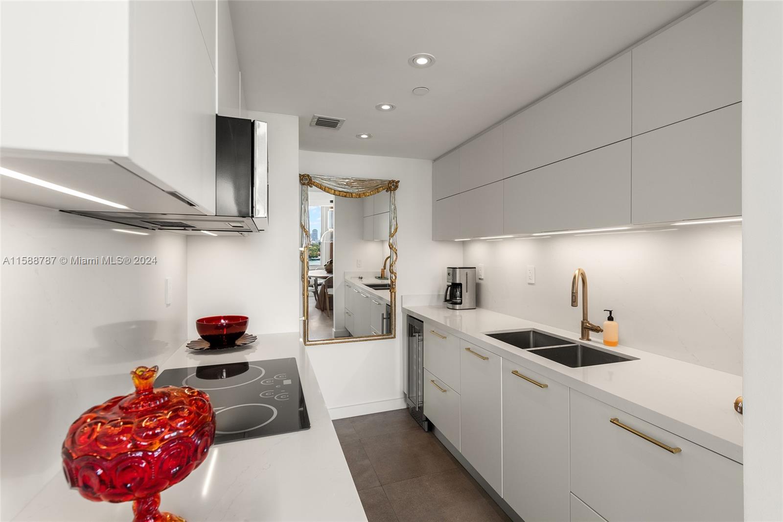 A stunning renovation with Bay and city views that are some of the best in Miami Beach. Tastefully designed and featured in Modern Luxury Interiors magazine, this light filled corner residence boasts timeless dark terrazzo tile floors, custom kitchen and baths, custom millwork and doors throughout. Impact windows/doors, custom blinds and integrated sound system complete this turn key unit. The Mirador is a full service building offering newly remodeled bay front pool and jacuzzi, lobby with front desk, valet and fitness center. The unit includes one deeded covered parking space. Special assessment has been fully paid by the seller and the association has reserves.