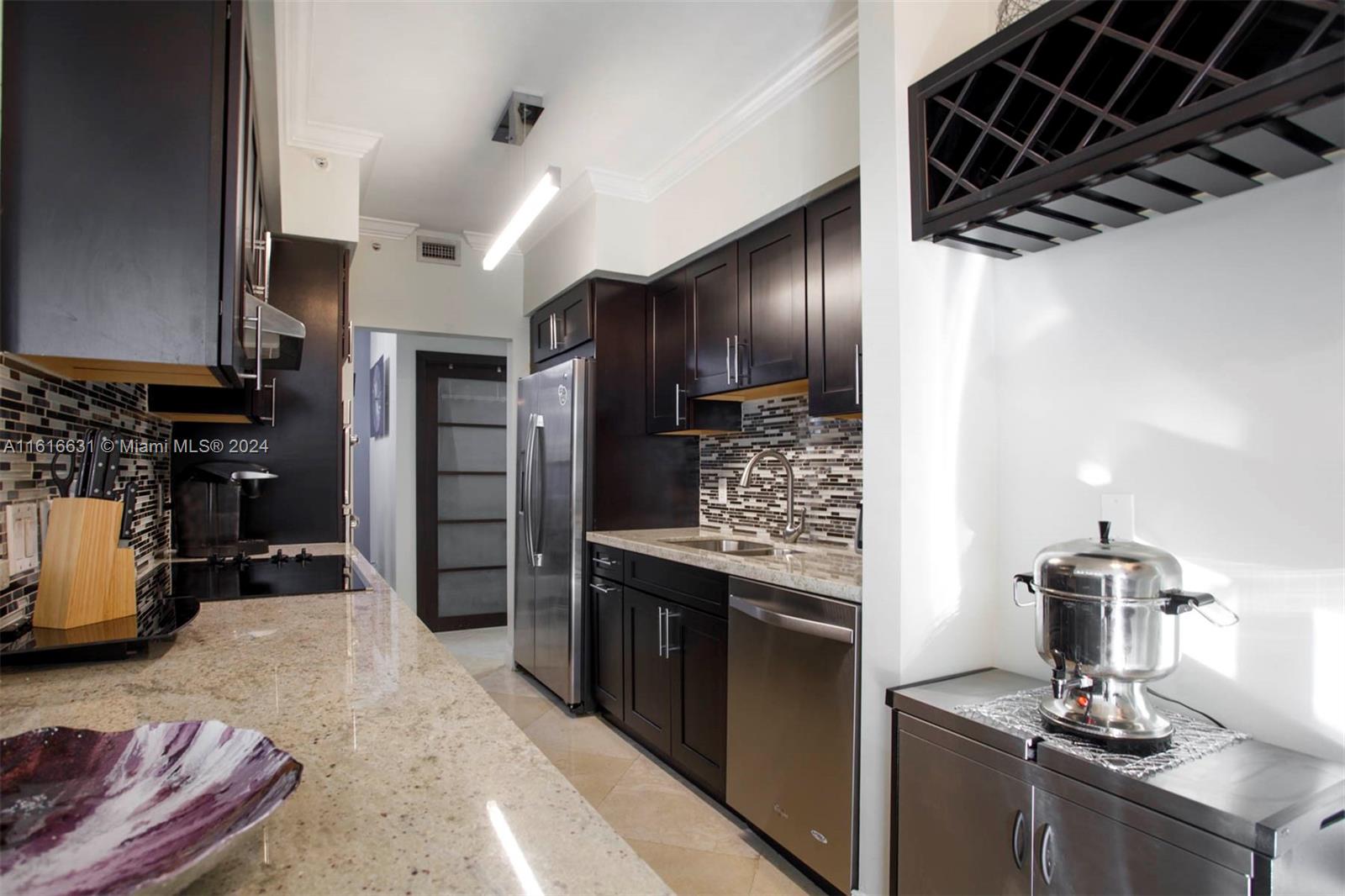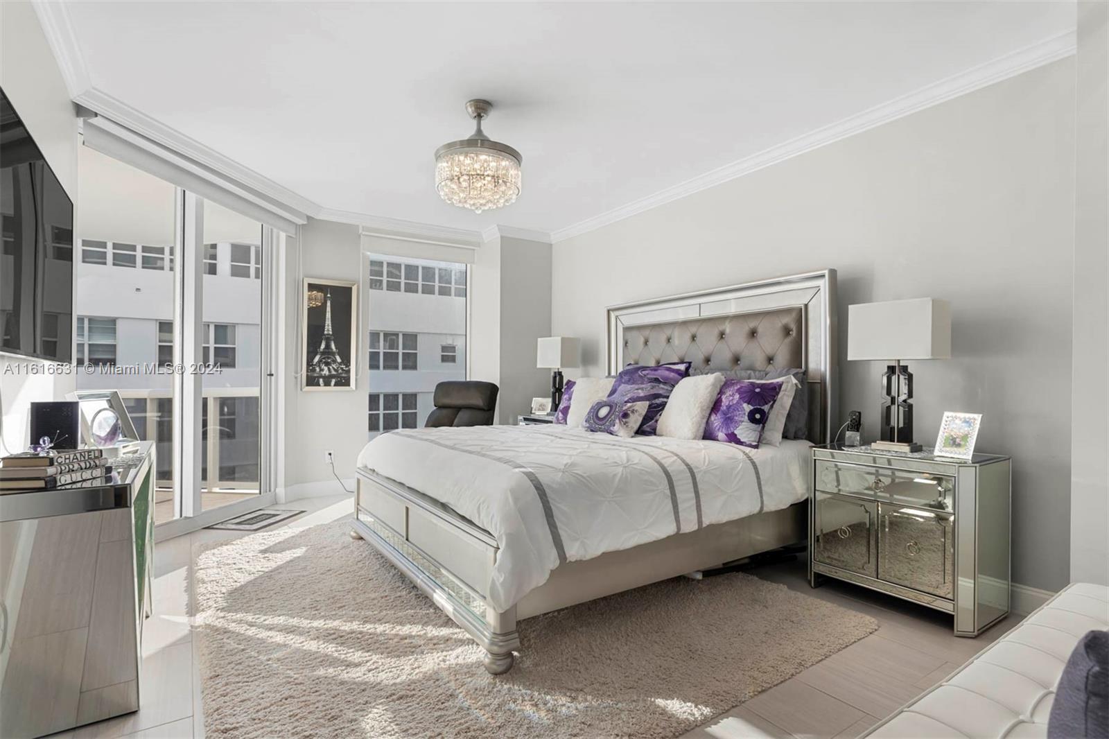 This stylish 2-bed, 2-bath unit features contemporary finishes throughout. The beautiful kitchen boasts stainless steel appliances, marble countertops, a wine cooler, custom wood cabinetry, and modern lighting fixtures. The entire unit has elegant marble floors. The main bedroom is en suite, with a spacious walk-in closet and a large bathroom that includes a Jacuzzi and separate shower. Both bedrooms have access to a large terrace with ocean and bay views. Situated in an oceanfront building in Miami Beach, this property offers excellent amenities.