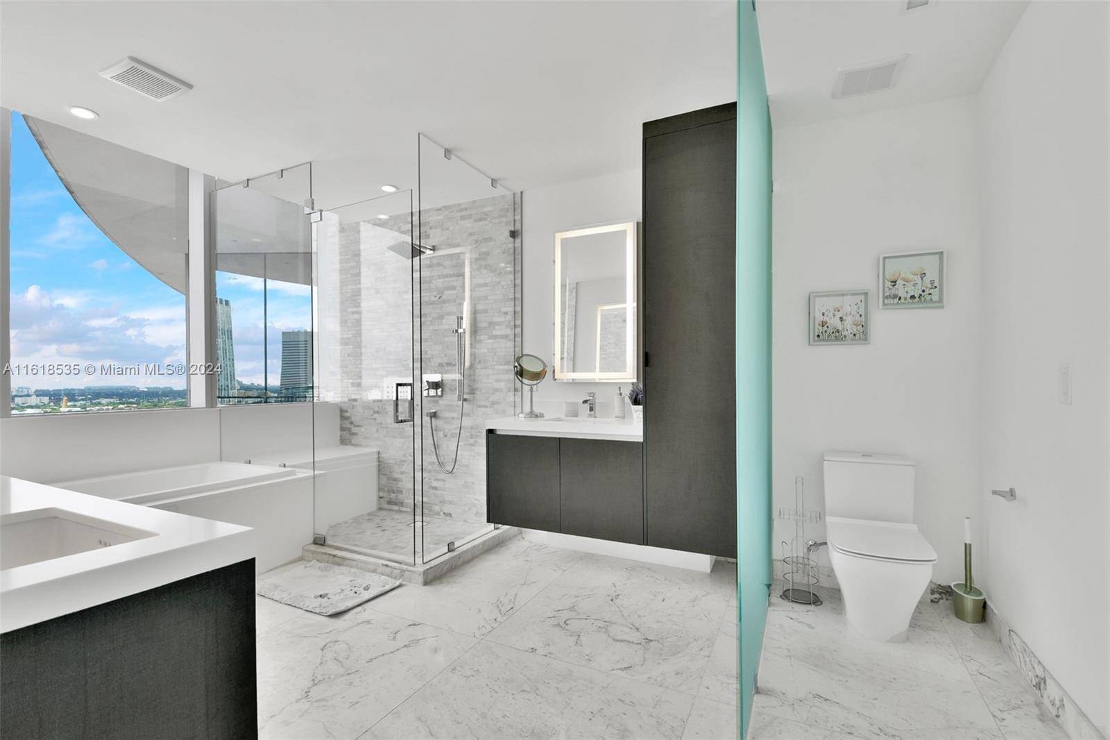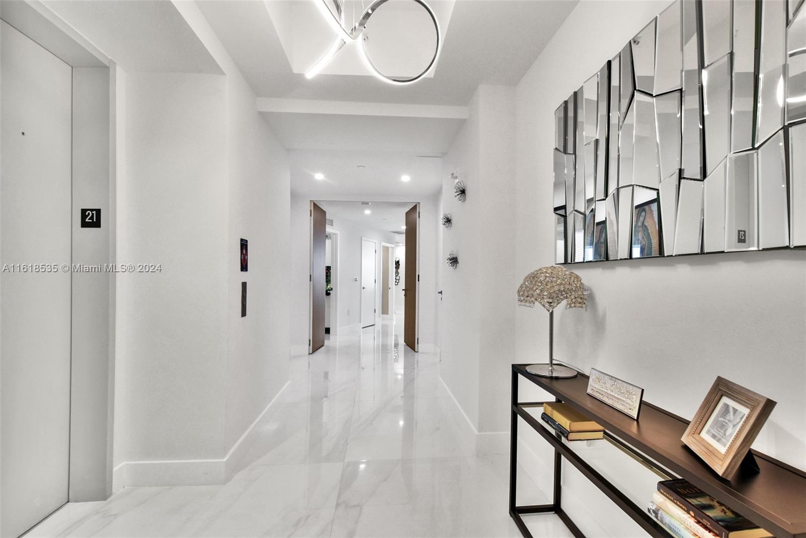 This exquisite unit features 3 bedrooms, 3 full bathrooms, and 1 powder room. Enjoy a private elevator with foyer, oversized terrace, private balcony in primary bedroom, over $300k in upgrades including a dining area with built-in glass wine cellar, custom wallpaper, electric blackout shades, recessed lighting, Italkraft kitchen cabinetry, custom wood panels, Bosch appliances, and a large kitchen island with stovetop and ample storage. Breathtaking views of the skyline and Biscayne Bay. Building amenities include multiple pools, fitness center, spa, tennis courts, soccer field, boxing studio, and game room. Located in the heart of Miami Worldcenter, surrounded by premier dining, shopping, and entertainment. 1 assigned parking space + the right to valet park a second vehicle complimentary.